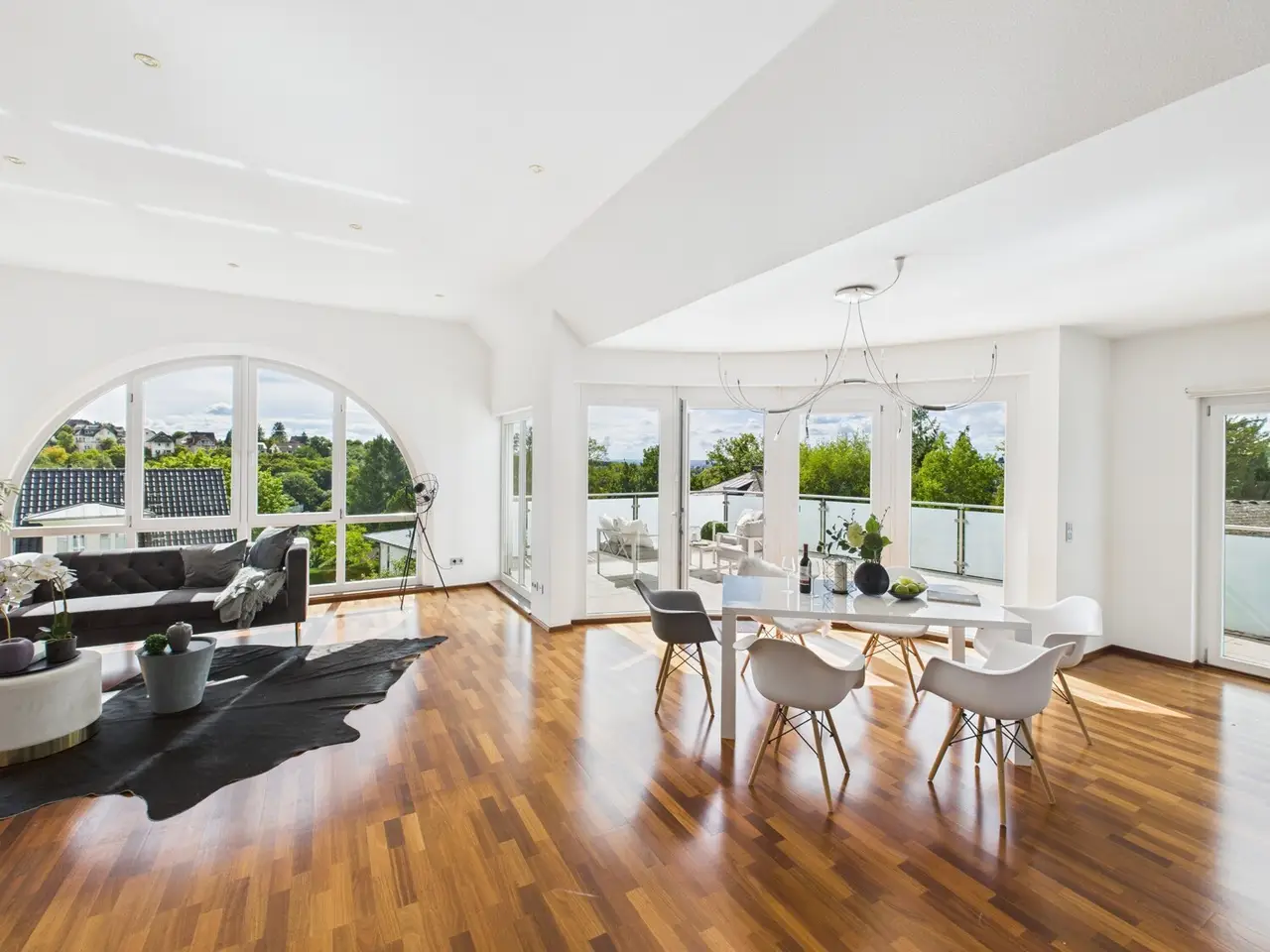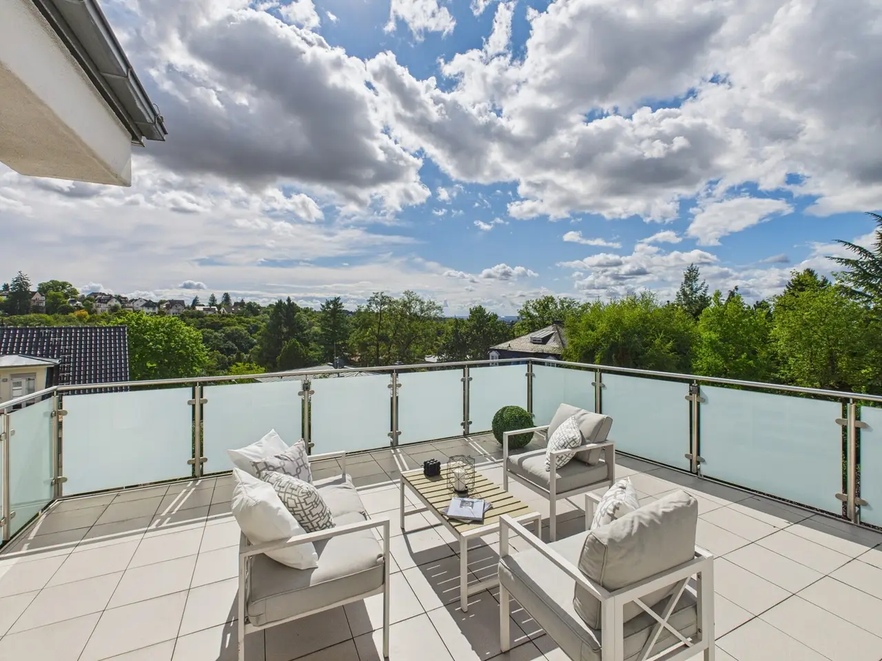 The penthouse maisonette for sale combines elegance and functionality on approx. 218 m² of living space in a sought-after Sonnenberg location. The apartment, built in 2005, is characterized by a tasteful maisonette layout and offers exceptional living comfort. The living level on the second floor can be easily reached directly by elevator and is greeted by a central hallway. There you will find practical built-in cupboards for your wardrobe and access to a room with en-suite bathroom, guest toilet and the spacious living area. The living area impresses with its spaciousness, openness and a remarkable view over the city of Wiesbaden to Mainz. The high-quality fitted kitchen offers all amenities and is optimally integrated into the room design. An adjacent utility room and a practical storage room offer you additional storage space. The almost completely wraparound roof terrace gives you many options and, with two larger, optimally aligned areas, offers the best conditions for enjoying the view and sun. These outdoor areas invite you to spend sunny days and relaxed evenings in the open air. The "more private" bedroom level is on the first floor and can be reached via a staircase within the apartment. This level also has an apartment entrance door and can also be reached by elevator via the communal staircase. In addition to the bedroom, the master area includes a dressing room, a spacious bathroom with bathtub and shower, and an upstream home office area, so that living and working can be harmoniously combined. A comprehensive modernization was last carried out in 2014, including a new gas central heating system in 2022, which meets modern energy standards. The apartment's furnishings are of the highest quality; exclusive features include parquet and granite floors, a bus system for intuitive control of the building technology, and integrated built-in cupboards in the dressing room and hallway, which provide sufficient storage space. All windows are equipped with shutters or blinds that allow individual shading. The apartment is located in a small, well-kept community of owners that guarantees privacy and a quiet living environment. The property includes a spacious single garage and a duplex parking space, which ensure comfortable parking. A separate basement room is also available. This property is perfect for singles, couples or small families who value spacious living and a quiet, yet central location. It combines modern construction with a practical layout and a high standard of comfort that meets the demands of modern life. Arrange a viewing appointment to see the quality and attractive living ambience for yourself.