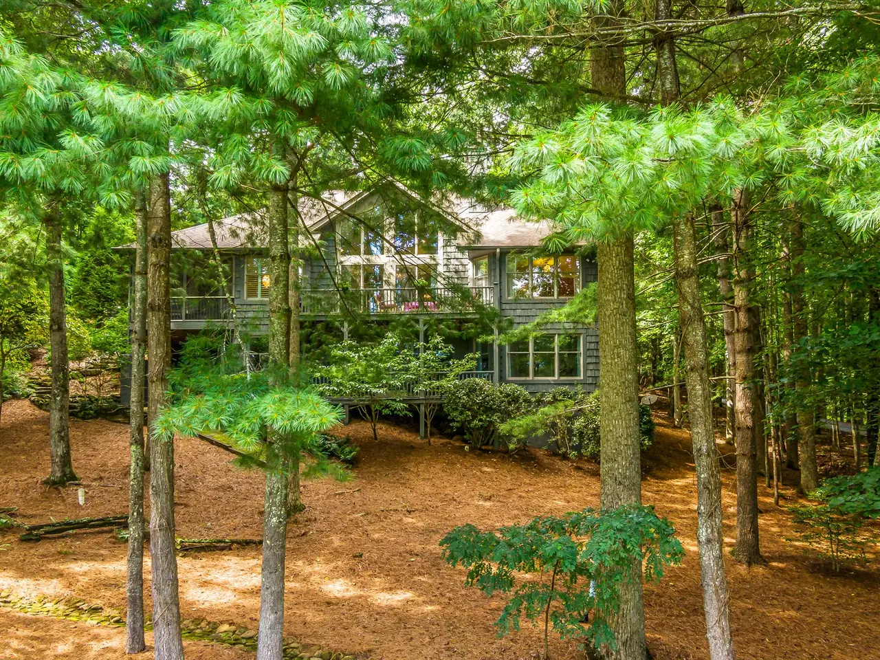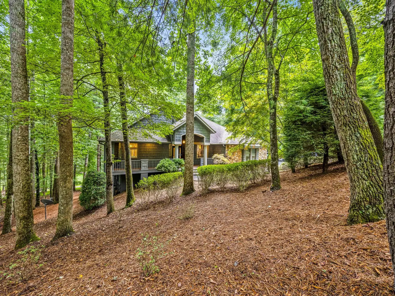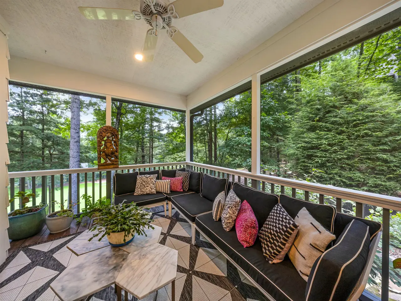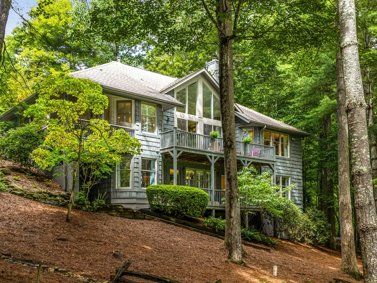 Nestled in Champion Hills above the 12th green, this artist's mountain retreat home pairs modern luxury with an eclectic, world-travel flair. Thoughtful updates and attention to detail bring comfort and style together. From the Samsung Frame TV on a hydraulic TV lift that preserves the aesthetic of the fireplace wall, Brazilian Quartzite countertops in the chef's eat-in kitchen to all the wood floors. The main level's soaring great room and primary suite offer ease of one-level living, while the terrace level is designed for both fun and function with a family room, office, guest suites, and a wet bar. Multiple porches and decks encourage life outdoors - morning coffee on the screened porch, evening wine on the open deck, or quiet afternoons on the covered terrace. Plush yet practical, with golf cart storage, workshop, and abundant space, this home invites you to live serenely in the Blue Ridge Mountains while only minutes from downtown Hendersonville.
