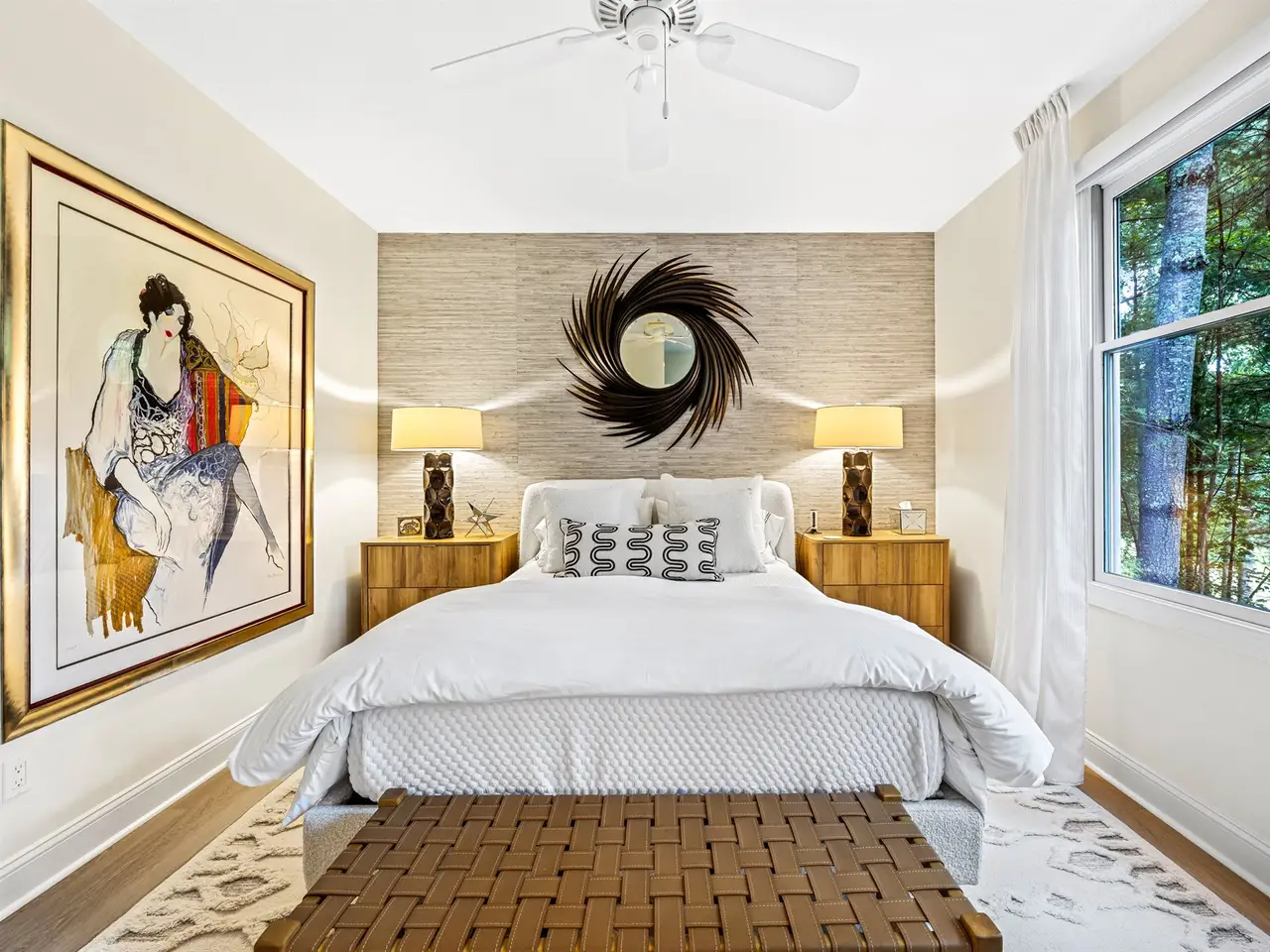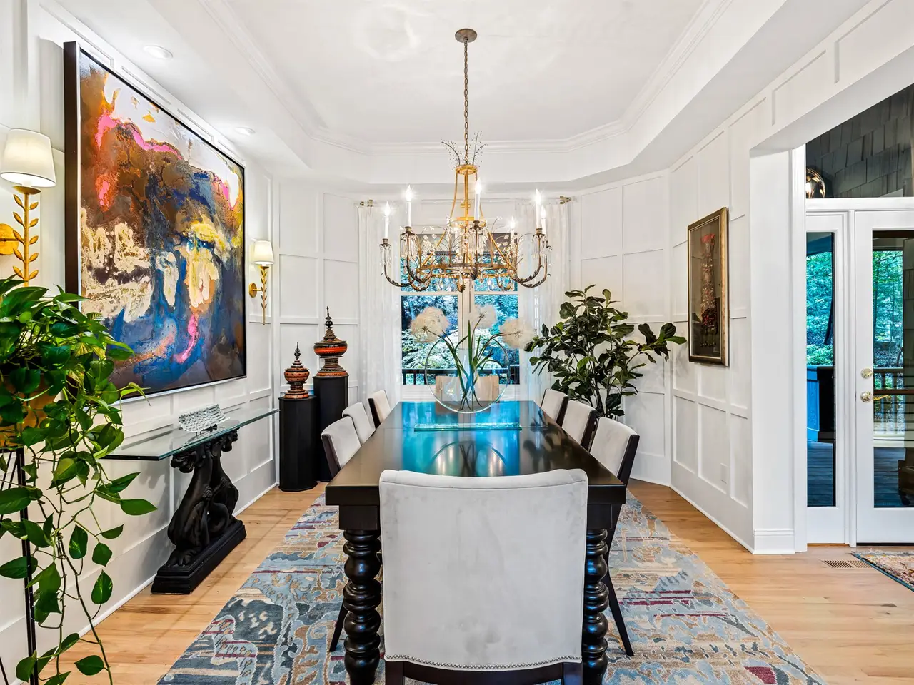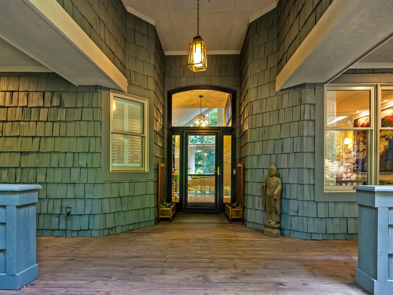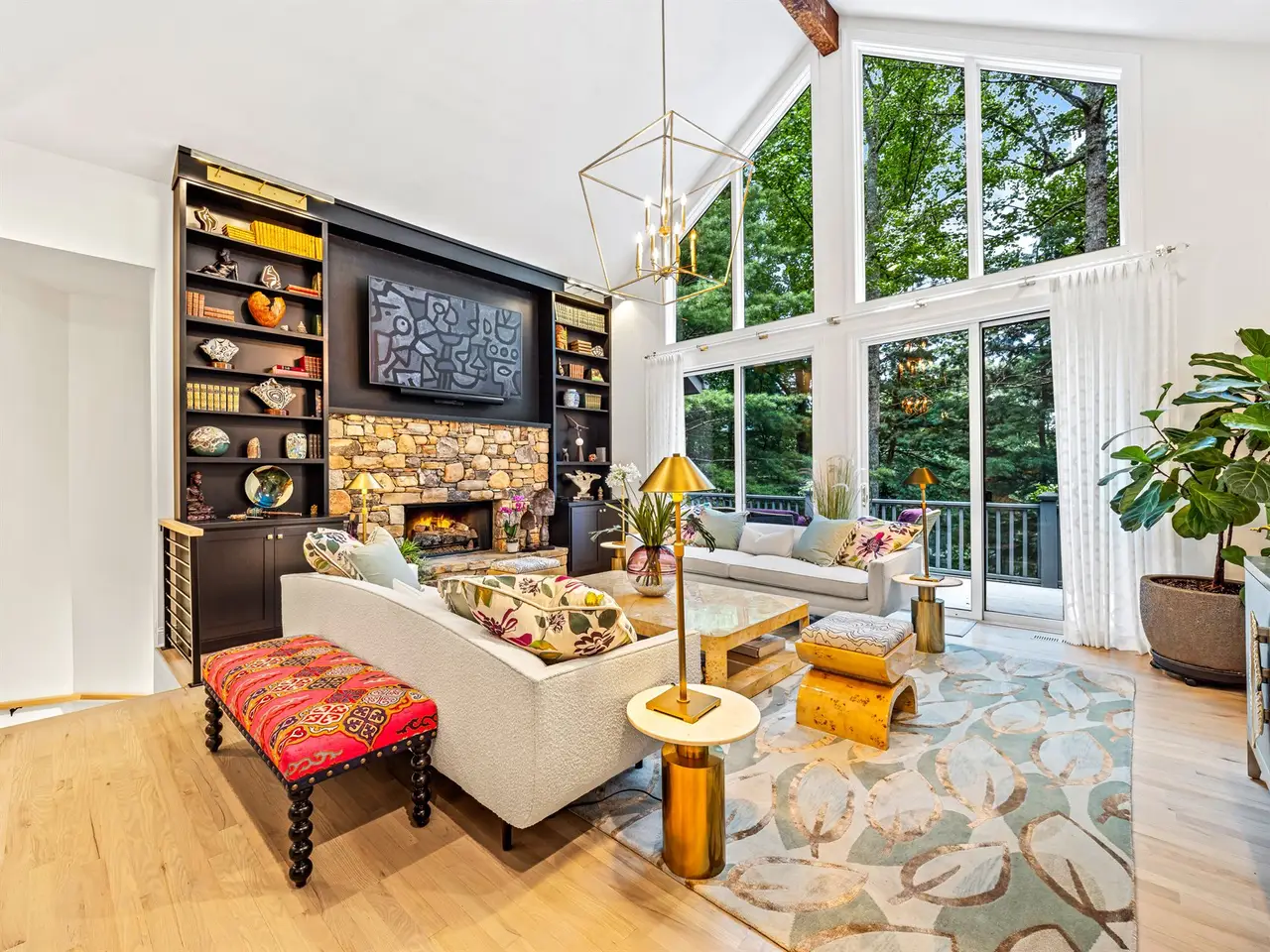 Nestled in Champion Hills above the 12th green, this artist's mountain retreat home pairs modern luxury with an eclectic, world-travel flair. Thoughtful updates and attention to detail bring comfort and style together. From the Samsung Frame TV on a hydraulic TV lift that preserves the aesthetic of the fireplace wall, Brazilian Quartzite countertops in the chef's eat-in kitchen to all the wood floors. The main level's soaring great room and primary suite offer ease of one-level living, while the terrace level is designed for both fun and function with a family room, office, guest suites, and a wet bar. Multiple porches and decks encourage life outdoors - morning coffee on the screened porch, evening wine on the open deck, or quiet afternoons on the covered terrace. Plush yet practical, with golf cart storage, workshop, and abundant space, this home invites you to live serenely in the Blue Ridge Mountains while only minutes from downtown Hendersonville.
