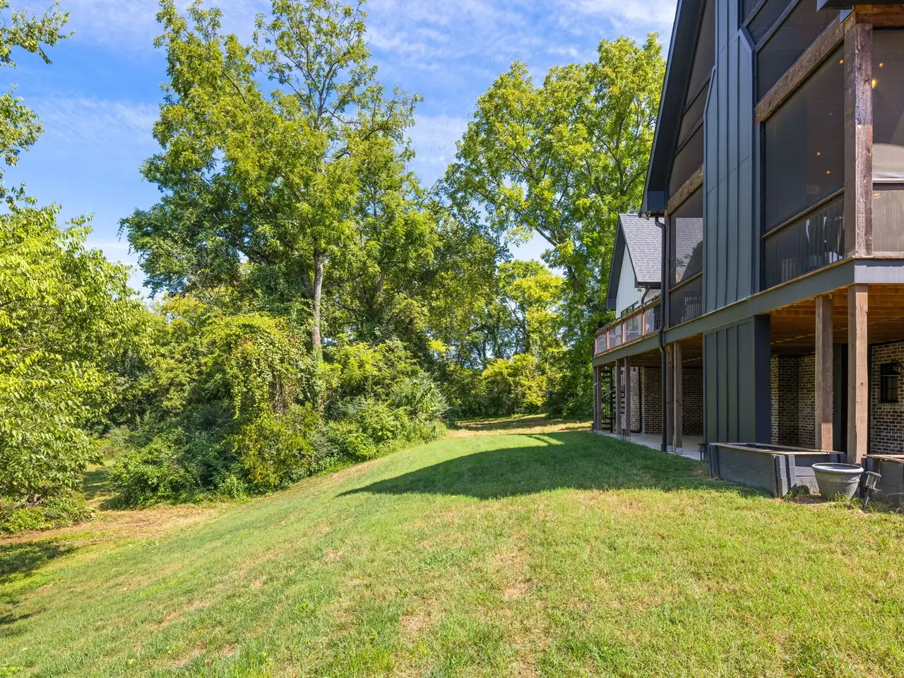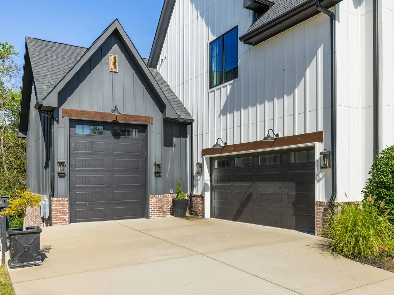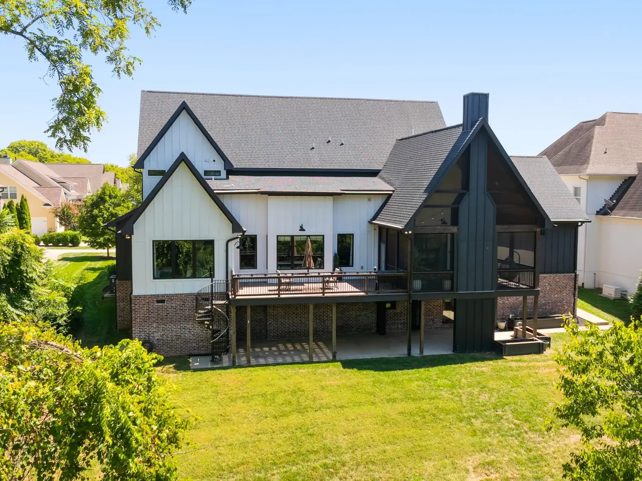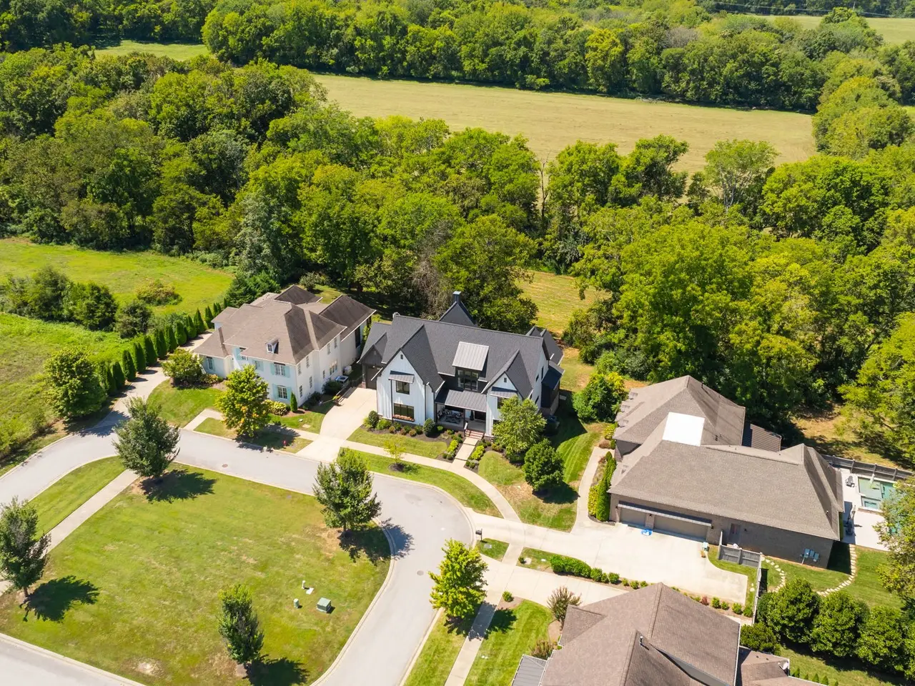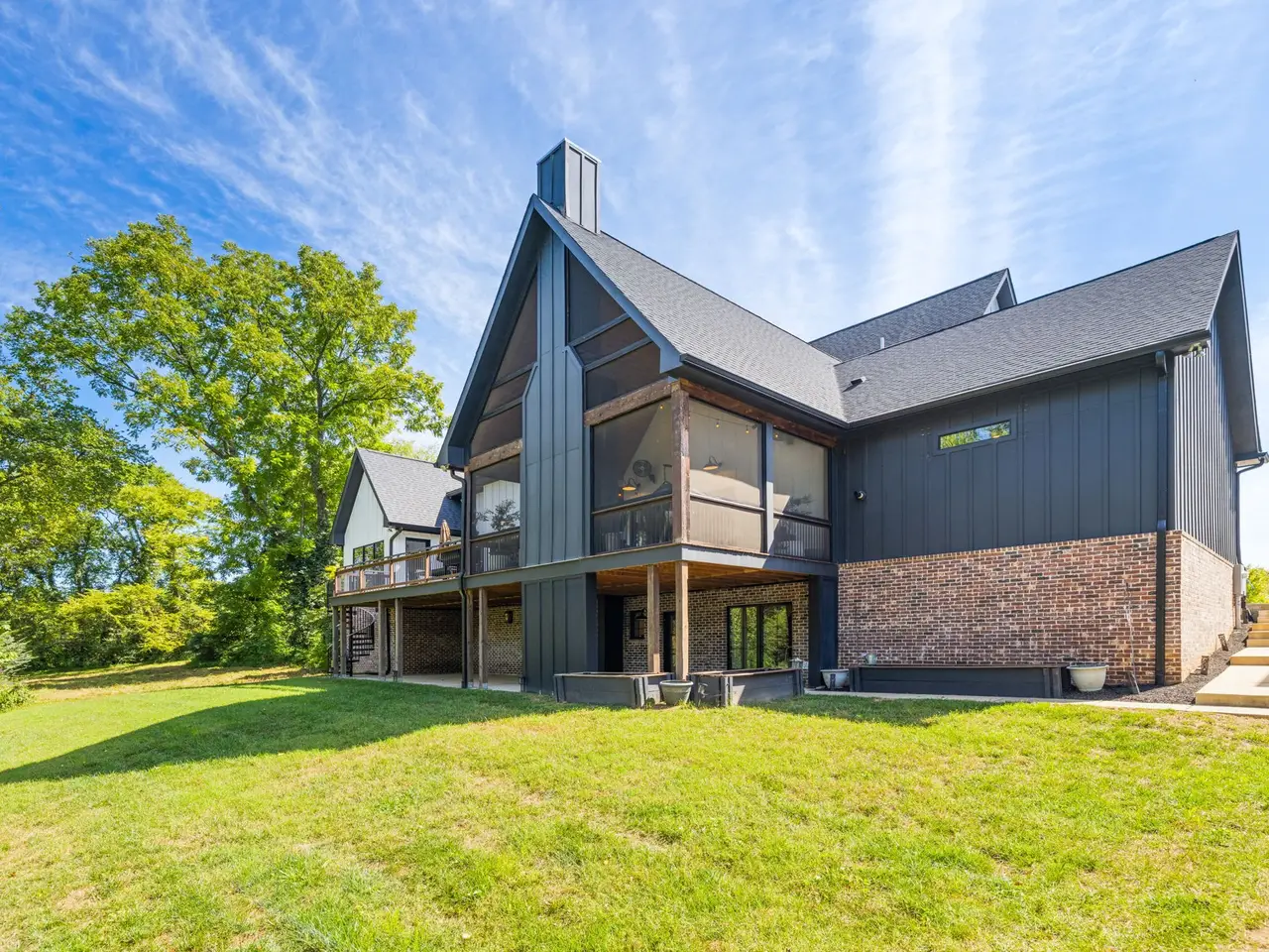 This striking Thompson's Station home blends modern elegance with warm natural accents, featuring a sleek exterior of white, black, brick, and wood finishes. Step inside to a thoughtful floor plan beginning with a moody formal living room--anchored by wainscoting and a statement light fixture--that could also serve as a formal dining space. Across the foyer, a designated office offers custom built-in shelving and cabinetry. The two-story living room impresses with wood-beamed ceilings, a shiplap and tile gas fireplace, and a cozy bay window overlooking the tranquil backyard--the perfect nook for morning coffee, a good book, or evening wine. The kitchen combines function and style with an oversized island, glass-paned cabinetry, open shelving, custom vent hood, top-of-the-line appliances, and a walk-in pantry. A spacious laundry and drop zone with custom cabinetry keeps daily life organized just off the three-car garage, which includes a versatile bay with room for an RV, trailer, or even a partial basketball court. The light-filled main-level primary suite offers a peaceful retreat with a walk-in closet, double vanities, soaking tub, and a floor-to-ceiling tiled shower. Upstairs, enjoy a media room and rec room, while the walk-out basement provides additional living space with a private apartment featuring a full kitchen, bedroom, and bath--ideal for guests. A spiral staircase connects the vaulted, screened-in deck with fireplace to the covered patio below, creating seamless indoor-outdoor living. Additional highlights include abundant unfinished storage space and a serene backyard backing to mature trees and open pasture. Located in the heart of Thompson's Station, this home is minutes from Williamson County schools, scenic parks, walking trails, and the local farmers market, with historic downtown Franklin's shopping and dining just a short drive away.