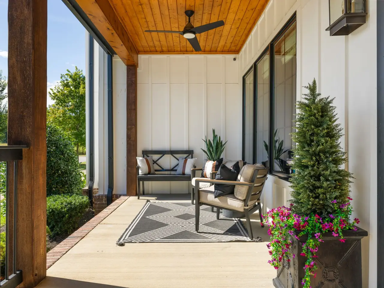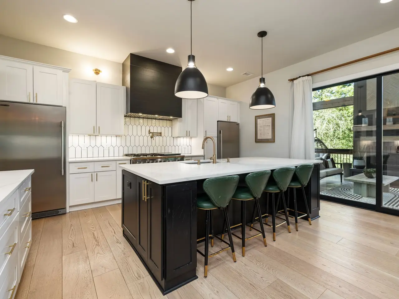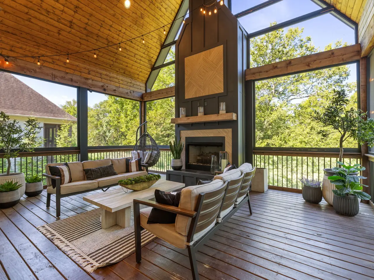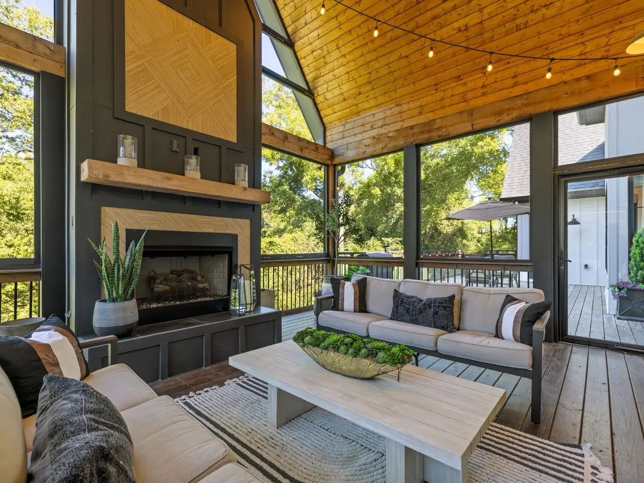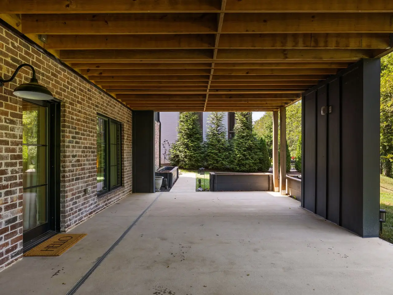 This striking Thompson's Station home blends modern elegance with warm natural accents, featuring a sleek exterior of white, black, brick, and wood finishes. Step inside to a thoughtful floor plan beginning with a moody formal living room--anchored by wainscoting and a statement light fixture--that could also serve as a formal dining space. Across the foyer, a designated office offers custom built-in shelving and cabinetry. The two-story living room impresses with wood-beamed ceilings, a shiplap and tile gas fireplace, and a cozy bay window overlooking the tranquil backyard--the perfect nook for morning coffee, a good book, or evening wine. The kitchen combines function and style with an oversized island, glass-paned cabinetry, open shelving, custom vent hood, top-of-the-line appliances, and a walk-in pantry. A spacious laundry and drop zone with custom cabinetry keeps daily life organized just off the three-car garage, which includes a versatile bay with room for an RV, trailer, or even a partial basketball court. The light-filled main-level primary suite offers a peaceful retreat with a walk-in closet, double vanities, soaking tub, and a floor-to-ceiling tiled shower. Upstairs, enjoy a media room and rec room, while the walk-out basement provides additional living space with a private apartment featuring a full kitchen, bedroom, and bath--ideal for guests. A spiral staircase connects the vaulted, screened-in deck with fireplace to the covered patio below, creating seamless indoor-outdoor living. Additional highlights include abundant unfinished storage space and a serene backyard backing to mature trees and open pasture. Located in the heart of Thompson's Station, this home is minutes from Williamson County schools, scenic parks, walking trails, and the local farmers market, with historic downtown Franklin's shopping and dining just a short drive away.