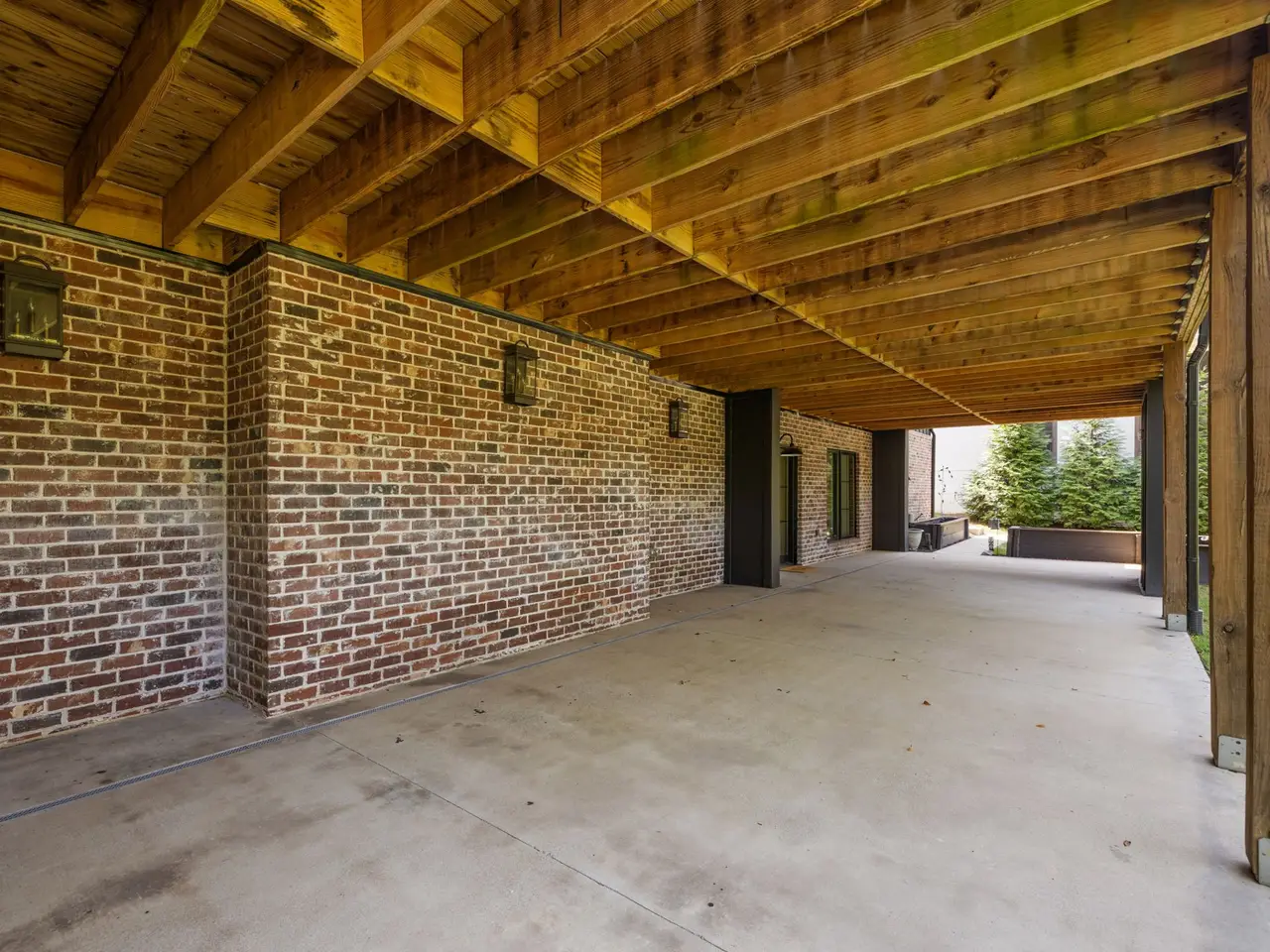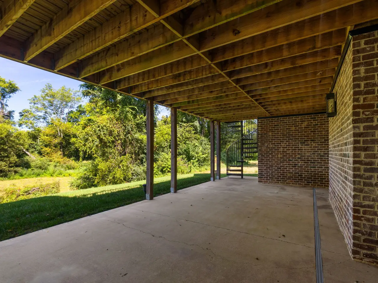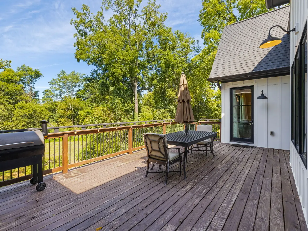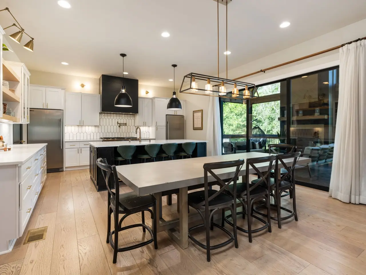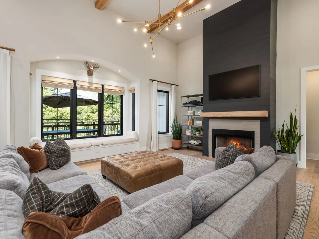 This striking Thompson's Station home blends modern elegance with warm natural accents, featuring a sleek exterior of white, black, brick, and wood finishes. Step inside to a thoughtful floor plan beginning with a moody formal living room--anchored by wainscoting and a statement light fixture--that could also serve as a formal dining space. Across the foyer, a designated office offers custom built-in shelving and cabinetry. The two-story living room impresses with wood-beamed ceilings, a shiplap and tile gas fireplace, and a cozy bay window overlooking the tranquil backyard--the perfect nook for morning coffee, a good book, or evening wine. The kitchen combines function and style with an oversized island, glass-paned cabinetry, open shelving, custom vent hood, top-of-the-line appliances, and a walk-in pantry. A spacious laundry and drop zone with custom cabinetry keeps daily life organized just off the three-car garage, which includes a versatile bay with room for an RV, trailer, or even a partial basketball court. The light-filled main-level primary suite offers a peaceful retreat with a walk-in closet, double vanities, soaking tub, and a floor-to-ceiling tiled shower. Upstairs, enjoy a media room and rec room, while the walk-out basement provides additional living space with a private apartment featuring a full kitchen, bedroom, and bath--ideal for guests. A spiral staircase connects the vaulted, screened-in deck with fireplace to the covered patio below, creating seamless indoor-outdoor living. Additional highlights include abundant unfinished storage space and a serene backyard backing to mature trees and open pasture. Located in the heart of Thompson's Station, this home is minutes from Williamson County schools, scenic parks, walking trails, and the local farmers market, with historic downtown Franklin's shopping and dining just a short drive away.