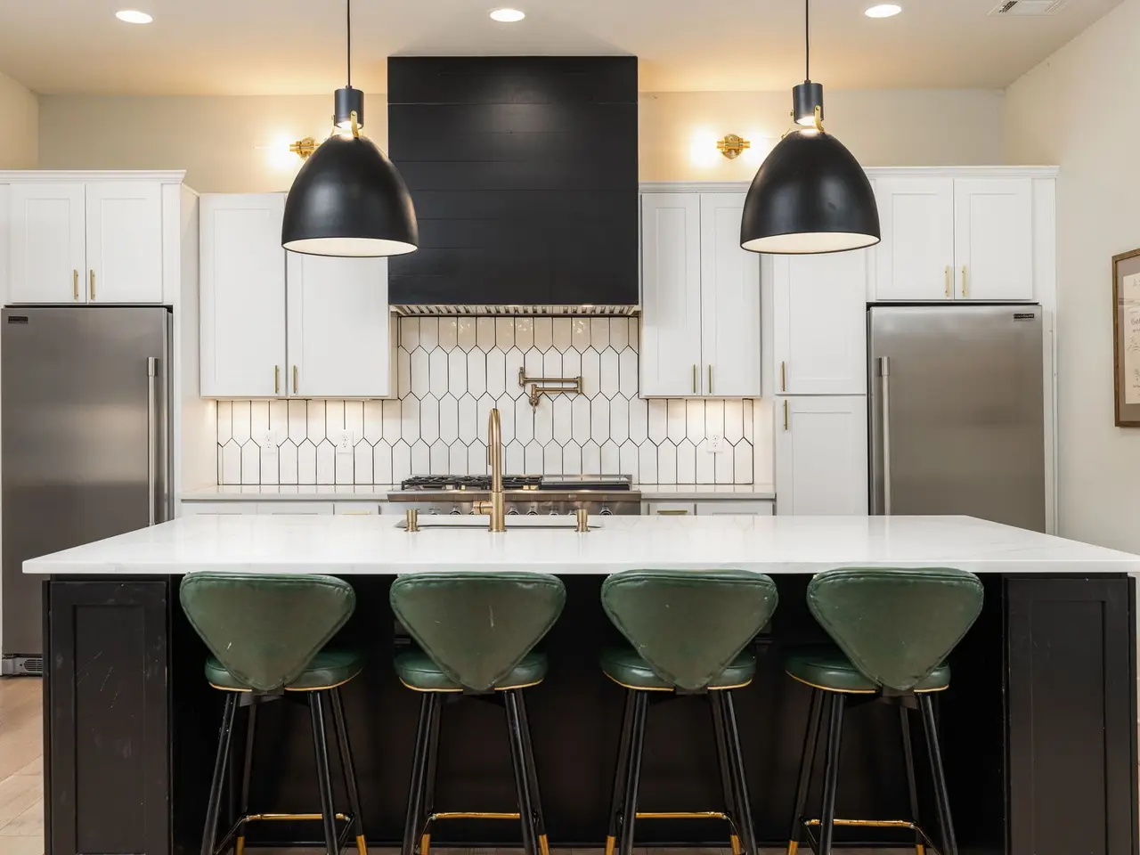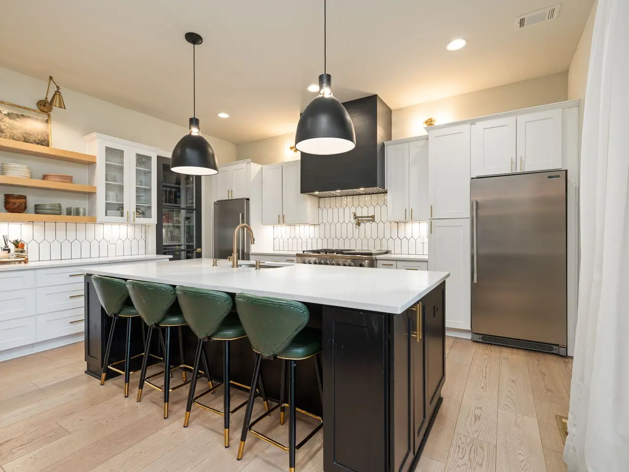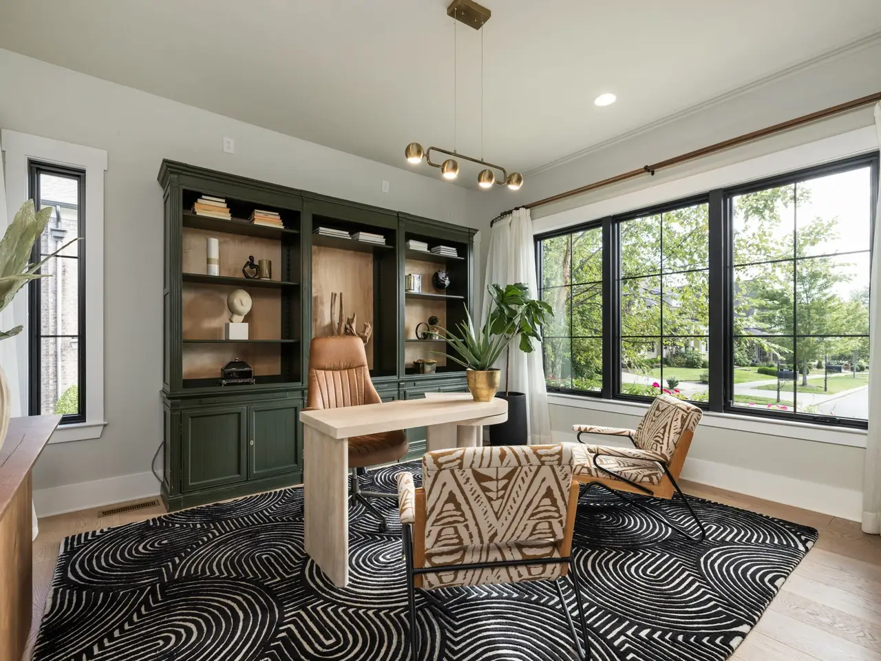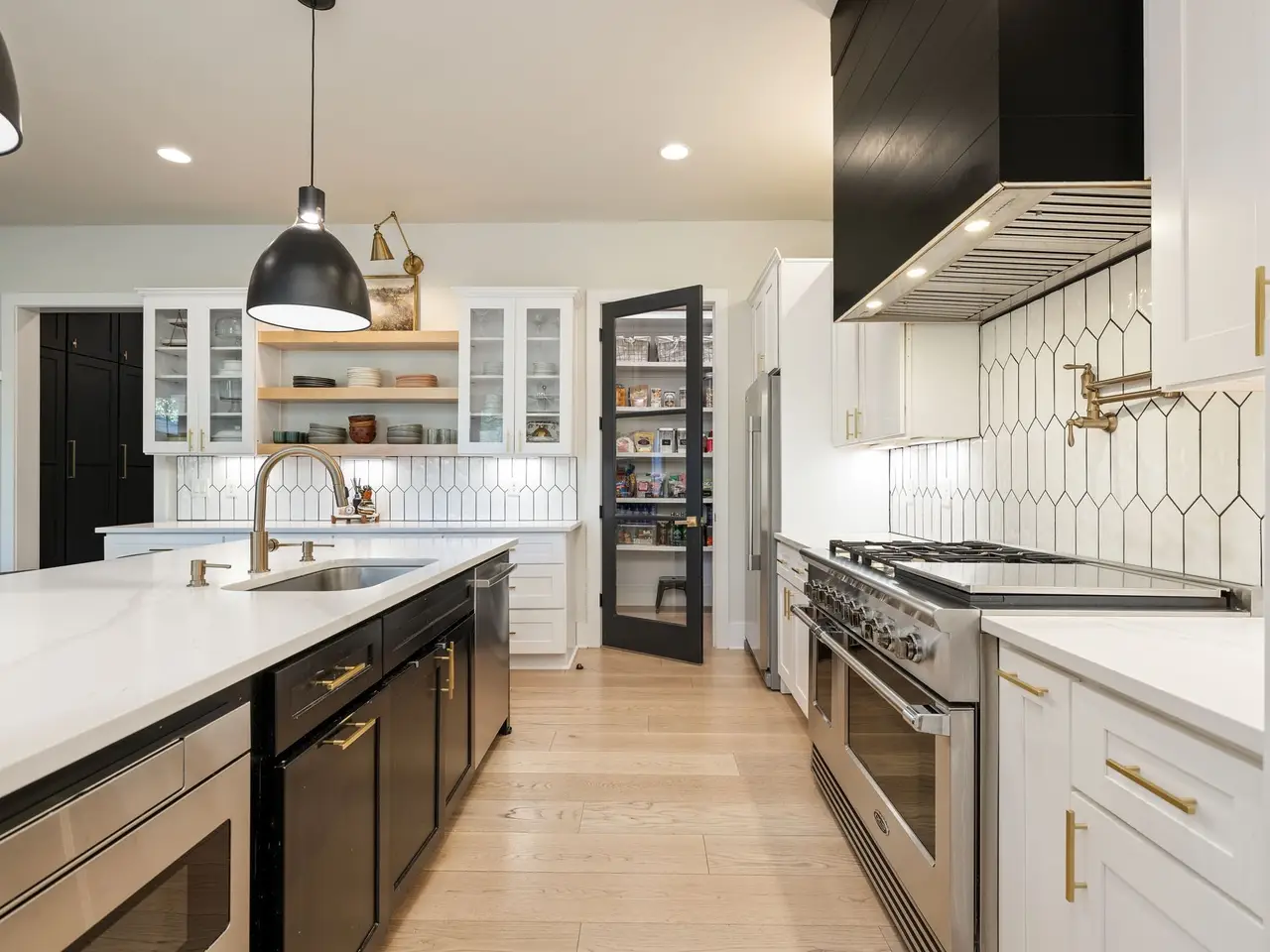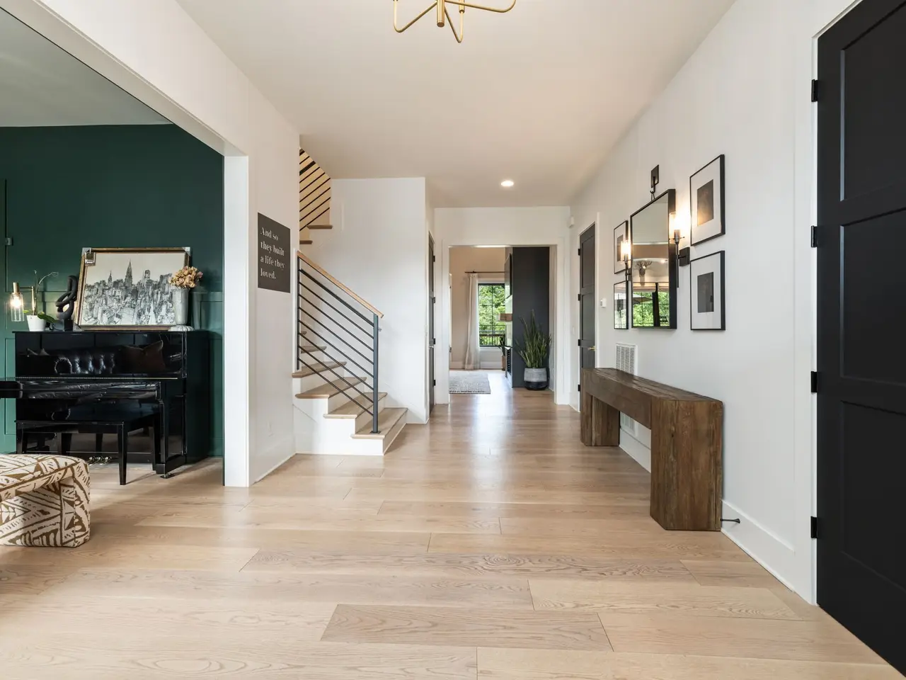 This striking Thompson's Station home blends modern elegance with warm natural accents, featuring a sleek exterior of white, black, brick, and wood finishes. Step inside to a thoughtful floor plan beginning with a moody formal living room--anchored by wainscoting and a statement light fixture--that could also serve as a formal dining space. Across the foyer, a designated office offers custom built-in shelving and cabinetry. The two-story living room impresses with wood-beamed ceilings, a shiplap and tile gas fireplace, and a cozy bay window overlooking the tranquil backyard--the perfect nook for morning coffee, a good book, or evening wine. The kitchen combines function and style with an oversized island, glass-paned cabinetry, open shelving, custom vent hood, top-of-the-line appliances, and a walk-in pantry. A spacious laundry and drop zone with custom cabinetry keeps daily life organized just off the three-car garage, which includes a versatile bay with room for an RV, trailer, or even a partial basketball court. The light-filled main-level primary suite offers a peaceful retreat with a walk-in closet, double vanities, soaking tub, and a floor-to-ceiling tiled shower. Upstairs, enjoy a media room and rec room, while the walk-out basement provides additional living space with a private apartment featuring a full kitchen, bedroom, and bath--ideal for guests. A spiral staircase connects the vaulted, screened-in deck with fireplace to the covered patio below, creating seamless indoor-outdoor living. Additional highlights include abundant unfinished storage space and a serene backyard backing to mature trees and open pasture. Located in the heart of Thompson's Station, this home is minutes from Williamson County schools, scenic parks, walking trails, and the local farmers market, with historic downtown Franklin's shopping and dining just a short drive away.