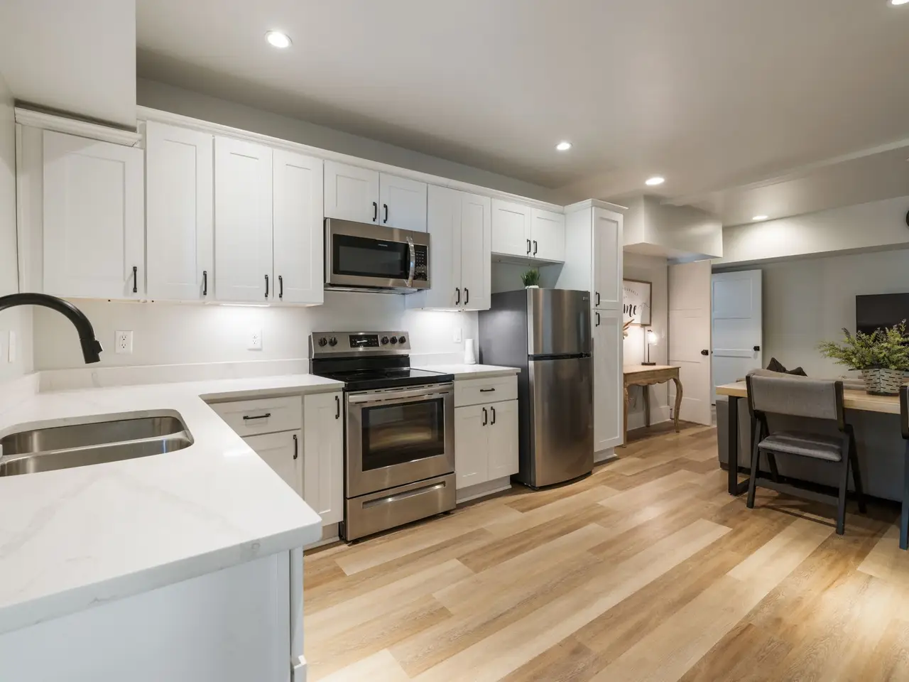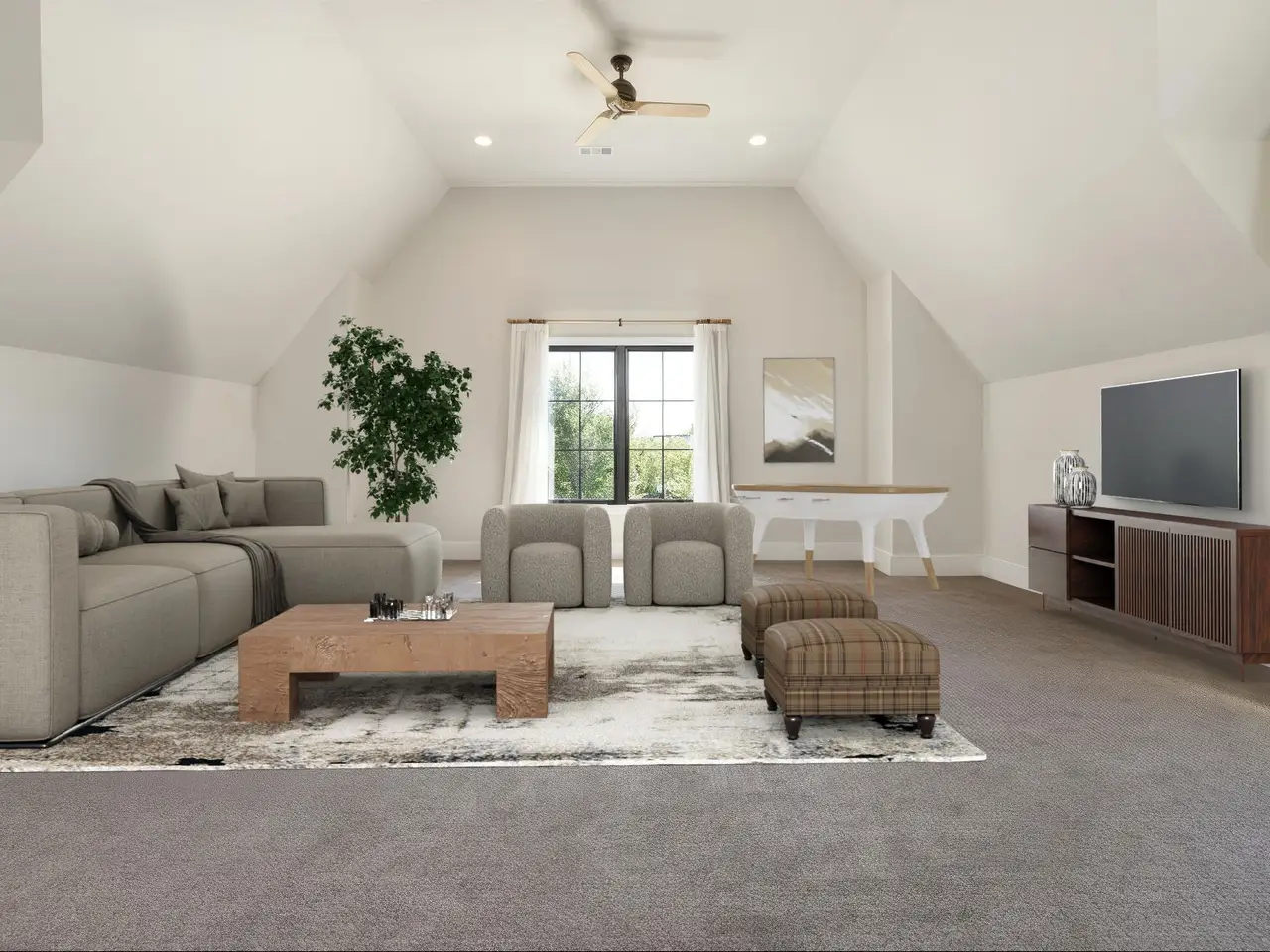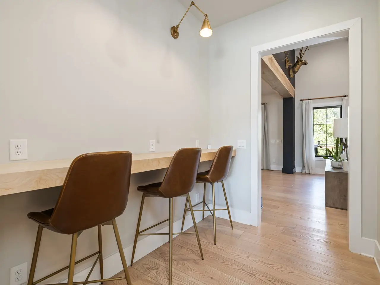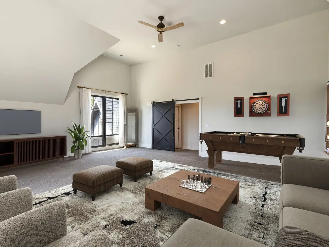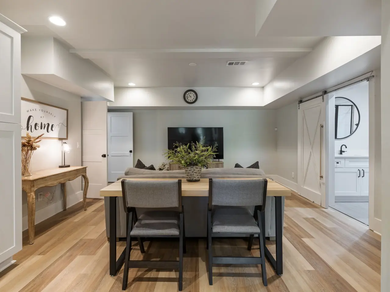 This striking Thompson's Station home blends modern elegance with warm natural accents, featuring a sleek exterior of white, black, brick, and wood finishes. Step inside to a thoughtful floor plan beginning with a moody formal living room--anchored by wainscoting and a statement light fixture--that could also serve as a formal dining space. Across the foyer, a designated office offers custom built-in shelving and cabinetry. The two-story living room impresses with wood-beamed ceilings, a shiplap and tile gas fireplace, and a cozy bay window overlooking the tranquil backyard--the perfect nook for morning coffee, a good book, or evening wine. The kitchen combines function and style with an oversized island, glass-paned cabinetry, open shelving, custom vent hood, top-of-the-line appliances, and a walk-in pantry. A spacious laundry and drop zone with custom cabinetry keeps daily life organized just off the three-car garage, which includes a versatile bay with room for an RV, trailer, or even a partial basketball court. The light-filled main-level primary suite offers a peaceful retreat with a walk-in closet, double vanities, soaking tub, and a floor-to-ceiling tiled shower. Upstairs, enjoy a media room and rec room, while the walk-out basement provides additional living space with a private apartment featuring a full kitchen, bedroom, and bath--ideal for guests. A spiral staircase connects the vaulted, screened-in deck with fireplace to the covered patio below, creating seamless indoor-outdoor living. Additional highlights include abundant unfinished storage space and a serene backyard backing to mature trees and open pasture. Located in the heart of Thompson's Station, this home is minutes from Williamson County schools, scenic parks, walking trails, and the local farmers market, with historic downtown Franklin's shopping and dining just a short drive away.