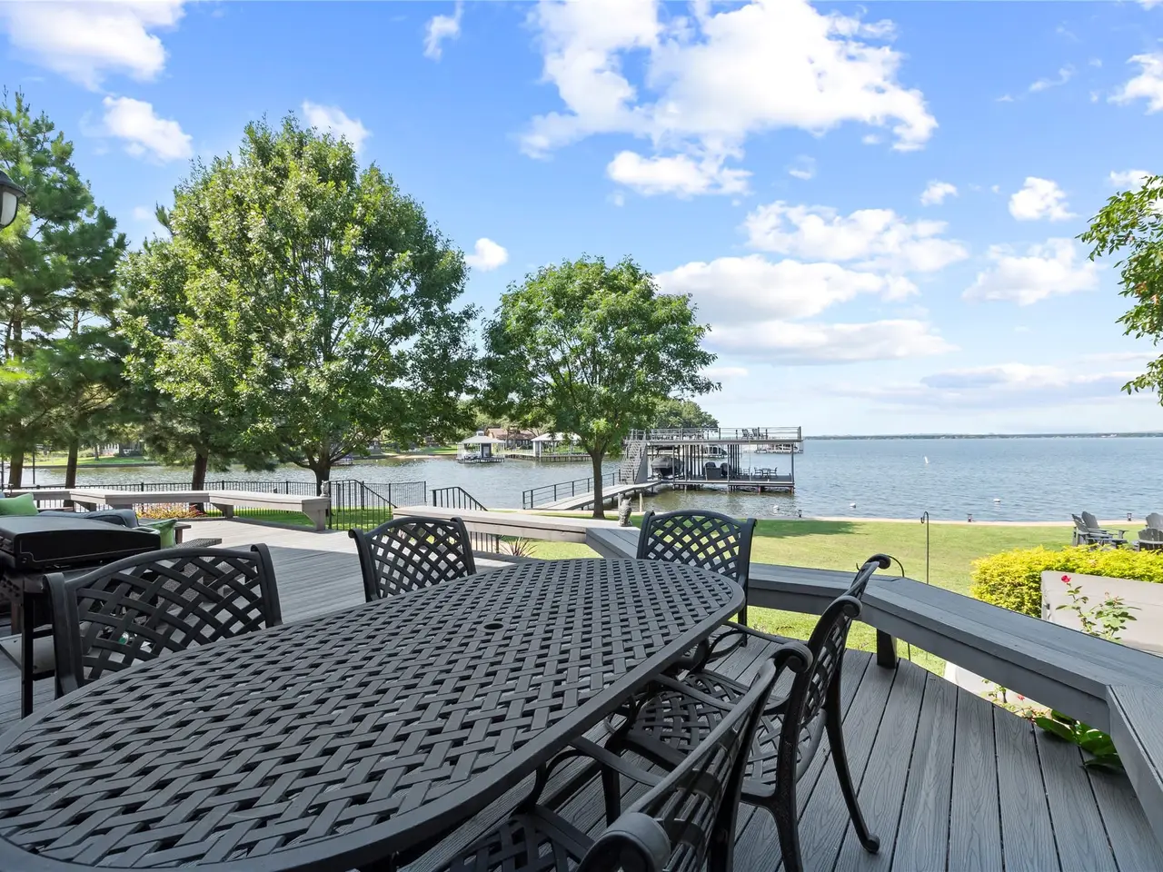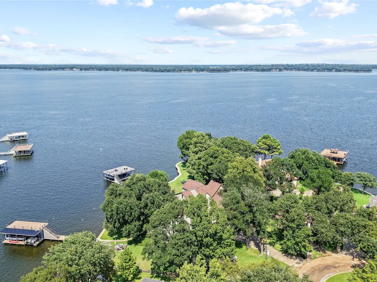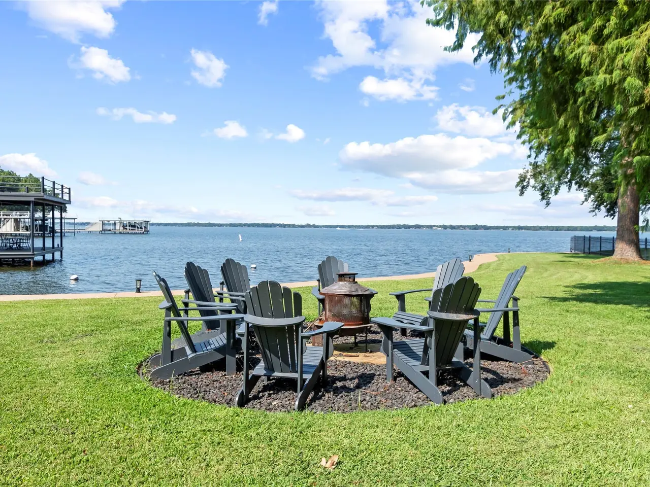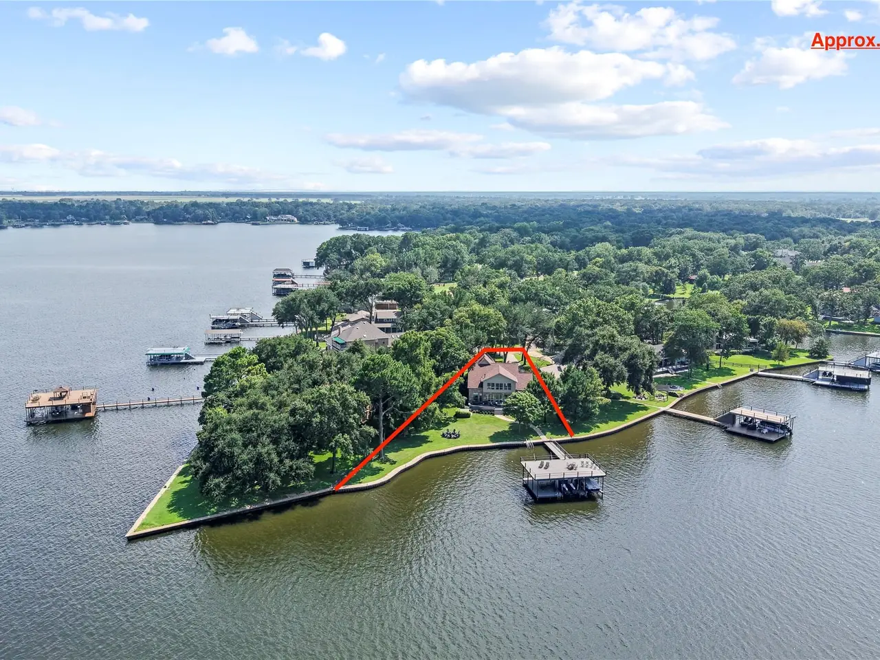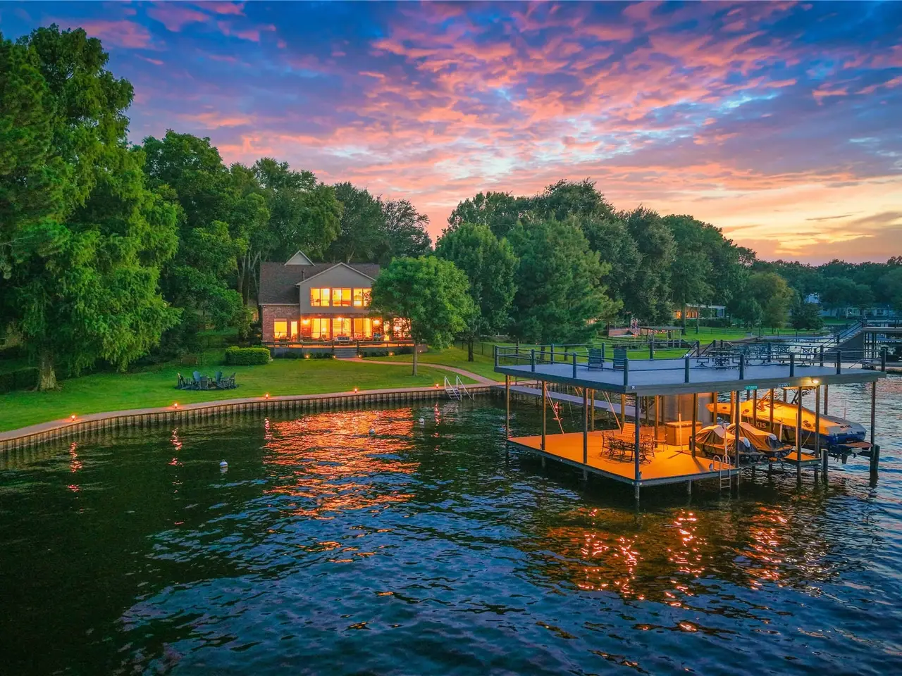 Situated on a stunning half-acre waterfront lot with an impressive 198 feet of shoreline, this expansive five bedroom, 3.5-bath home offers breathtaking open water views and deep water access in one of Cedar Creek Lakes most desirable subdivisions. Perfect as a full-time residence, vacation retreat, or short-term rental, this home is designed for hosting and entertaining. Inside, the living room boasts luxury vinyl plank flooring, a gas fireplace, a wet bar, and panoramic views of the lake. The kitchen features granite countertops, a built-in refrigerator, and an abundance of cabinet and counter space, complemented by a cozy breakfast area and formal dining room ideal for holiday gatherings. The primary suite offers lake views, a spacious ensuite with double vanities, a soaking tub, walk-in shower, and a large walk-in closet, as well as a private waterside sitting area perfect for a home office or peaceful retreat. Upstairs includes three additional bedrooms, two more bathrooms, a generously sized bunk room with a second wet bar, and a large game room with expansive picture windows showcasing unobstructed water views. Outdoor living is elevated with a wraparound deck composite deck overlooking a beautifully landscaped yard, complete with a fire pit, hot tub, and a massive composite-deck 1,337 square foot boathouse featuring a boat slip, dual jet ski platform, covered sitting area, and a party deck with miles of open water vistas. Oversized three-car garage accommodates two vehicles plus room for a golf cart and storing all those water toys. Circle drive and large driveway accommodate several vehicles. The home is sold fully furnished with limited exclusions, making it truly turnkey and ready for immediate enjoyment. Proven short-term rental history available.