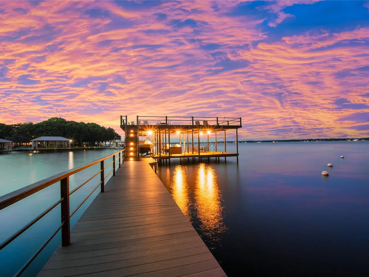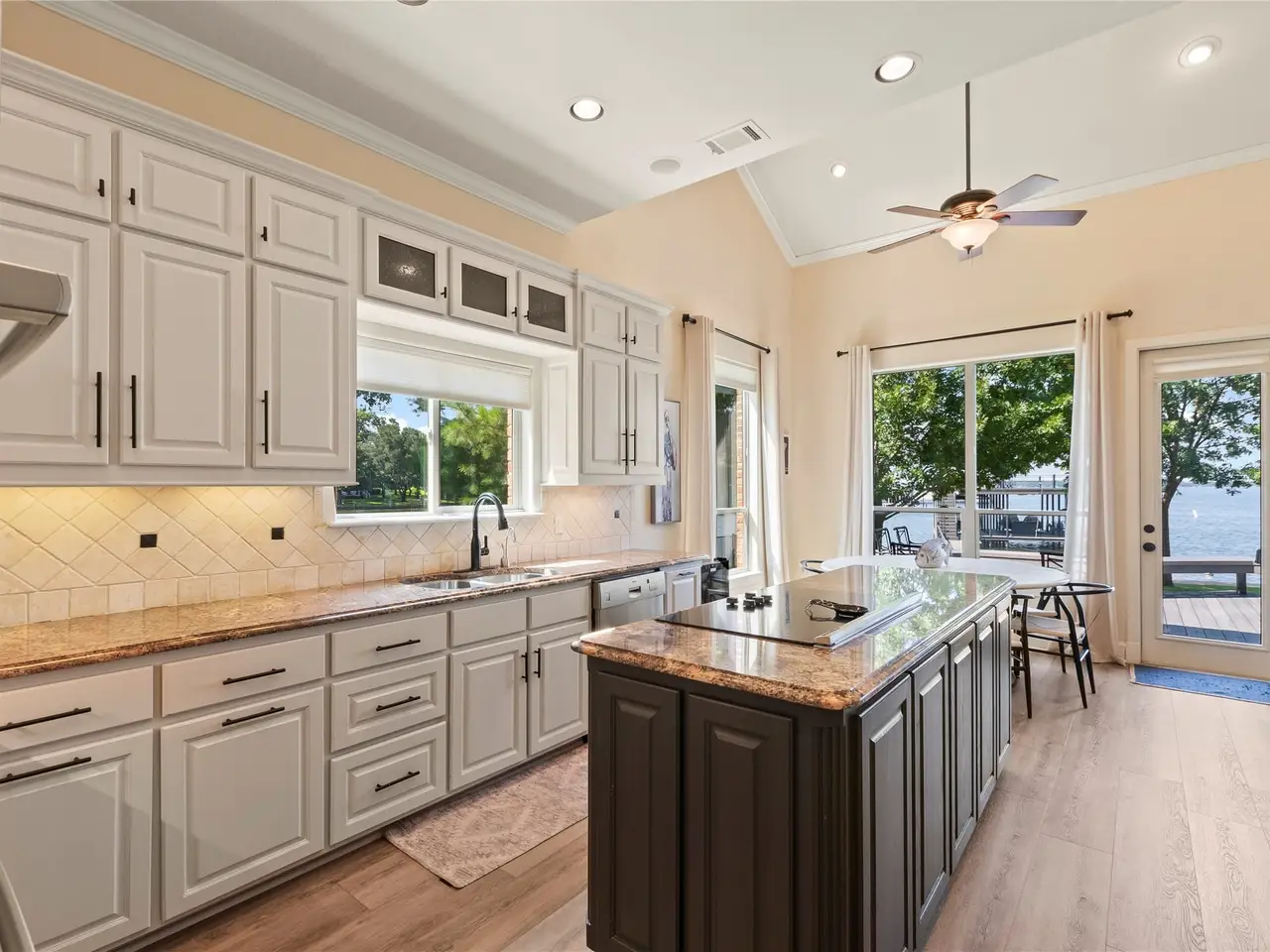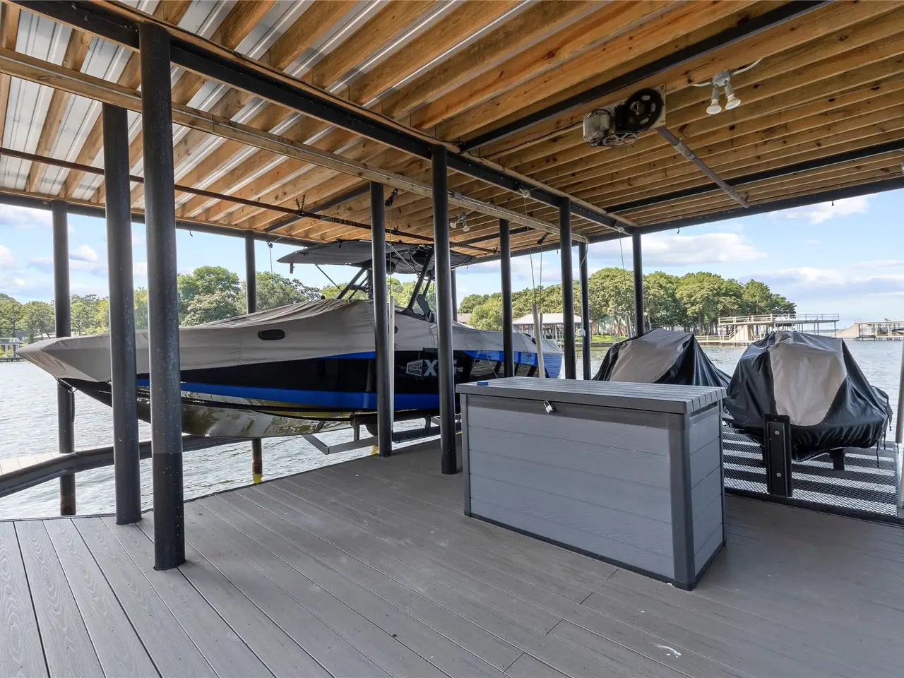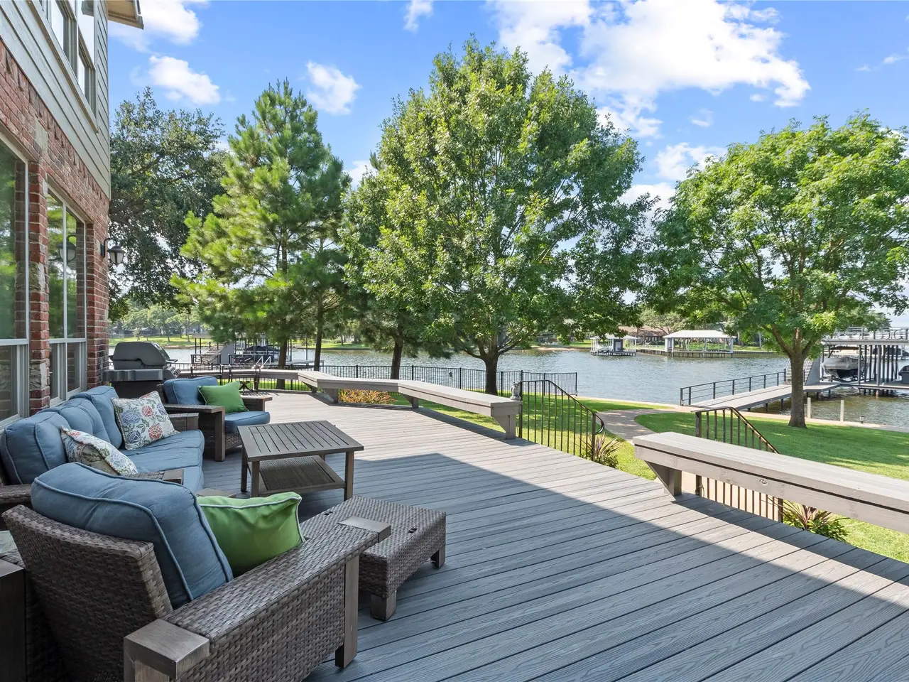 Situated on a stunning half-acre waterfront lot with an impressive 198 feet of shoreline, this expansive five bedroom, 3.5-bath home offers breathtaking open water views and deep water access in one of Cedar Creek Lakes most desirable subdivisions. Perfect as a full-time residence, vacation retreat, or short-term rental, this home is designed for hosting and entertaining. Inside, the living room boasts luxury vinyl plank flooring, a gas fireplace, a wet bar, and panoramic views of the lake. The kitchen features granite countertops, a built-in refrigerator, and an abundance of cabinet and counter space, complemented by a cozy breakfast area and formal dining room ideal for holiday gatherings. The primary suite offers lake views, a spacious ensuite with double vanities, a soaking tub, walk-in shower, and a large walk-in closet, as well as a private waterside sitting area perfect for a home office or peaceful retreat. Upstairs includes three additional bedrooms, two more bathrooms, a generously sized bunk room with a second wet bar, and a large game room with expansive picture windows showcasing unobstructed water views. Outdoor living is elevated with a wraparound deck composite deck overlooking a beautifully landscaped yard, complete with a fire pit, hot tub, and a massive composite-deck 1,337 square foot boathouse featuring a boat slip, dual jet ski platform, covered sitting area, and a party deck with miles of open water vistas. Oversized three-car garage accommodates two vehicles plus room for a golf cart and storing all those water toys. Circle drive and large driveway accommodate several vehicles. The home is sold fully furnished with limited exclusions, making it truly turnkey and ready for immediate enjoyment. Proven short-term rental history available.