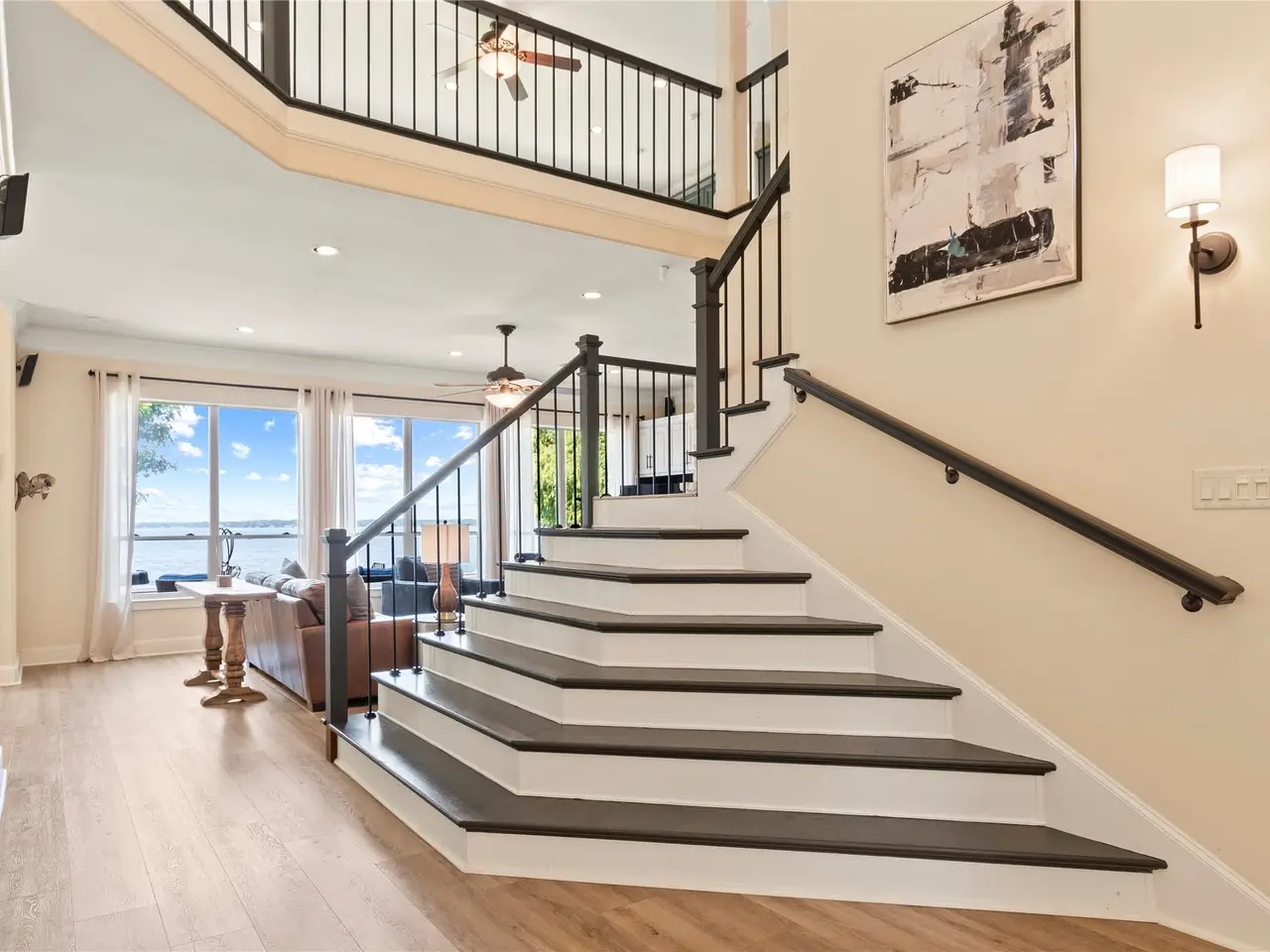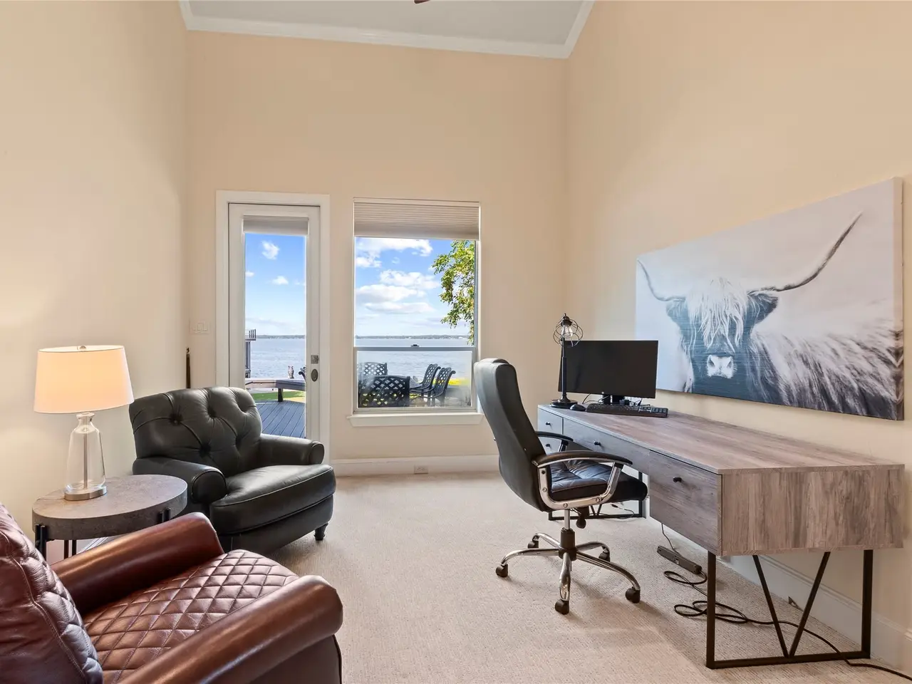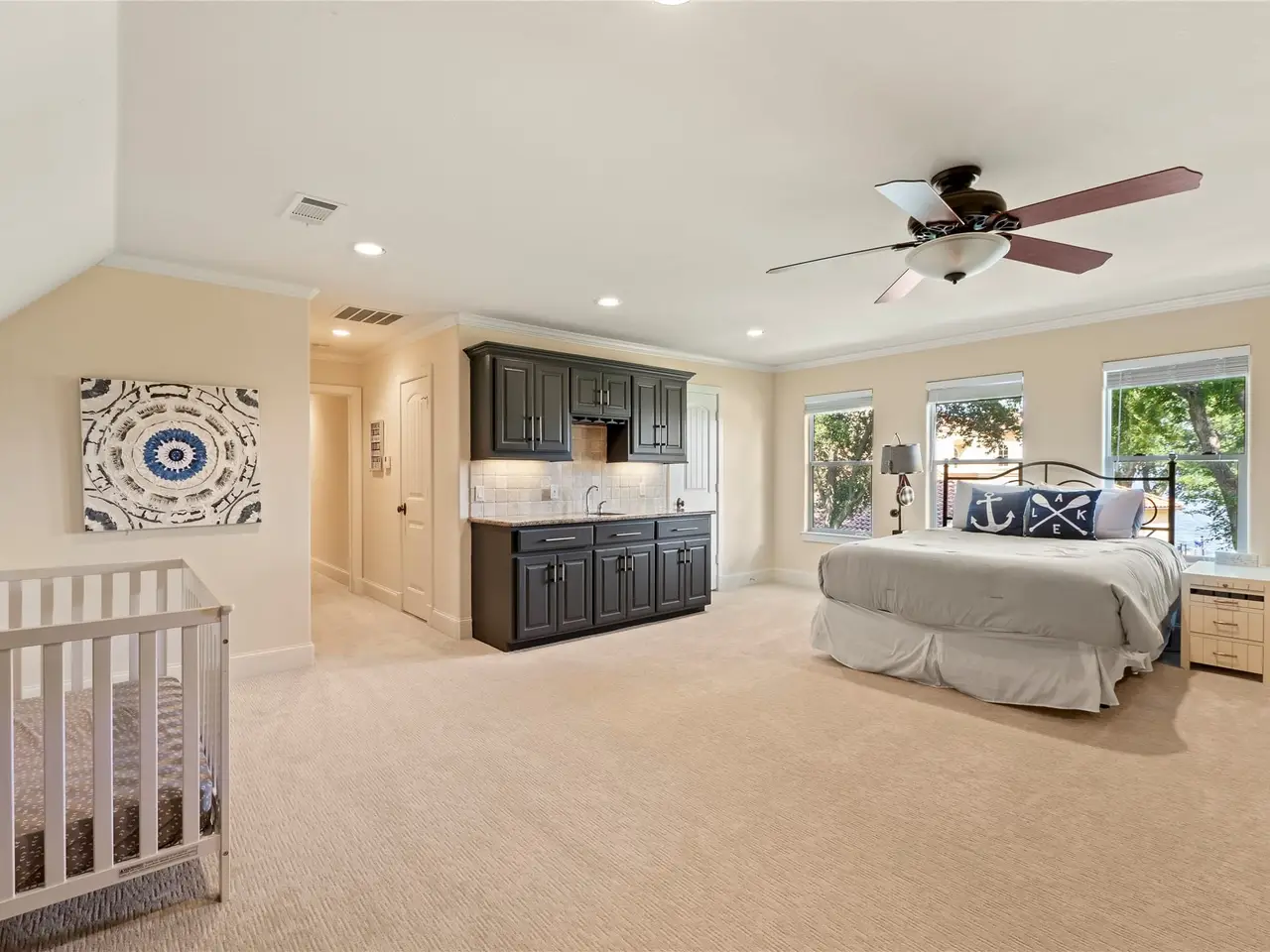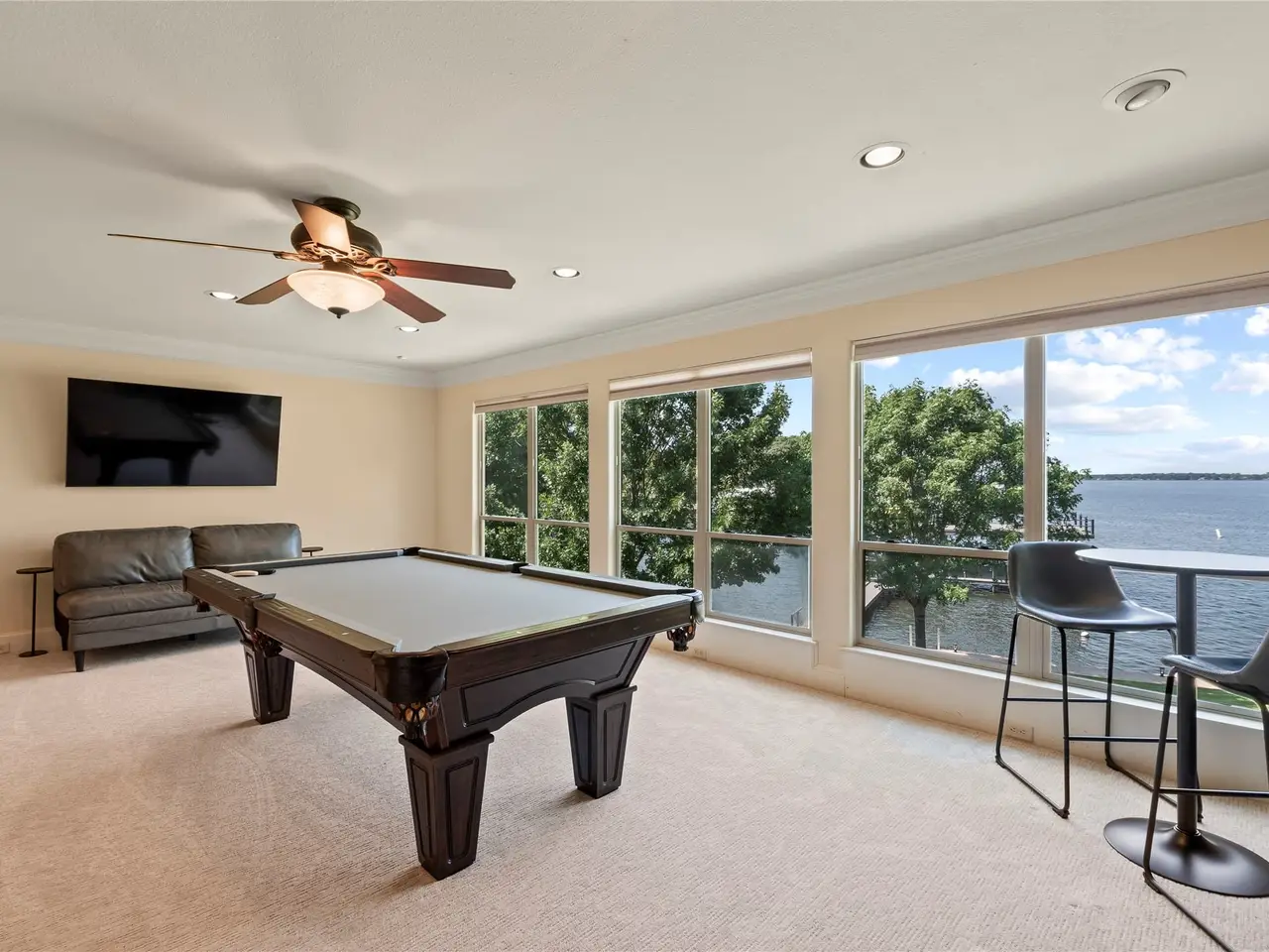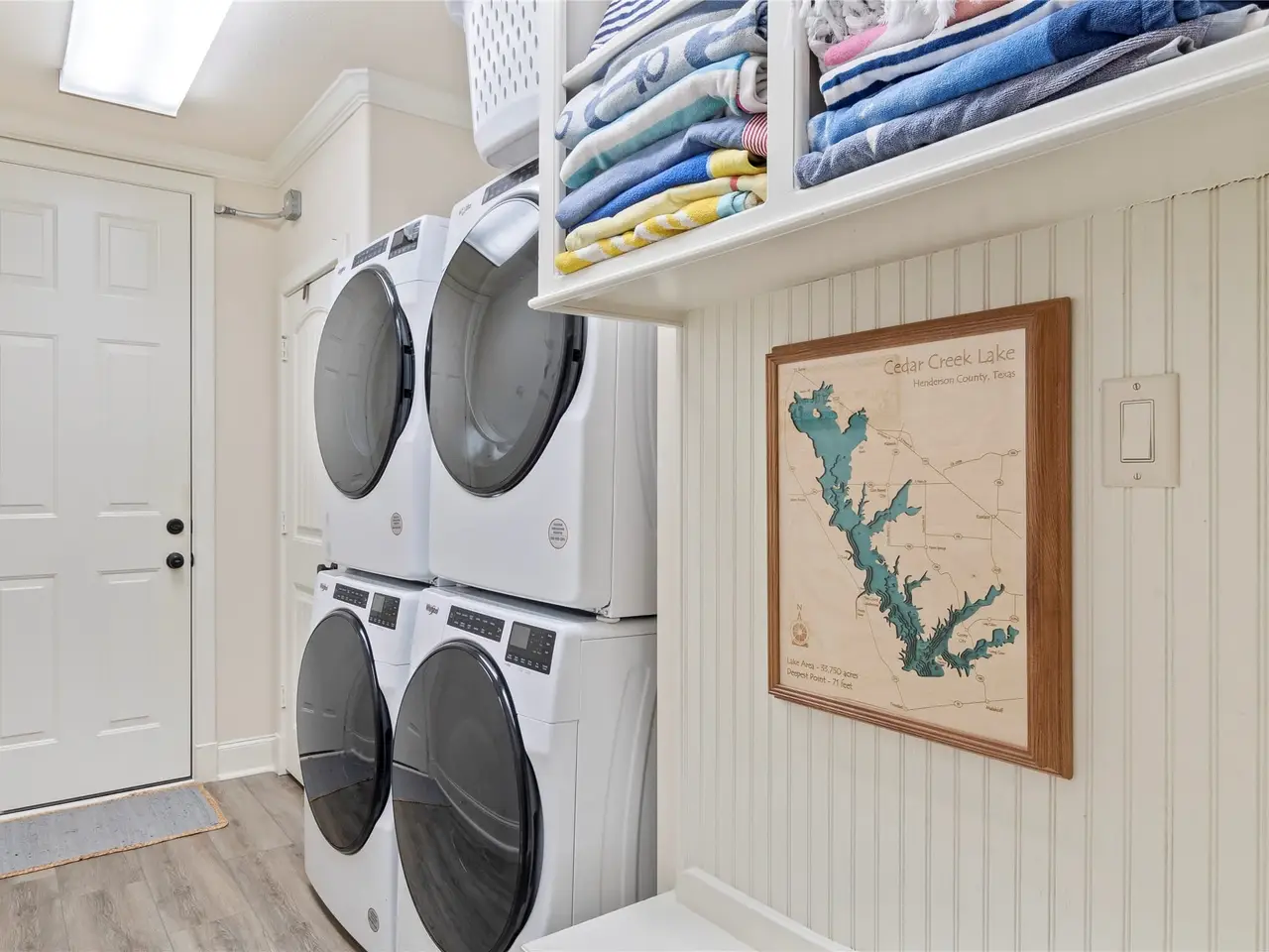 Situated on a stunning half-acre waterfront lot with an impressive 198 feet of shoreline, this expansive five bedroom, 3.5-bath home offers breathtaking open water views and deep water access in one of Cedar Creek Lakes most desirable subdivisions. Perfect as a full-time residence, vacation retreat, or short-term rental, this home is designed for hosting and entertaining. Inside, the living room boasts luxury vinyl plank flooring, a gas fireplace, a wet bar, and panoramic views of the lake. The kitchen features granite countertops, a built-in refrigerator, and an abundance of cabinet and counter space, complemented by a cozy breakfast area and formal dining room ideal for holiday gatherings. The primary suite offers lake views, a spacious ensuite with double vanities, a soaking tub, walk-in shower, and a large walk-in closet, as well as a private waterside sitting area perfect for a home office or peaceful retreat. Upstairs includes three additional bedrooms, two more bathrooms, a generously sized bunk room with a second wet bar, and a large game room with expansive picture windows showcasing unobstructed water views. Outdoor living is elevated with a wraparound deck composite deck overlooking a beautifully landscaped yard, complete with a fire pit, hot tub, and a massive composite-deck 1,337 square foot boathouse featuring a boat slip, dual jet ski platform, covered sitting area, and a party deck with miles of open water vistas. Oversized three-car garage accommodates two vehicles plus room for a golf cart and storing all those water toys. Circle drive and large driveway accommodate several vehicles. The home is sold fully furnished with limited exclusions, making it truly turnkey and ready for immediate enjoyment. Proven short-term rental history available.