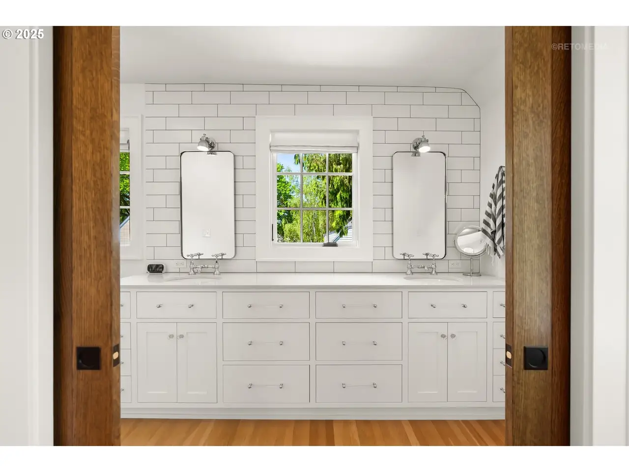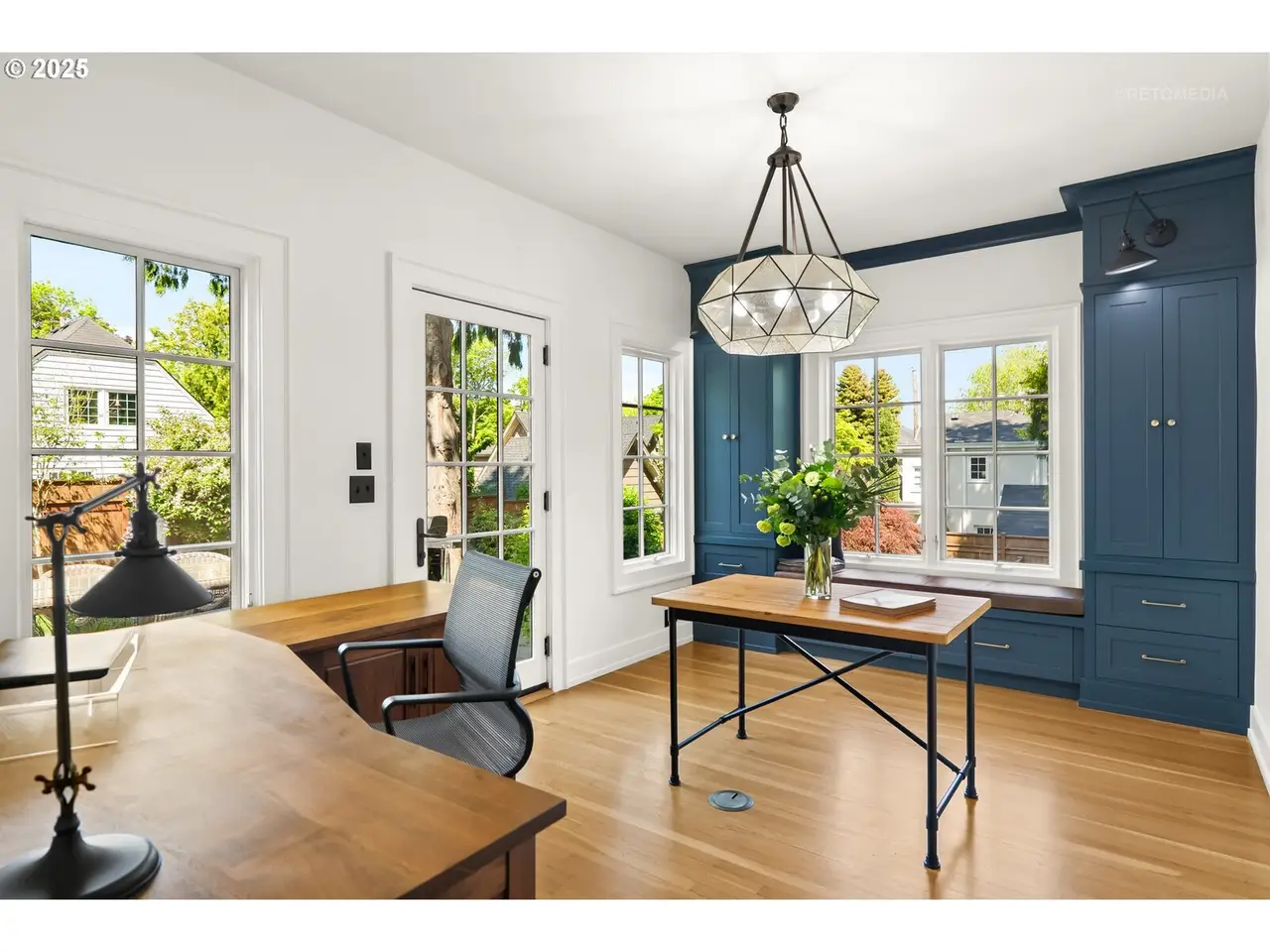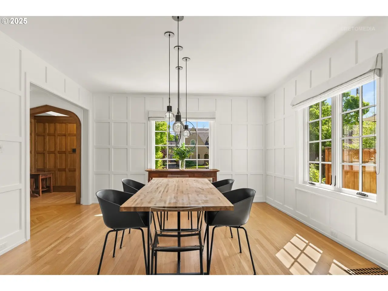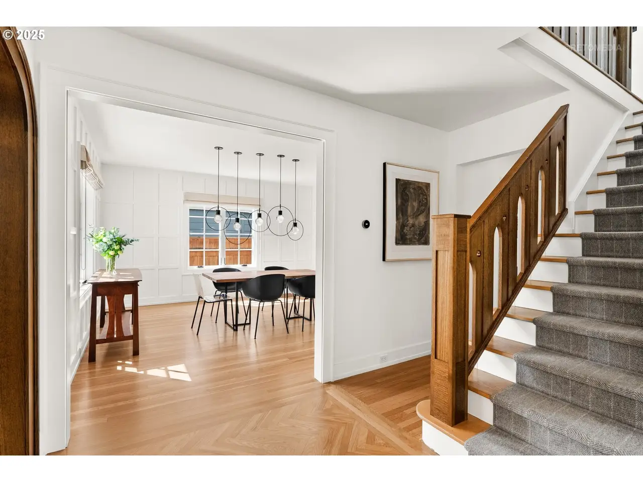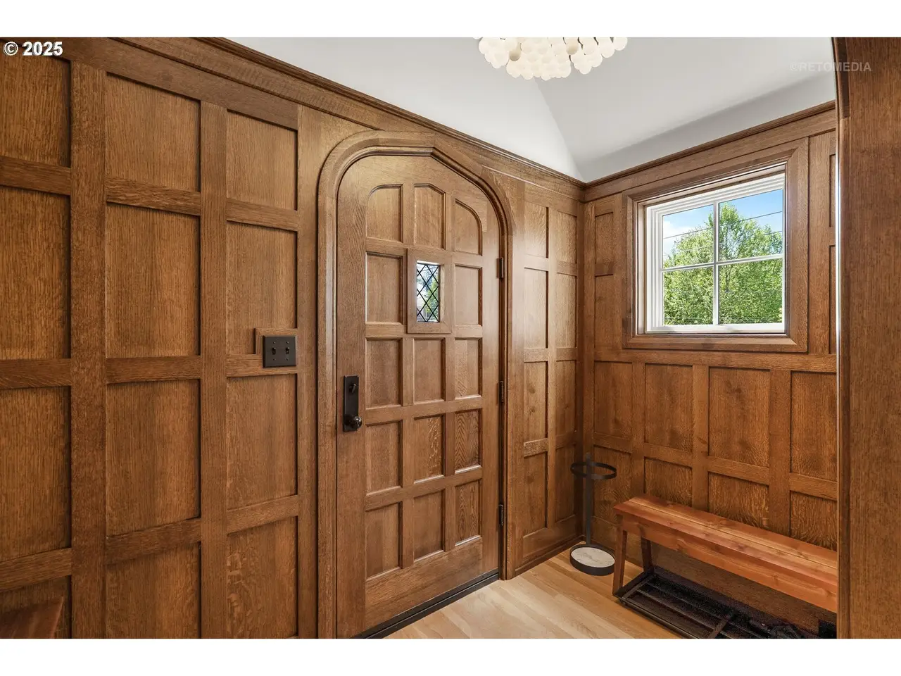 Situated on a rare double lot in Portland’s iconic Eastmoreland neighborhood, this masterfully reimagined 1927 Tudor blends historic character with luxurious, contemporary design. Following a complete studs-out renovation completed in 2021, every detail was curated to elevate both form and function — a true showcase of craftsmanship and style. Original architectural charm remains at the heart of this home, highlighted by custom millwork and handcrafted staircase railings that echo the Tudor lineage. Leaded glass windows, a stucco fireplace, and push-open cabinetry seamlessly conceal storage in the elegant living room. An architectural light fixture from the San Francisco MoMA welcomes you in the entry, while gas lanterns by Bevolo of New Orleans illuminate the front porch with timeless ambiance. The chef’s kitchen is a stunning focal point, outfitted with top-of-the-line appliances including dual Miele dishwashers, a statement LaCornue range, Fulgor wall oven, Sub-Zero refrigerator, and elegant lighting from Original BTC in England. Entertain in style with intuitive flow between kitchen, dining, and living spaces, complemented by a main floor office with custom built-ins and a refined powder room. Upstairs includes the luxurious primary suite with a walk-in closet and adjacent bedrooms reconfigured to maximize space and storage. The lower level offers a finished basement with generous ceiling height including a bonus/media room. A dedicated laundry room with custom drying racks and a full bath complete the space. Outdoors, the beautifully landscaped backyard is a private retreat with raised garden beds, blueberries, and a fenced pumpkin patch. Included with the property is the adjacent lot, bringing the combined property size to an impressive 10,000 sq ft — a rare and valuable find in this established neighborhood. With a 50-year Presidential roof and every detail carefully considered, this Eastmoreland gem offers historic elegance paired with modern livability. [Home Energy Score = 4. HES Report at https://rpt.greenbuildingregistry.com/hes/OR10238881]