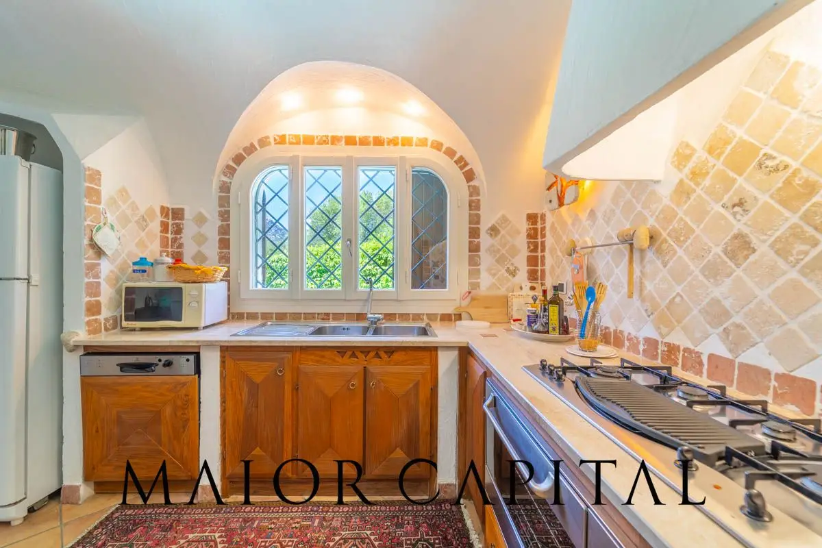 As soon as you walk through the front gate, you are greeted by a private, well-kept park leading to the villa's two main entrances. Upon entering, the large living room will impress you with its characteristic Costa Smeralda architecture, with a masonry sofa embellished with luxurious cushions and niches with wrought-iron details.