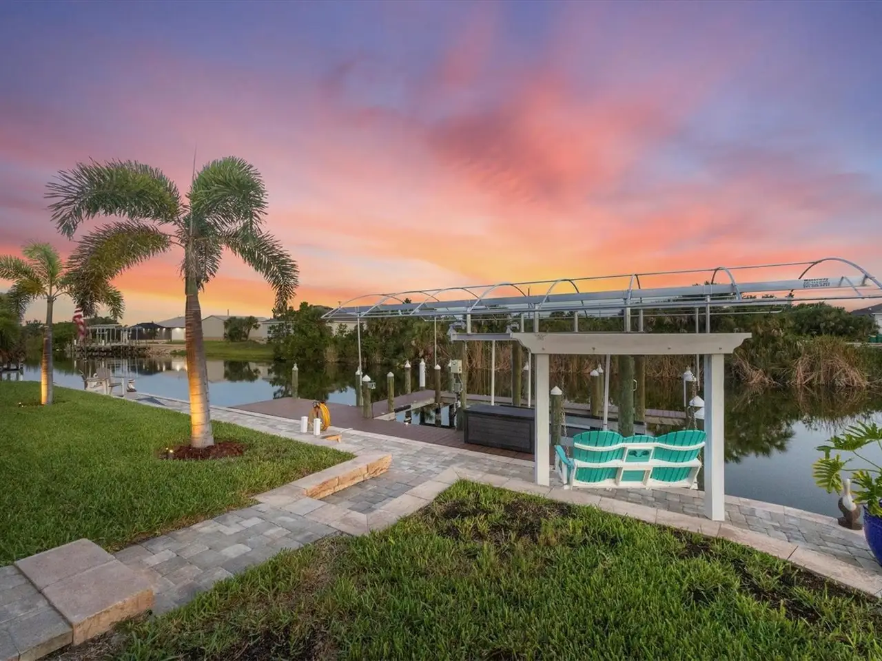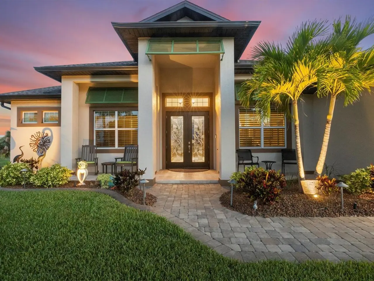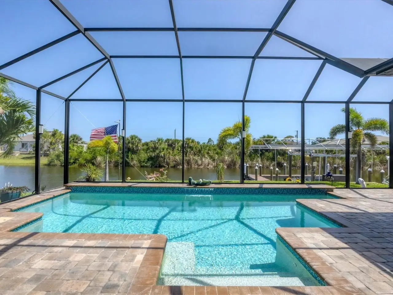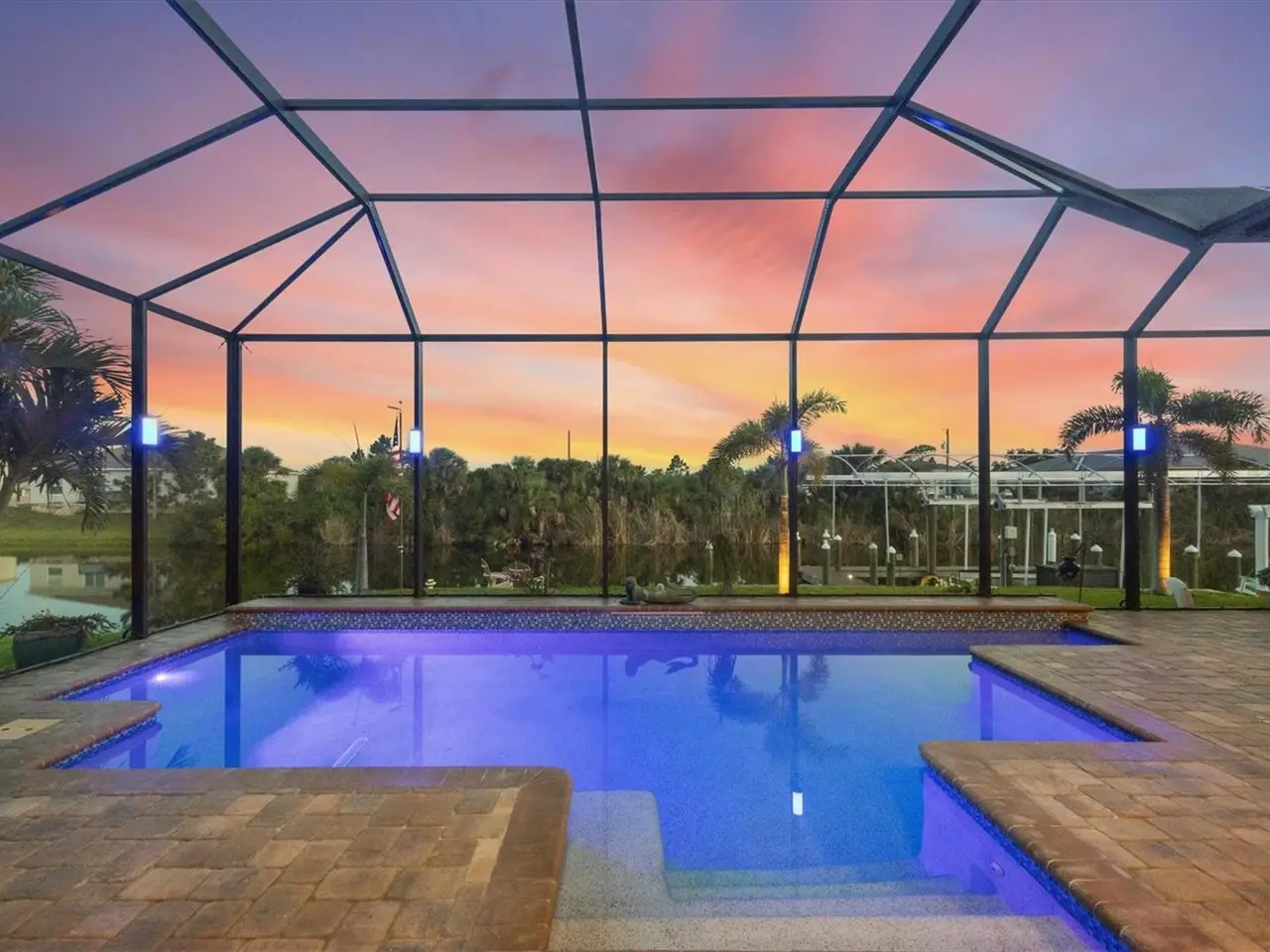 Tucked in a serene Florida waterfront community, this elegant 3-bedroom, 2-bath custom home is the perfect blend of luxury, comfort, and smart design. From the moment you arrive, it’s clear that every inch of this property has been thoughtfully crafted—from the paver driveway and travertine entrance to the gorgeous etched glass double doors that make a striking first impression. Inside, you’re greeted by rich wood-look tile flooring, custom tray ceilings, and a welcoming open layout that flows effortlessly from room to room. The living space is bright and open, with oversized sliders framing stunning water views that never get old. Whether you’re hosting a holiday party or simply relaxing by the electric fireplace with family, this home makes it easy to live beautifully. And the kitchen? It’s a chef’s dream. With a massive 9-foot quartz island, an Electrolux 5-burner induction cooktop, wall ovens, an oversized refrigerator/freezer, and high-end fixtures, cooking becomes a joy — not a chore. You’ll find yourself gathering here often, whether for morning coffee or sunset hors d'oeuvres. The primary suite is a peaceful retreat. Wake up to water views and step directly out to the lanai. The spa-style en-suite bathroom features an oversized walk-through shower, dual vanities, and a 13x8 walk-in closet so spacious it could be its own room. Across the home, two guest bedrooms ensure privacy and comfort for family or visitors. Step out onto the lanai and your private resort awaits. A heated saltwater pool with a soothing water feature invites you in for a dip. Entertain at the fully equipped summer kitchen with a Webber Summit grill and expansive bar space—perfect for laid-back evenings with friends. New pool screens installed in 2023 keep everything fresh and beautiful. And when a storm rolls in? Just press a button—automatic hurricane shutters protect everything, no need to move a single chair. As the sun sets, stroll down the lighted captain’s walk to your private 16-foot composite dock, complete with water and electric hookups and a walk-around 10,000 lb. boat lift—making every boat day easy and effortless. This home is not just beautiful, it’s built for peace of mind. From impact-resistant glass and electric shutters to Icynene insulation, Nest smart home features, and a newly painted exterior (2023), it’s as smart and secure as it is stunning. There are too many extras to list—but one walk through will show you: this is more than a home, it’s a lifestyle. Schedule your private tour today and experience the very best in Florida luxury living.