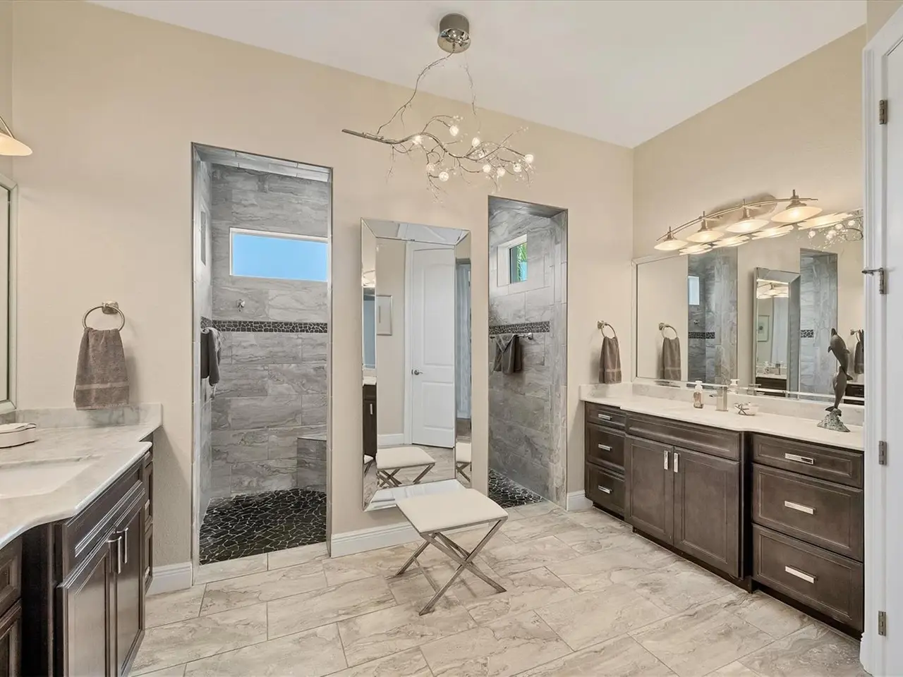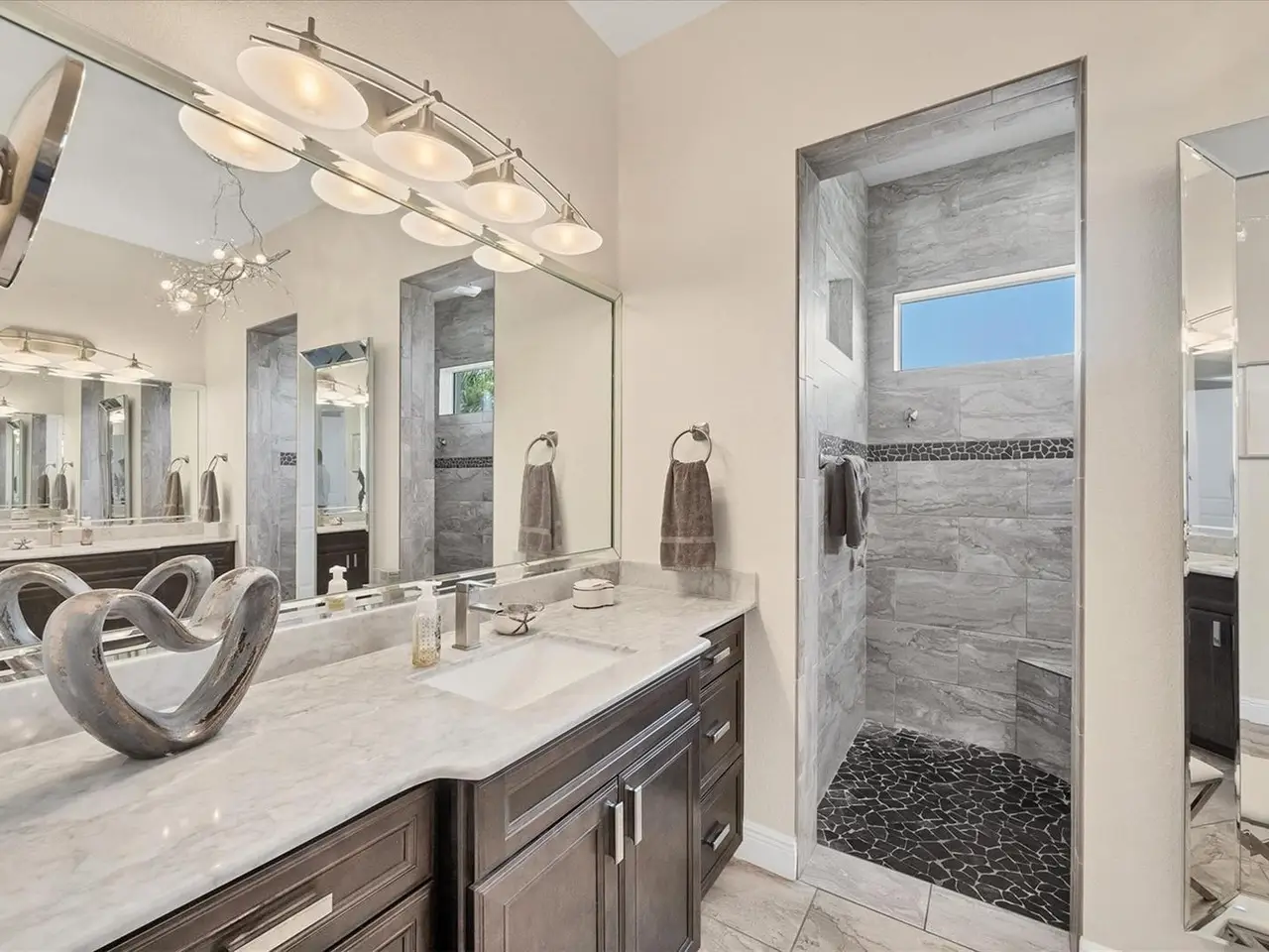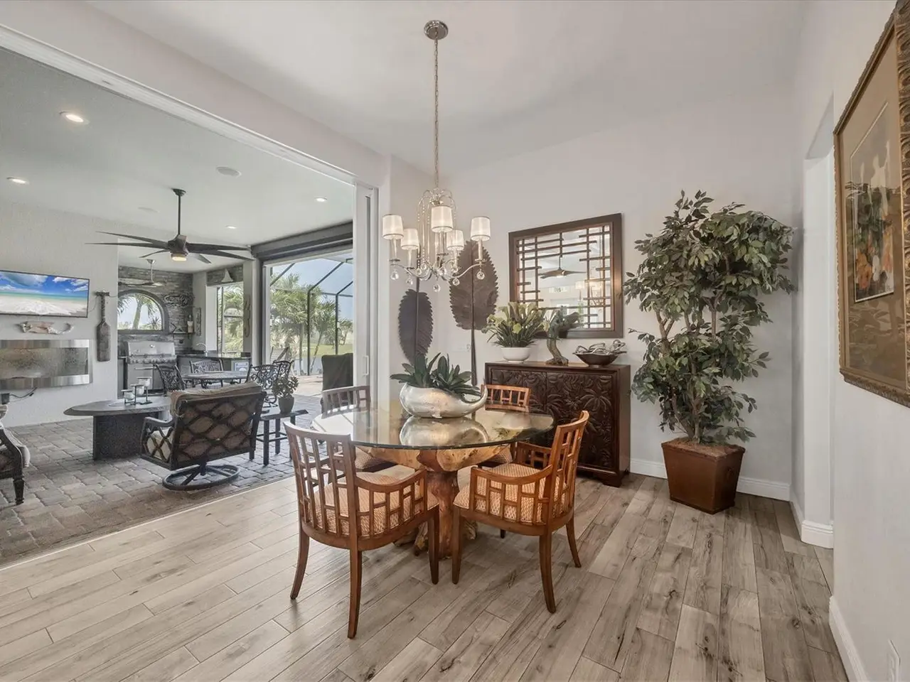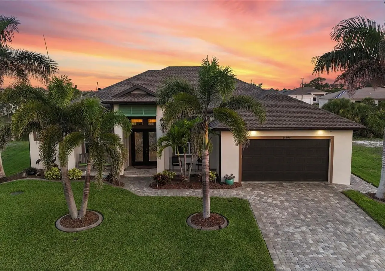 Tucked in a serene Florida waterfront community, this elegant 3-bedroom, 2-bath custom home is the perfect blend of luxury, comfort, and smart design. From the moment you arrive, it’s clear that every inch of this property has been thoughtfully crafted—from the paver driveway and travertine entrance to the gorgeous etched glass double doors that make a striking first impression. Inside, you’re greeted by rich wood-look tile flooring, custom tray ceilings, and a welcoming open layout that flows effortlessly from room to room. The living space is bright and open, with oversized sliders framing stunning water views that never get old. Whether you’re hosting a holiday party or simply relaxing by the electric fireplace with family, this home makes it easy to live beautifully. And the kitchen? It’s a chef’s dream. With a massive 9-foot quartz island, an Electrolux 5-burner induction cooktop, wall ovens, an oversized refrigerator/freezer, and high-end fixtures, cooking becomes a joy — not a chore. You’ll find yourself gathering here often, whether for morning coffee or sunset hors d'oeuvres. The primary suite is a peaceful retreat. Wake up to water views and step directly out to the lanai. The spa-style en-suite bathroom features an oversized walk-through shower, dual vanities, and a 13x8 walk-in closet so spacious it could be its own room. Across the home, two guest bedrooms ensure privacy and comfort for family or visitors. Step out onto the lanai and your private resort awaits. A heated saltwater pool with a soothing water feature invites you in for a dip. Entertain at the fully equipped summer kitchen with a Webber Summit grill and expansive bar space—perfect for laid-back evenings with friends. New pool screens installed in 2023 keep everything fresh and beautiful. And when a storm rolls in? Just press a button—automatic hurricane shutters protect everything, no need to move a single chair. As the sun sets, stroll down the lighted captain’s walk to your private 16-foot composite dock, complete with water and electric hookups and a walk-around 10,000 lb. boat lift—making every boat day easy and effortless. This home is not just beautiful, it’s built for peace of mind. From impact-resistant glass and electric shutters to Icynene insulation, Nest smart home features, and a newly painted exterior (2023), it’s as smart and secure as it is stunning. There are too many extras to list—but one walk through will show you: this is more than a home, it’s a lifestyle. Schedule your private tour today and experience the very best in Florida luxury living.