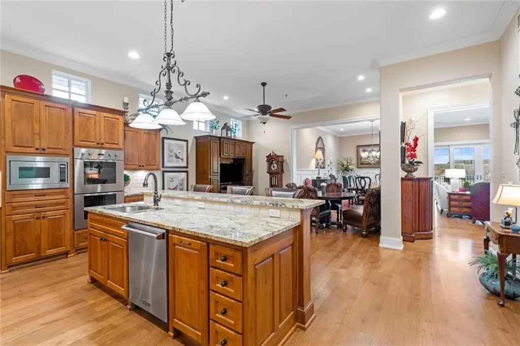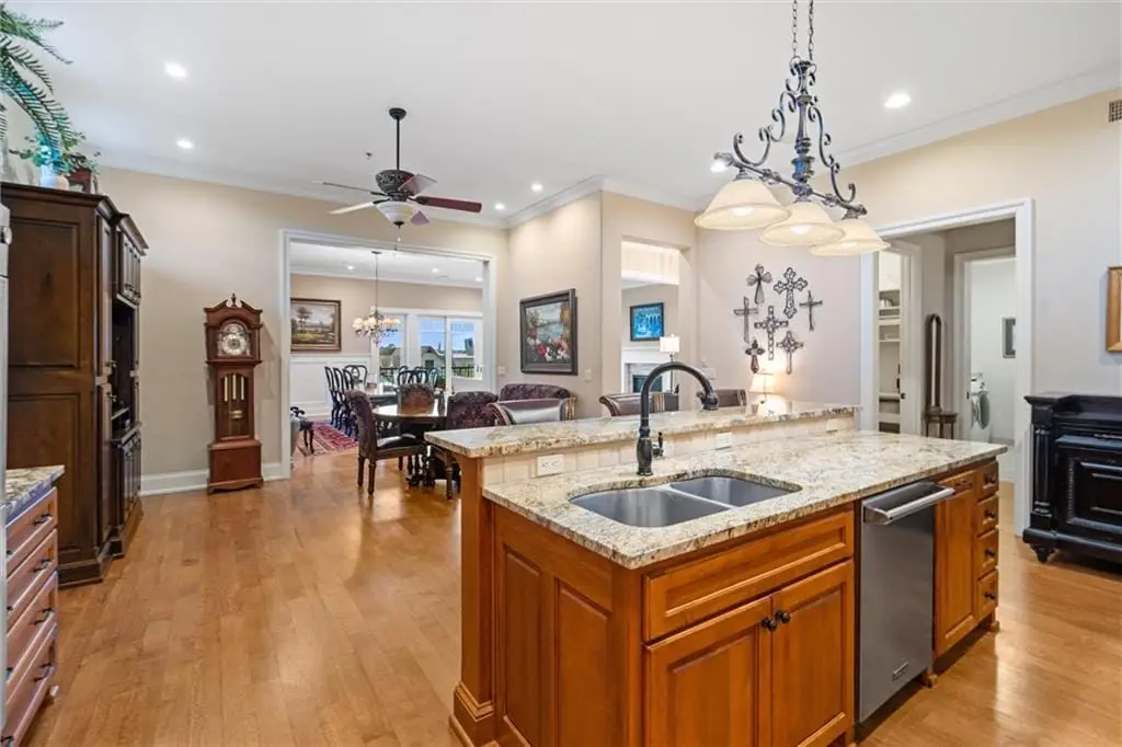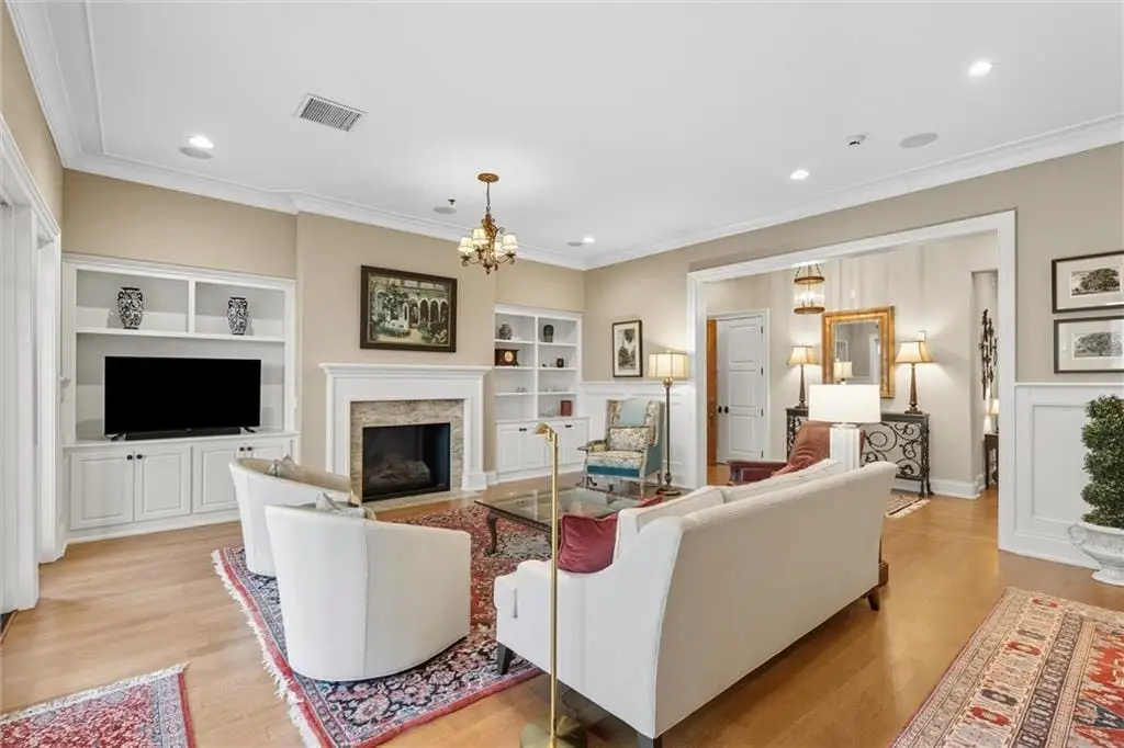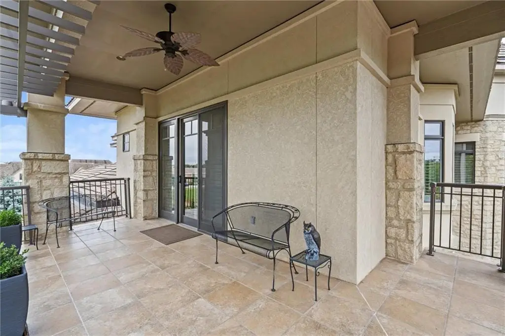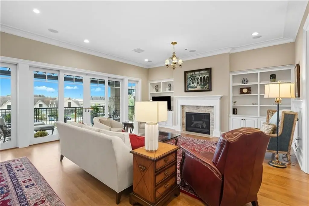 Stunning Top-Floor Condo in Highly Sought-After Parkway 133. This light-filled, top-floor condo offers luxury living with balconies on two sides of the building. From the moment you enter, youre greeted by soaring 10.5-foot ceilings and gleaming hardwood floors that flow throughout the home.The spacious great room features custom built-ins, a gas fireplace, crown molding, and access to a large balcony with remote-control shades. The formal dining room is enhanced with beautiful wainscoting, perfect for entertaining.The eat-in kitchen is a chefs dreamfeaturing a large center island, Viking stainless steel appliances including a gas cooktop, double oven, microwave, dishwasher, and refrigerator. Additional highlights include soft-close cabinetry, granite countertops, and a generous walk-in pantry with pull-out shelves.The luxurious primary suite offers a private balcony for enjoying morning sunrises, a large walk-in California closet, and a spa-inspired bath with separate granite-topped vanities, an all-tile shower with dual heads, a whirlpool tub, pocket door, and abundant storage. The second bedroom includes its own private bath with granite counters, tile flooring, and a shower. Both bedrooms feature custom plantation shutters.The den/office includes built-ins and a separate hallway exit for added safety. The laundry room provides excellent function with a sink, solid-surface counter for folding, plenty of cabinetry, and includes the washer and dryer.Additional highlights include two parking spaces in the heated garage and driveway, a private storage unit, and a newer HVAC system. The HOA covers gas, water, and trash. The balconies provide 648 sq ft of outdoor living space. Dont miss this rare opportunity to own a top-floor residence in Parkway 133where location meets convenience with easy access to shopping, dining, walking trails, and major highways.