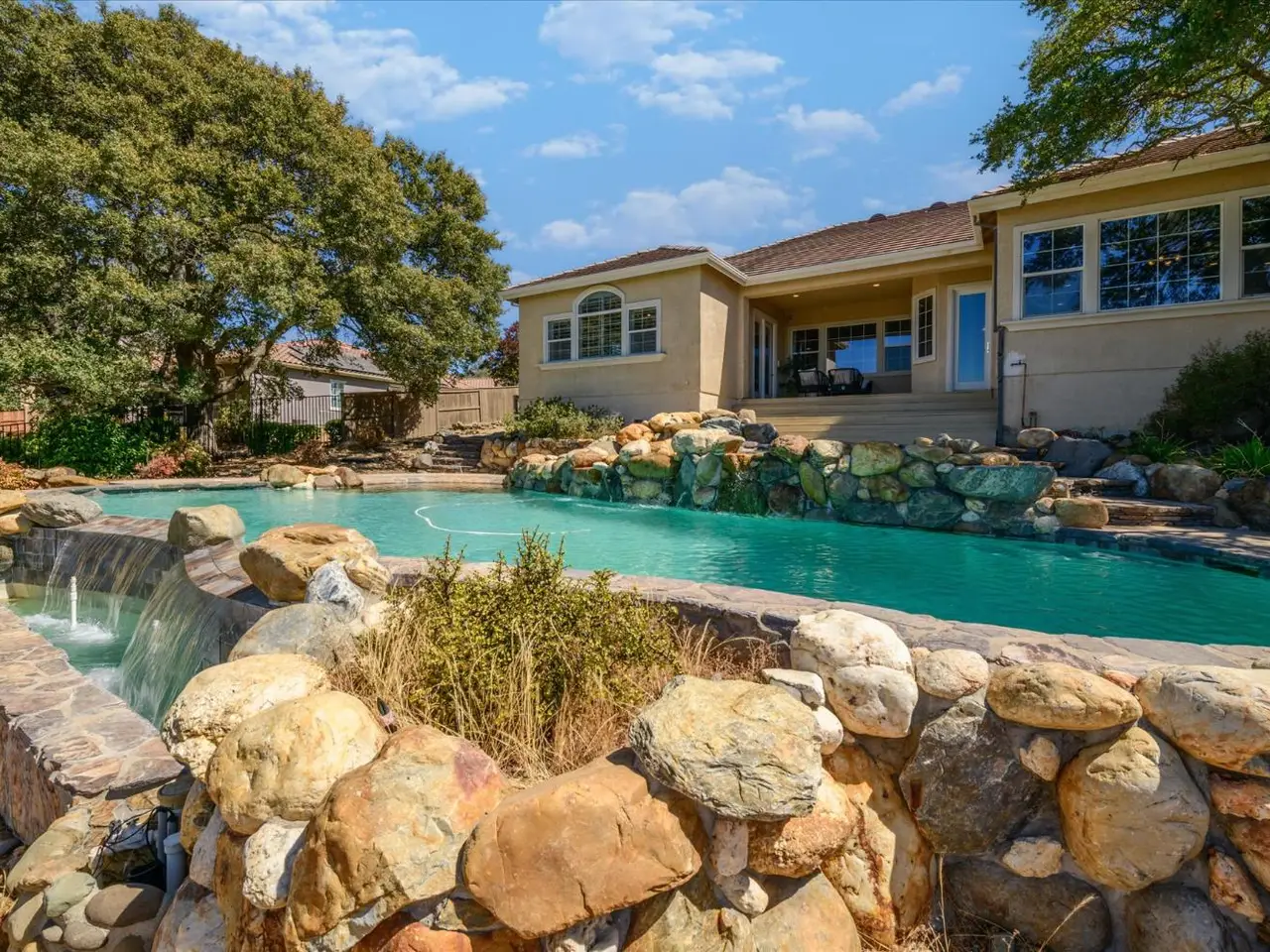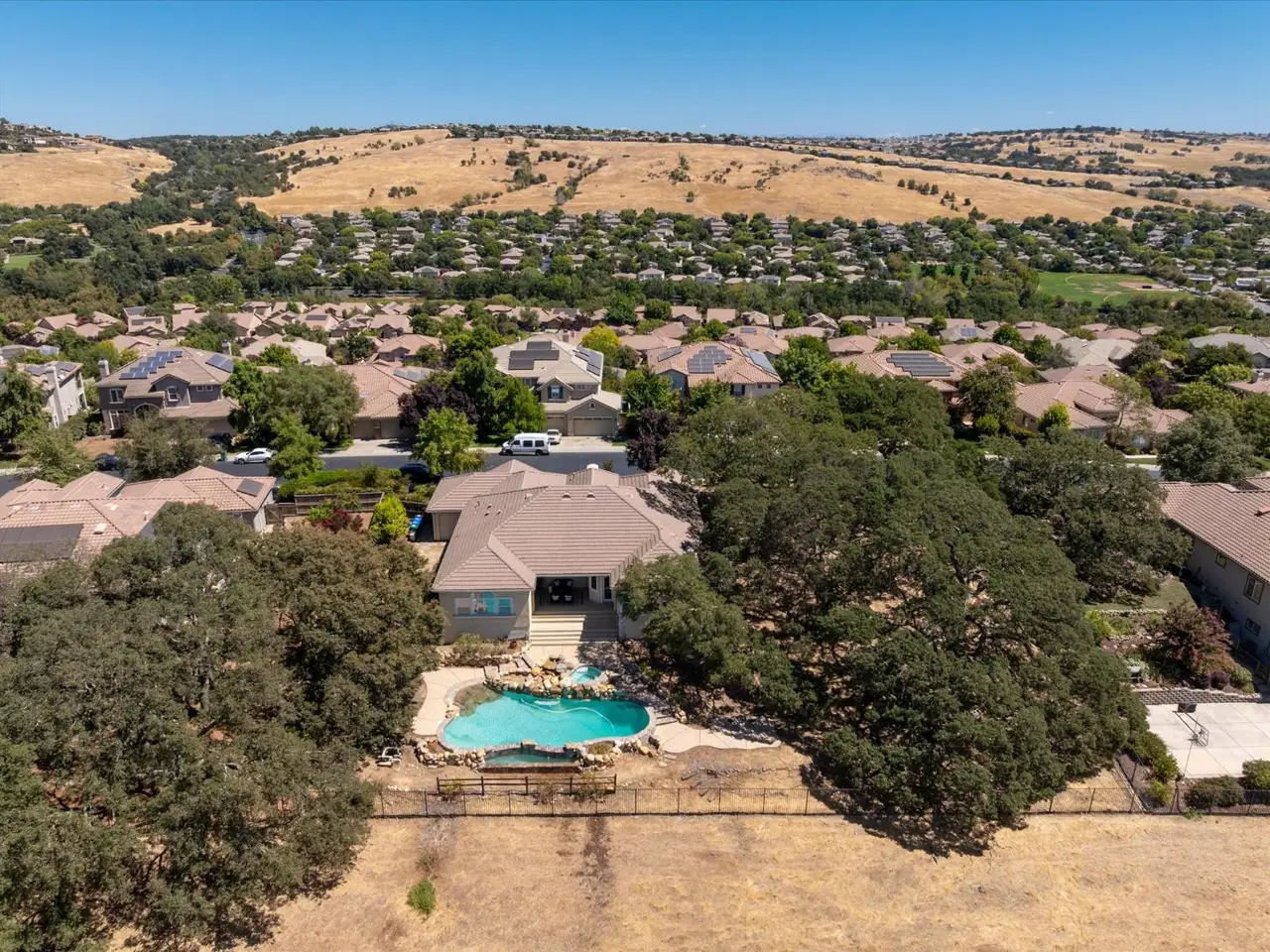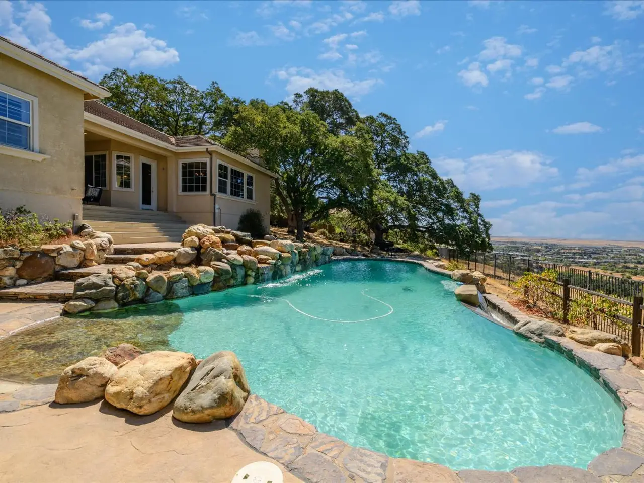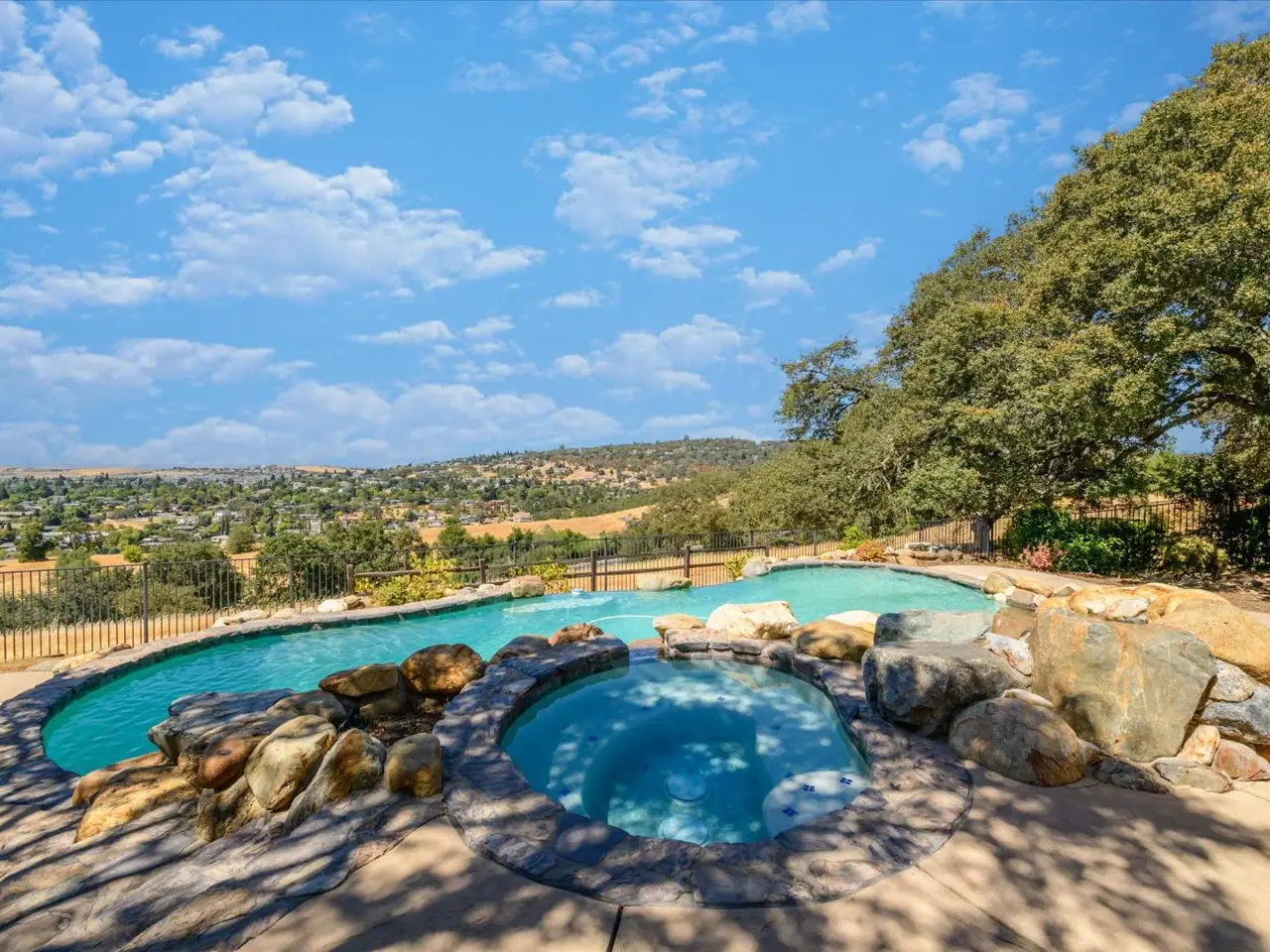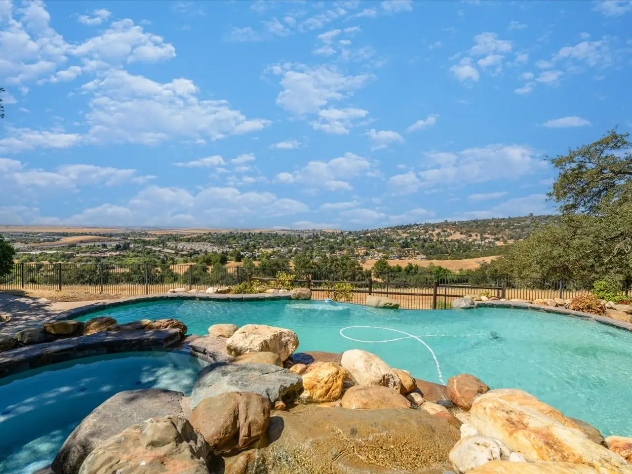 Welcome to your private retreat in the prestigious gated community of Serrano, where luxury living meets breathtaking scenery. This elegant single-story residence sits on a tranquil .57-acre lot shaded by mature oaks, offering unmatched privacy and serenity. Designed for both relaxation and entertaining, the home's open layout showcases a chef's kitchen with granite counters, stainless appliances, and a grand center island that opens to a spacious great room, while a formal living and dining room provide the perfect setting for entertaining with style. Expansive windows frame panoramic views of El Dorado Hills and the Sacramento Valley, filling the home with natural light. The primary suite is a true sanctuary, with direct deck access, a spa-inspired bath, and sweeping valley vistas. Outside, discover your resort-style escape with a sparkling infinity-edge pool, beach entry, and spa, where sunsets become your daily backdrop. A dedicated office or workout space, three bedrooms, and a rare 4-car garage complete the home's thoughtful design. Located in the highly desirable Oak Ridge High School district and surrounded by Serrano's trails, parks, and golf, this is more than a home - it's a lifestyle.
