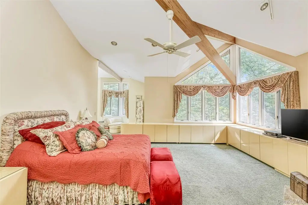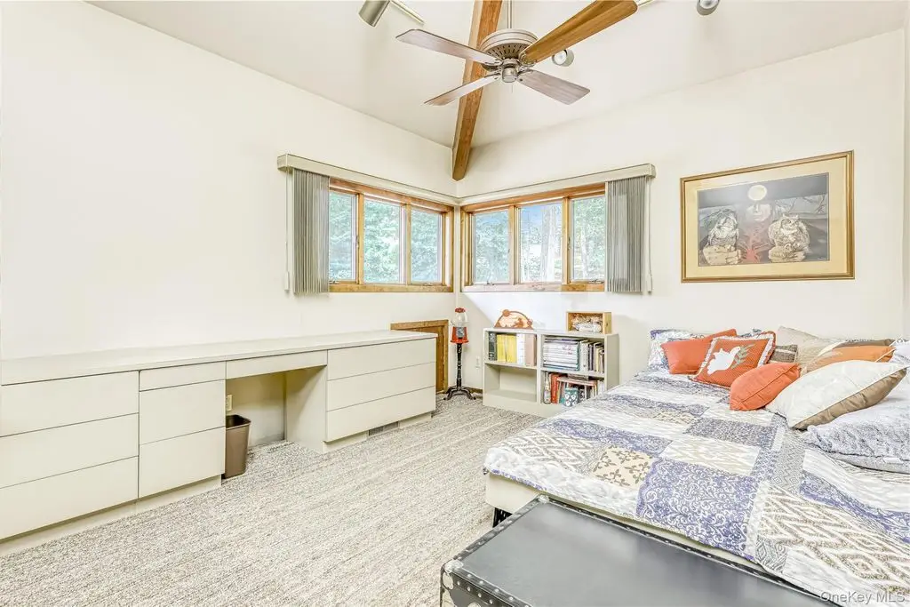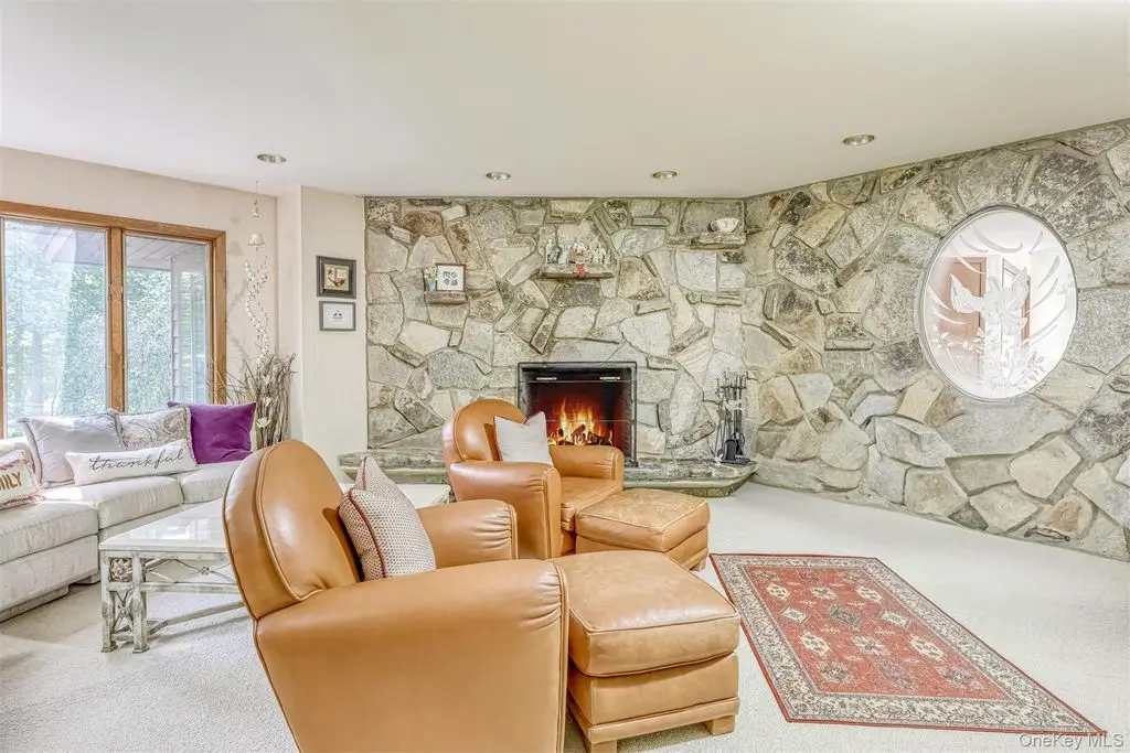 Stunning Mid-Century Modern Masterpiece Inspired by the iconic style of Frank Lloyd Wright, this home showcases timeless horizontal lines, an open floor plan, and seamless integration with the natural surroundings. Set on 1.84 acres of park-like property with a beautiful pond, this private retreat is located in the heart of New City with easy access to the Palisades Parkway. The dramatic sun-filled entry opens to 5 bedrooms and four baths, including an expansive primary suite with gas fireplace, spa-like bath with steam shower, and Jacuzzi tub. Walls of windows flood the chef's kitchen, breakfast area, and butlers pantry with light, framing serene backyard views. Enjoy multiple fireplacesincluding one in the living room and a wood-burning stove in the basementplus a finished walk-out lower level featuring a home gym, billiard room, bedroom, full bath, cedar closet, storage room and private patio. Outdoor living is elevated with a wraparound deck, circular driveway, whole-house generator, and two-car garage. Come visit and thoroughly enjoy this absolutely gorgeous home!
