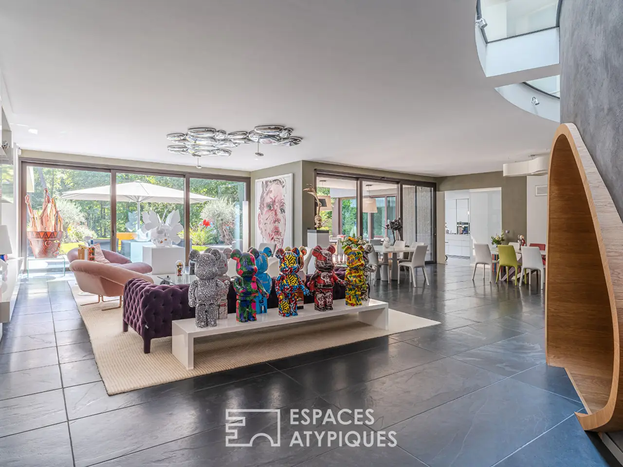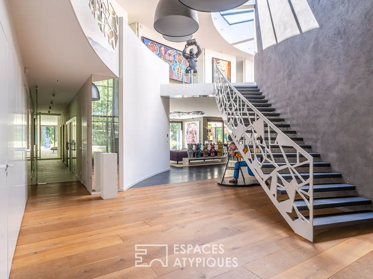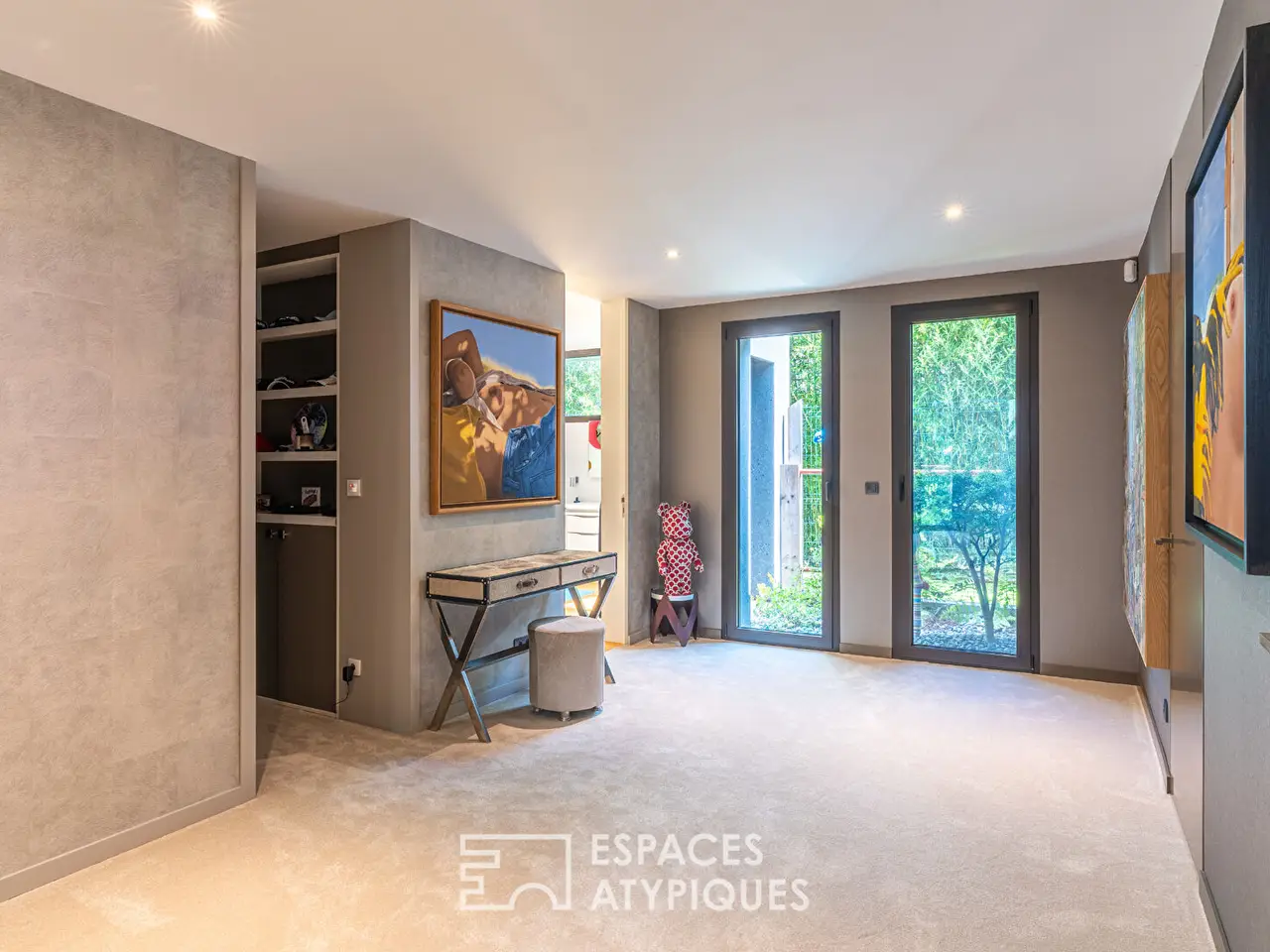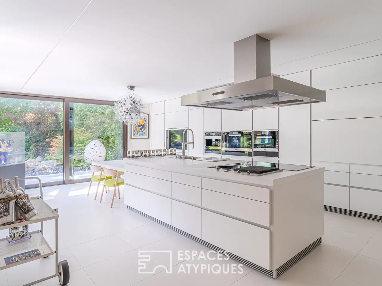 Nestled in a privileged setting on the outskirts of Haguenau, this architect-designed villa of 905 m², built in 2014, unfolds in complete privacy on a 7,500 m² landscaped park. With a distinctly contemporary inspiration, it stands out for its very high-end finishes and perfect integration into its natural surroundings. The ground floor is organized around a majestic 118 m² living space, where natural light enhances the generous volumes. It adjoins a 47 m² Bulthaup dining kitchen accompanied by a large wine cellar. From the living room, a bold and sculptural opening leads to an immersive cocoon: a private cinema room for unforgettable evenings. This level also features a luxurious master suite of over 90 m², complete with a dressing room and bathroom. The choice of noble materials and meticulous attention to detail reflect a rare level of excellence. A monumental staircase leads to the upper floor, which distributes the sleeping areas with five suites, two offices, a laundry room, and a dojo. Complementing this, a 200 m² wellness area reminiscent of a luxury hotel spa includes an indoor pool, sauna, hammam, and gym, creating a living space designed for absolute comfort. The outdoor spaces have been conceived as a natural extension of the home. Adorned with bicentennial olive trees and centennial Japanese maples, the carefully landscaped park and its large 100 m² terrace invite tranquility. A green roof and solar panels emphasize an environmentally conscious design. Situated in a quiet area near a forest, the villa benefits from quick access to shops and schools. This exceptional property, a signature of prestigious real estate, embodies a rare combination of architectural luxury and constant dialogue with nature. A truly unique home offering an extraordinary living experience. REFERENCE: 1656 Additional Information: 10 rooms 6 bedrooms 3 bathrooms 4 shower rooms 1 floor Land area: 7,500 m² Parking: 6 spaces Property tax: €5,889 Energy Performance Diagnostics: Primary energy consumption: B – 74 kWh/m²/year Extremely energy-efficient property CO₂ emissions: 2 kg CO₂/m²/year Very low CO₂ emissions Estimated average annual energy costs for standard use, indexed for 2021, 2022, 2023: €4,790 – €6,530 (including subscription) Agency Fees: All fees are VAT-inclusive and borne by the seller Mediator: Mediation Franchise-Consumers www.mediation-franchise.com 29 Boulevard de Courcelles, 75008 Paris Information on risks related to this property is available at: www.georisques.gouv.fr
