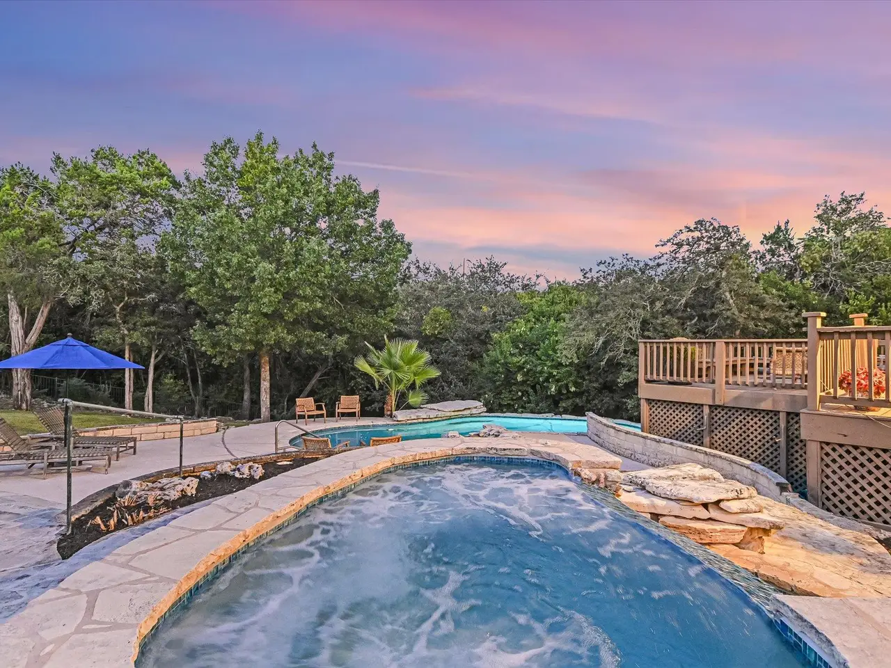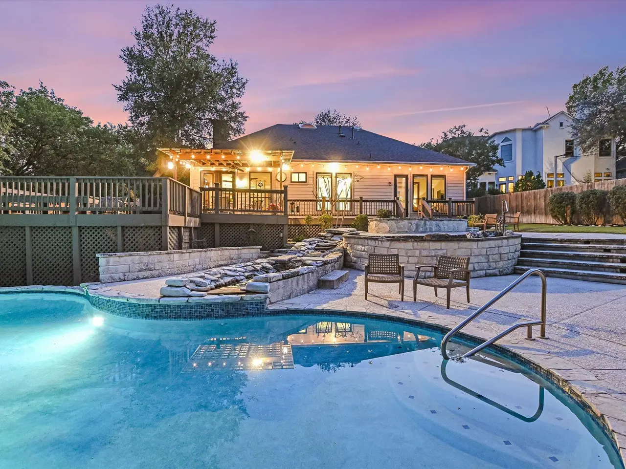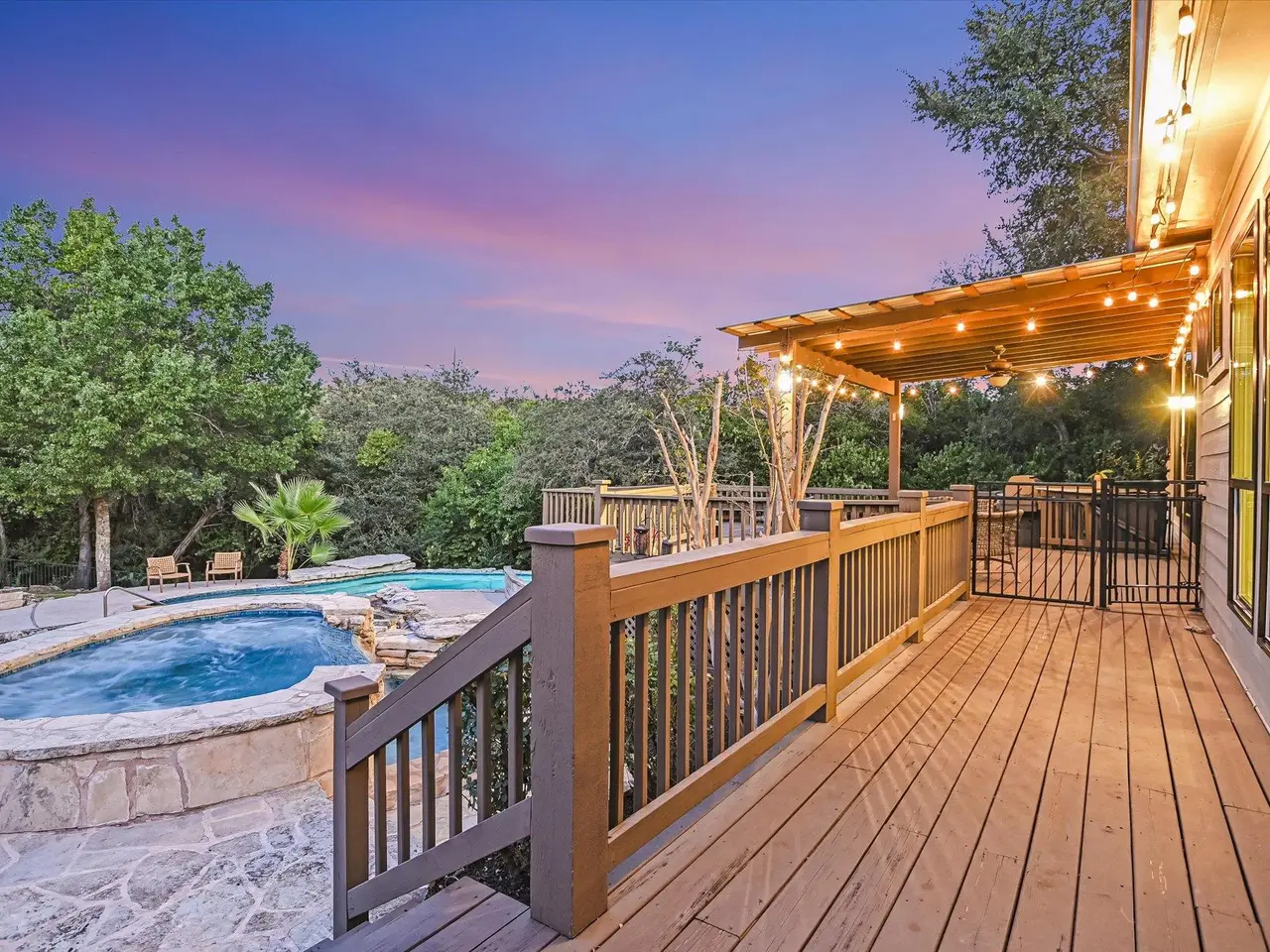 Well-maintained and updated home on iconic Mount Bonnell Rd, bordering the Bright Leaf Preserve with grandfathered private park and Lake Austin access via Mount Bonnell Shores Colorado Crossing park--no HOA dues required. Upgrades include a custom 6' stone wall with gated entry, extended paver driveway, and 8' garage extension. Inside features hardwood flooring, open living/dining, updated kitchen with gas cooktop, white cabinetry, and double ovens. Primary suite opens to a full-length back deck leading to a resurfaced pool/spa (2021). Spa-like primary bath, built-ins in living room, and updated lighting throughout.Major systems include: new windows (2024), new roof & skylights (2023), HVAC (2015), spray attic insulation. The walkable attic offers conversion potential for added square footage or an apartment. A rare Austin property blending privacy and functionality.