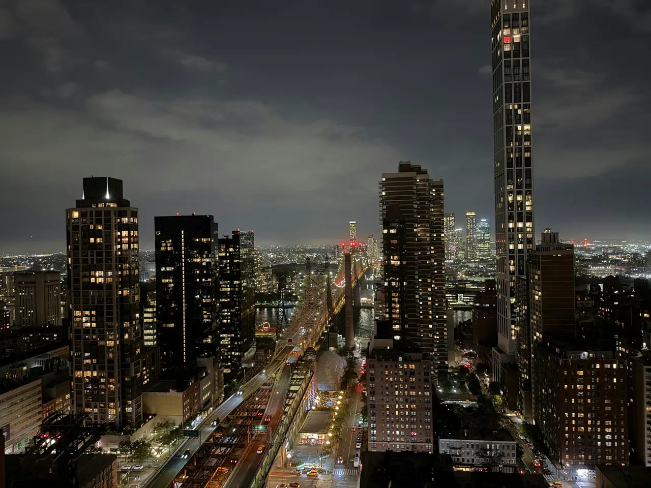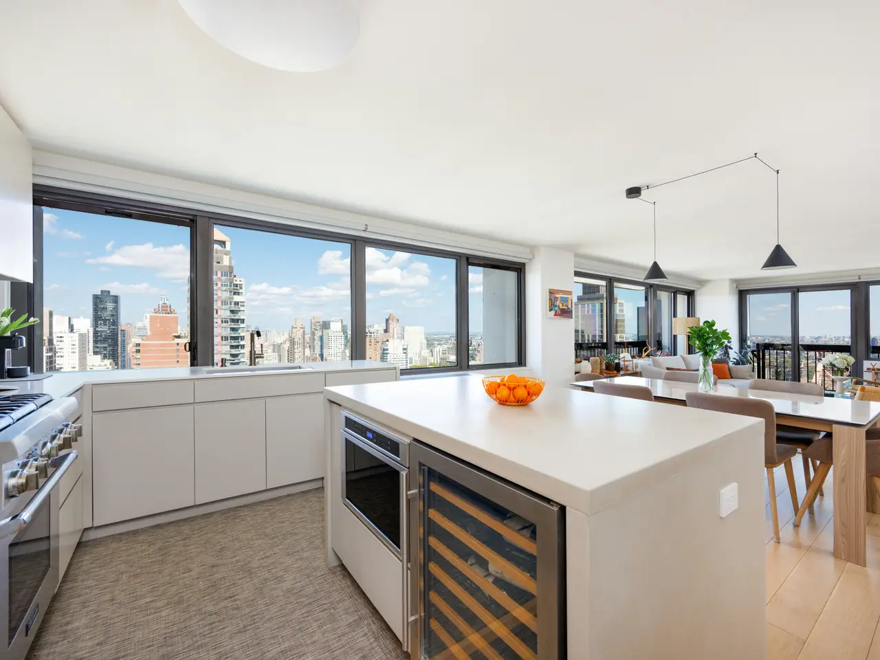 A Published Masterpiece in the Sky  Perched on the coveted northeast corner of the 35th floor, this residence is offered for the first time since its masterful designer renovation by Sarah Zames & Colin Stief of General Assembly. Reimagined with a clean material palette, the home balances refined architecture with effortless livability.  Walls of glass frame panoramic views across the ever-changing East Side skyline, creating a home of many moods and scenes. With balconies on both sides of the apartment, the vistas can be enjoyed from the outdoors as well. As Dezeen observed in its feature on the residence, the architects sought "a balance between the feeling of being in the air, while being grounded by the weight of the building."  The custom kitchen is anchored by a concrete waterfall island with a built-in wine fridge and microwave drawer. Light wood cabinetry frames the Thermador suite, including a 6-burner gas cooktop and oven, Sapphire Glow dishwasher, and refrigerator with Open Door Assist- just a gentle touch opens the door, the ultimate luxury detail.  Windows line the kitchen, filling the space with light and lively city views, turning daily routines into moments of enjoyment. Honed Caesarstone counters and a sophisticated ceramic tile backsplash complete the modern design, while built-in shelving offers a stylish home for barware, vases, and everyday essentials.  The primary suite offers a serene retreat, complete with two closets plus a 14-foot walk in by California Closets. Pocket doors provide quiet separation, while custom millwork introduces floating bedside tables and subtle ledges for art or keepsakes. A unique architectural opening filters natural light between the bedroom and bath, elevating both spaces.   The ensuite is finished with a travertine vanity, soaking tub, Japanese washlet, matte black fixtures, and richly hued vertical tile, a striking marriage of warmth and refinement.  The second bedroom includes a generous closet and is enclosed by a sliding panel of reeded glass, a purposeful design choice that allows natural light to filter through while maintaining privacy. This thoughtful detail makes the room ideal not only as a bedroom but also as a home office or den. The other full bath features a stall shower, midnight cabinetry, travertine vanity, brass fixtures, and a Japanese washlet.  Additional thoughtful details include discreet TV wall behind sliding door, built-in entry storage, motorized shades, Lutron-controlled lighting, anti-UV window films, and split AC units in the bedrooms.  The Landmark is a full-service luxury building offering a modern lobby, landscaped roof deck, garage with Zipcar, and on-floor washer/dryer access. Two dogs or cats are welcome per apartment!