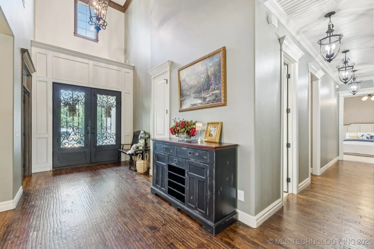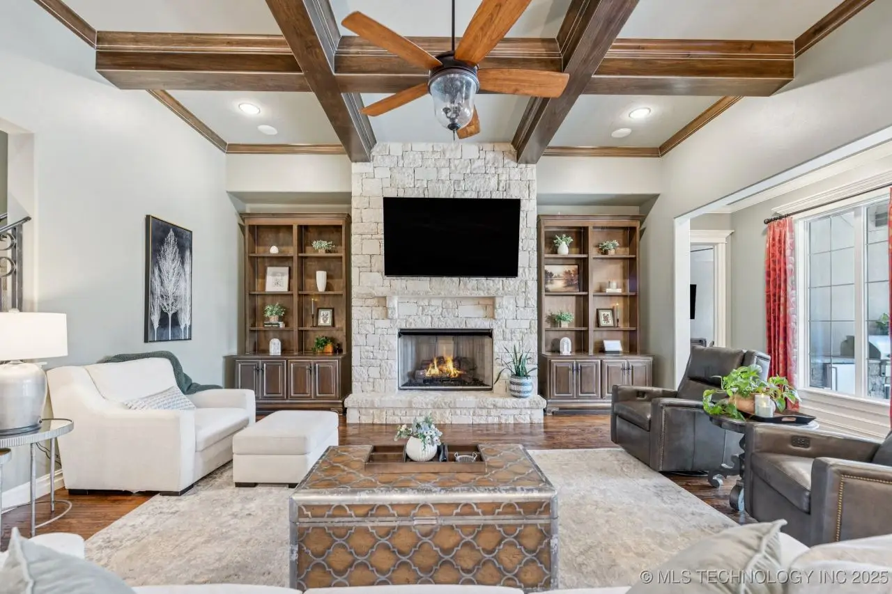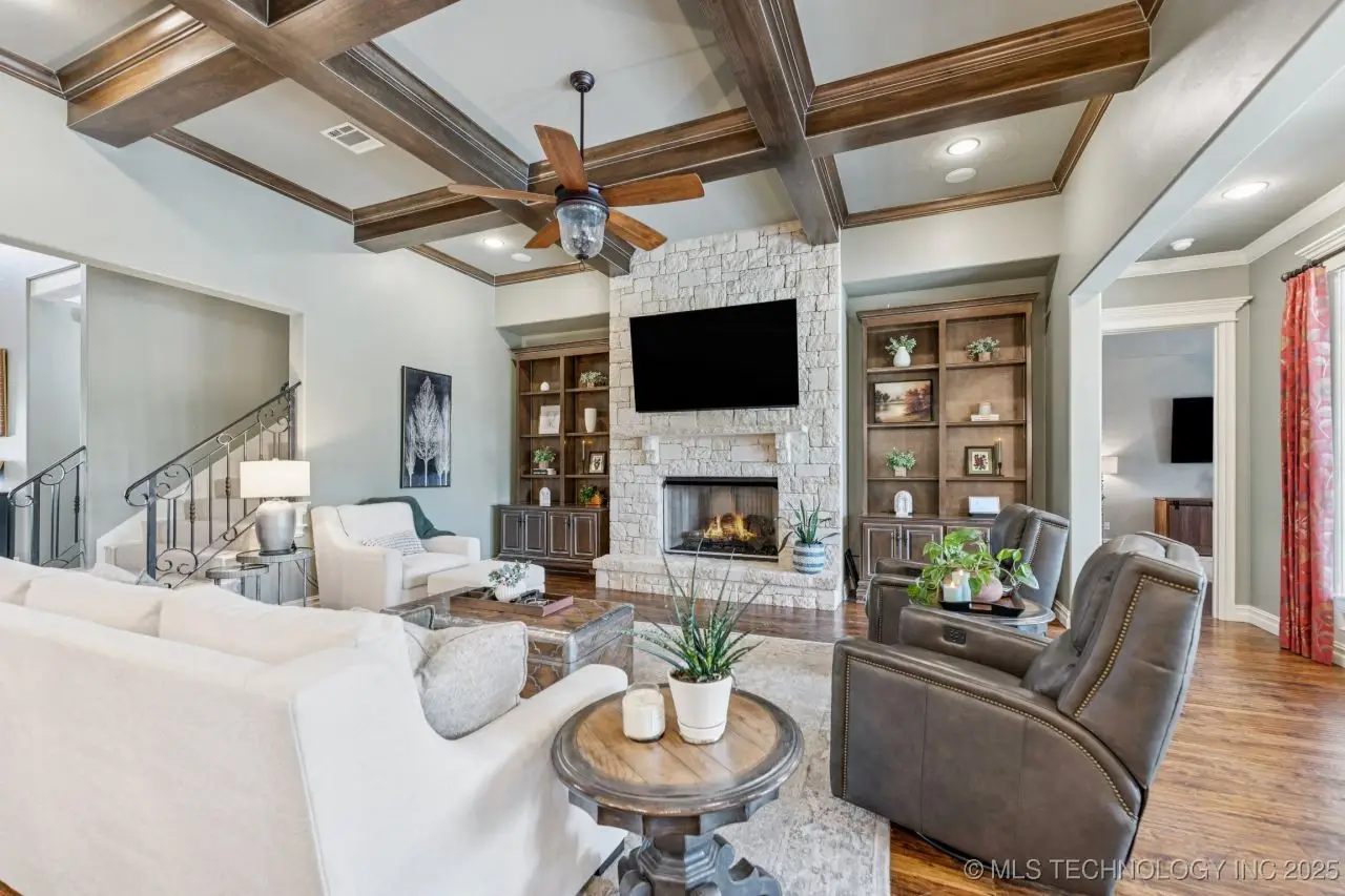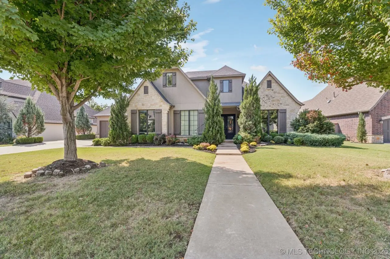 Stunning luxury home in the highly sought-after Jenks School District offering over 5100 (AP) sq ft of beautifully designed living space. This gorgeous home features 4 bedrooms, 3 full and 2 half baths along with two separate 2-car garages for a total of 4-car parking. The expansive primary suite offers wood floors, vaulted & beamed ceiling and a spa-like bathroom with dual vanities, dual closets, an oversized frameless shower with multiple shower heads including a rainfall feature, and a separate jacuzzi tub for a serene retreat feel. The large guest suite is also located downstairs, perfect for in-laws or long-term visitors with privacy & separate "secret" garage entrance. The open-concept family room features a striking stone fireplace flanked by custom built-ins and flows seamlessly into the gourmet kitchen and spacious breakfast nook. Formal dining and a private office add to the home's versatility. Elegant hardwood floors, coffered ceilings, and extensive trim highlight the craftsmanship throughout. A large 2 story entry leads to an extra wide staircase where upstairs you'll find a large gameroom with closets leading to a separate homework/office/hobby hub, plus two oversized bedrooms with a walkthru pullman bath, an additional half bath and an oversized theater room with large wet bar, microwave, and refrigerator. The backyard is designed for entertaining with a covered patio, extended pergola, outdoor fireplace, inground gunite pool plus waterfall spa, all surrounded by mature trees for privacy. Additional features include full foam insulation, a whole-home generator, water filtration system, tornado safe room, 4 HVAC units and a backyard dog run area. Exceptional design, abundant amenities, and an incredible location make this home a rare find.