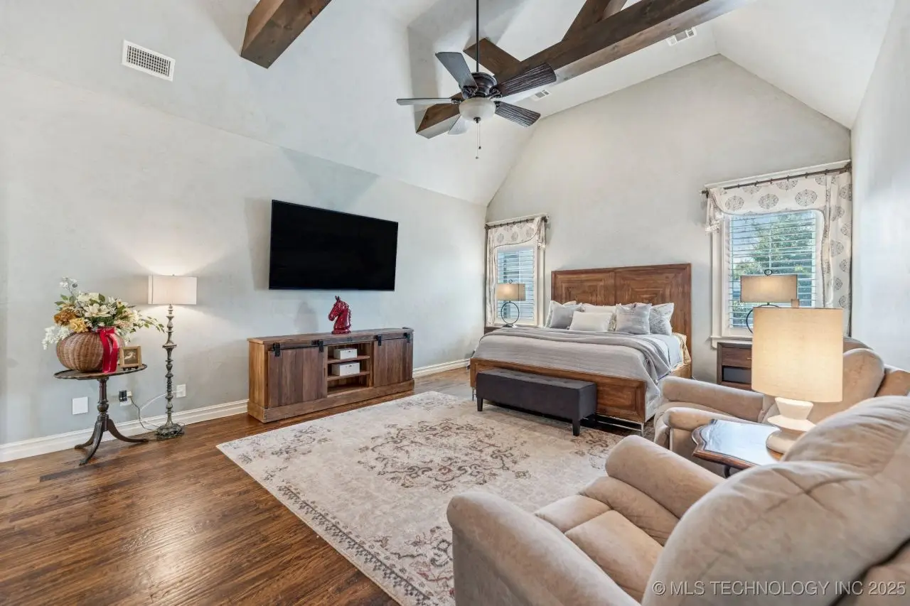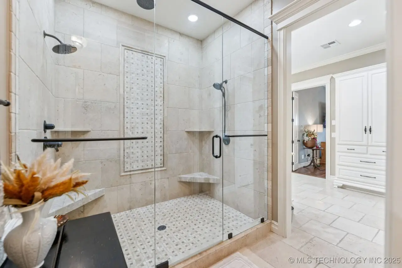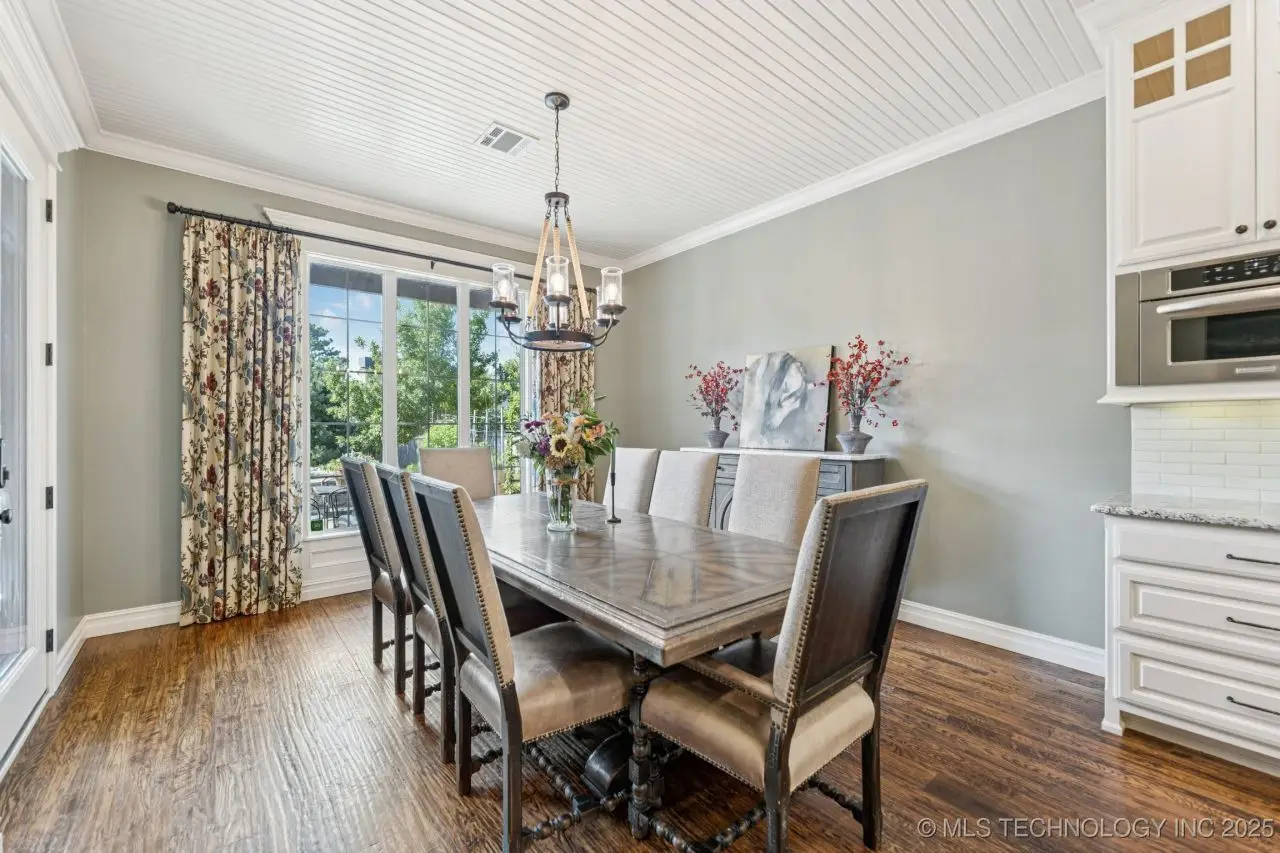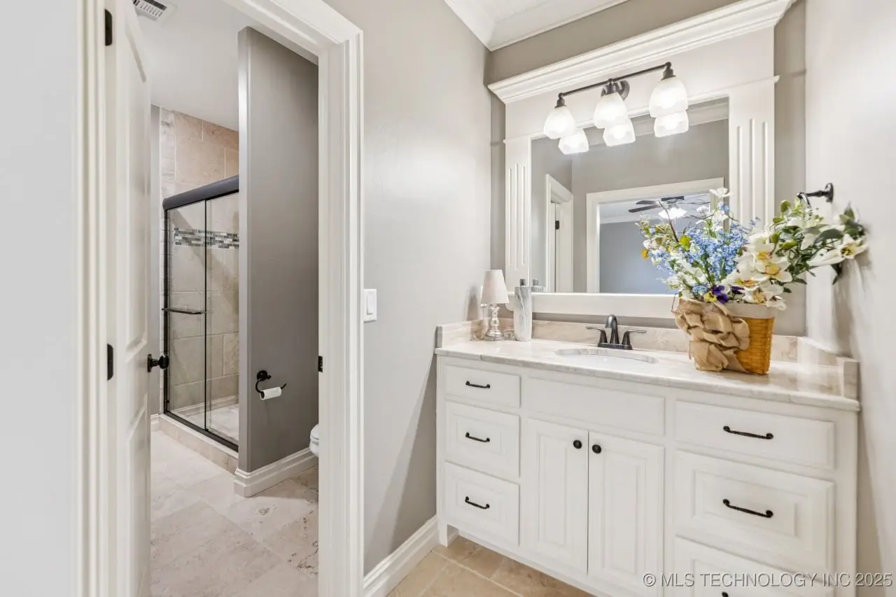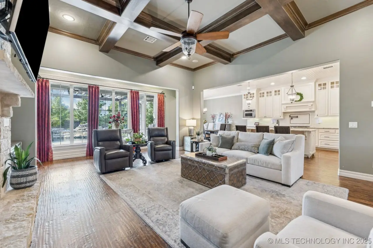 Stunning luxury home in the highly sought-after Jenks School District offering over 5100 (AP) sq ft of beautifully designed living space. This gorgeous home features 4 bedrooms, 3 full and 2 half baths along with two separate 2-car garages for a total of 4-car parking. The expansive primary suite offers wood floors, vaulted & beamed ceiling and a spa-like bathroom with dual vanities, dual closets, an oversized frameless shower with multiple shower heads including a rainfall feature, and a separate jacuzzi tub for a serene retreat feel. The large guest suite is also located downstairs, perfect for in-laws or long-term visitors with privacy & separate "secret" garage entrance. The open-concept family room features a striking stone fireplace flanked by custom built-ins and flows seamlessly into the gourmet kitchen and spacious breakfast nook. Formal dining and a private office add to the home's versatility. Elegant hardwood floors, coffered ceilings, and extensive trim highlight the craftsmanship throughout. A large 2 story entry leads to an extra wide staircase where upstairs you'll find a large gameroom with closets leading to a separate homework/office/hobby hub, plus two oversized bedrooms with a walkthru pullman bath, an additional half bath and an oversized theater room with large wet bar, microwave, and refrigerator. The backyard is designed for entertaining with a covered patio, extended pergola, outdoor fireplace, inground gunite pool plus waterfall spa, all surrounded by mature trees for privacy. Additional features include full foam insulation, a whole-home generator, water filtration system, tornado safe room, 4 HVAC units and a backyard dog run area. Exceptional design, abundant amenities, and an incredible location make this home a rare find.
