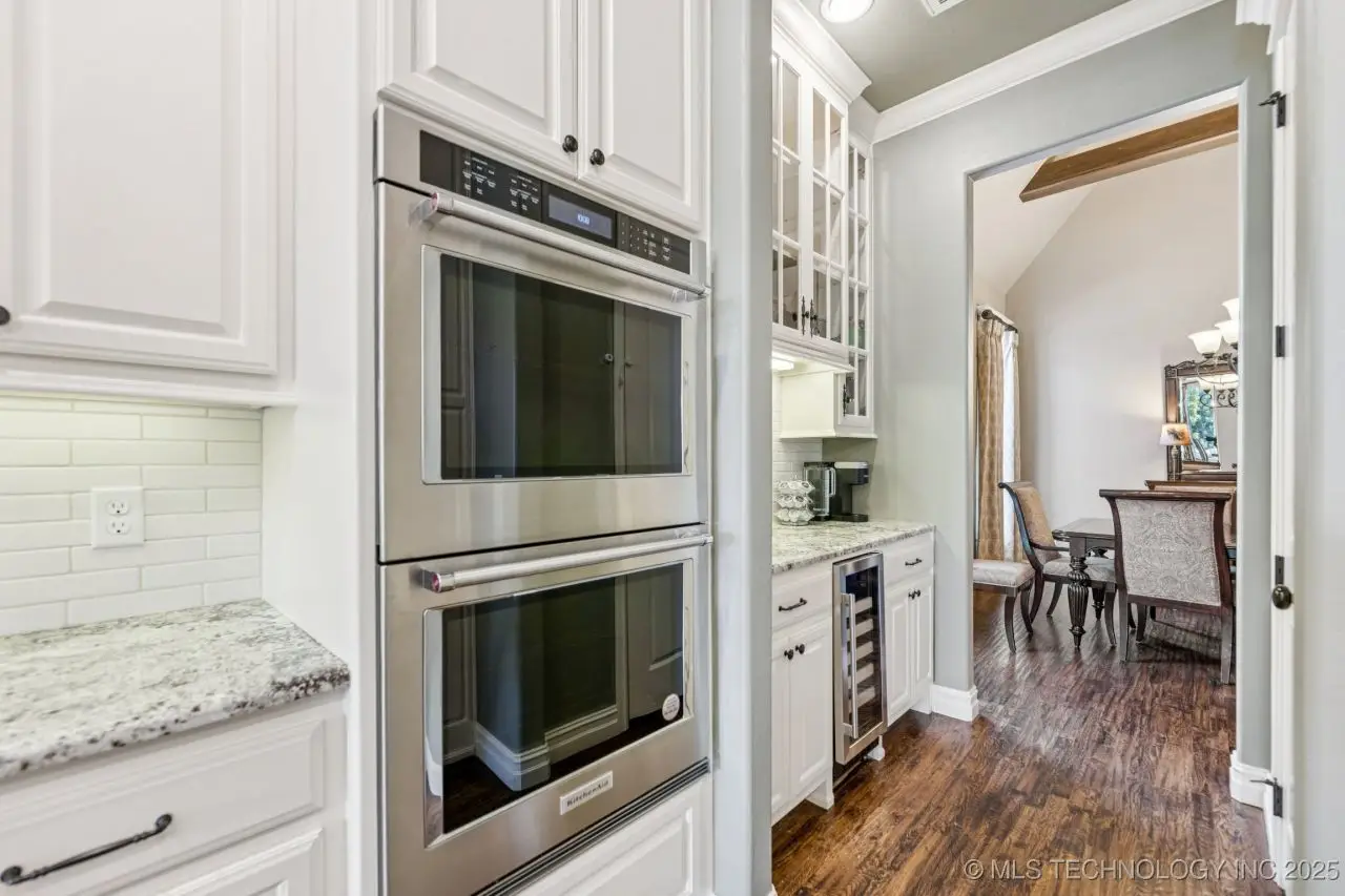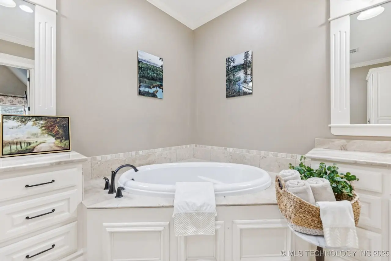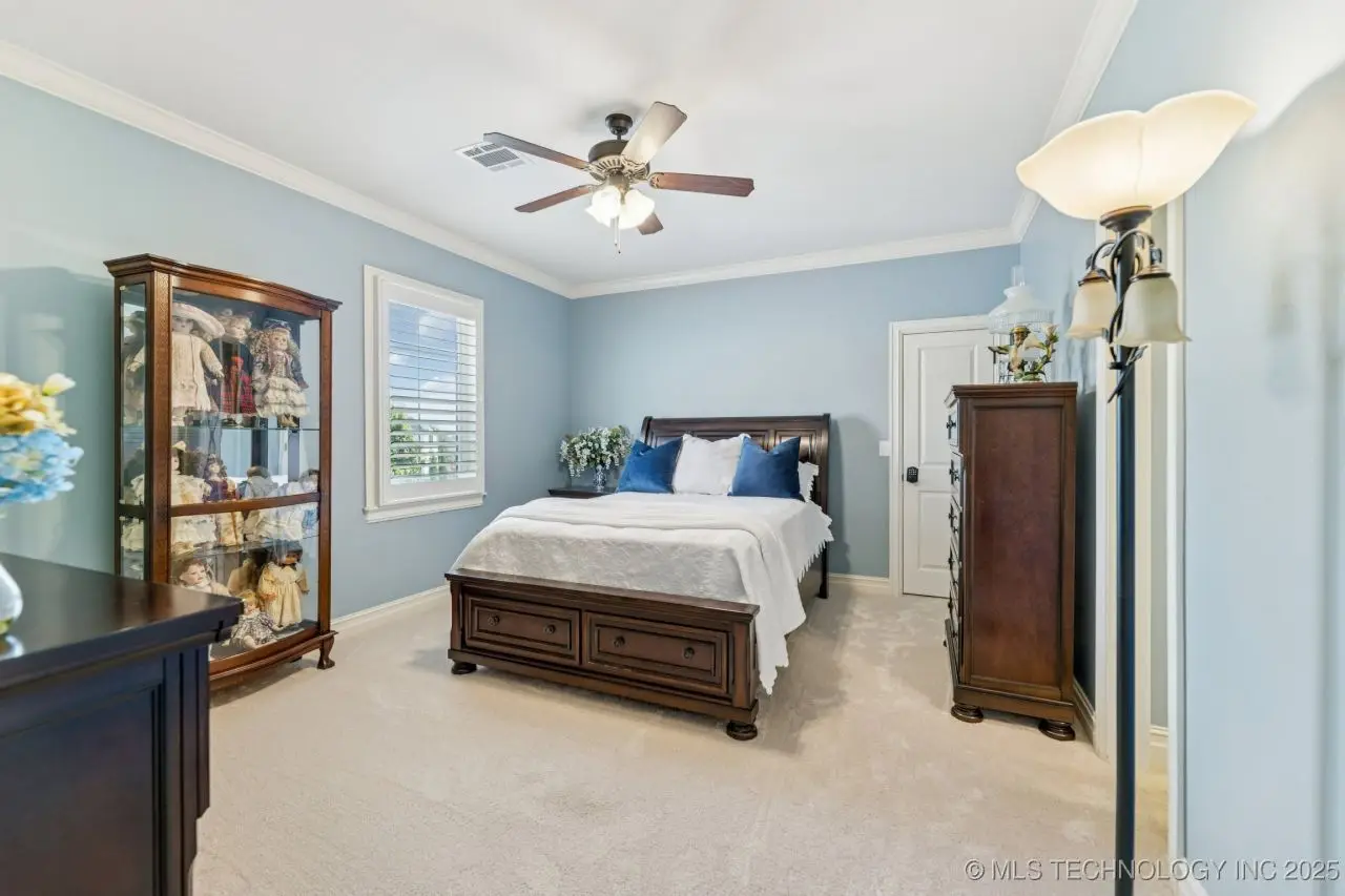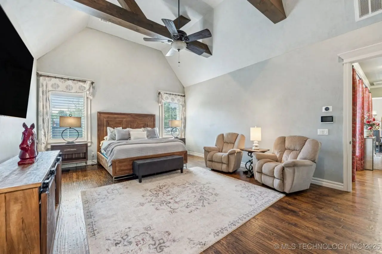 Stunning luxury home in the highly sought-after Jenks School District offering over 5100 (AP) sq ft of beautifully designed living space. This gorgeous home features 4 bedrooms, 3 full and 2 half baths along with two separate 2-car garages for a total of 4-car parking. The expansive primary suite offers wood floors, vaulted & beamed ceiling and a spa-like bathroom with dual vanities, dual closets, an oversized frameless shower with multiple shower heads including a rainfall feature, and a separate jacuzzi tub for a serene retreat feel. The large guest suite is also located downstairs, perfect for in-laws or long-term visitors with privacy & separate "secret" garage entrance. The open-concept family room features a striking stone fireplace flanked by custom built-ins and flows seamlessly into the gourmet kitchen and spacious breakfast nook. Formal dining and a private office add to the home's versatility. Elegant hardwood floors, coffered ceilings, and extensive trim highlight the craftsmanship throughout. A large 2 story entry leads to an extra wide staircase where upstairs you'll find a large gameroom with closets leading to a separate homework/office/hobby hub, plus two oversized bedrooms with a walkthru pullman bath, an additional half bath and an oversized theater room with large wet bar, microwave, and refrigerator. The backyard is designed for entertaining with a covered patio, extended pergola, outdoor fireplace, inground gunite pool plus waterfall spa, all surrounded by mature trees for privacy. Additional features include full foam insulation, a whole-home generator, water filtration system, tornado safe room, 4 HVAC units and a backyard dog run area. Exceptional design, abundant amenities, and an incredible location make this home a rare find.