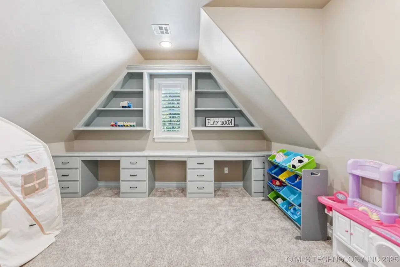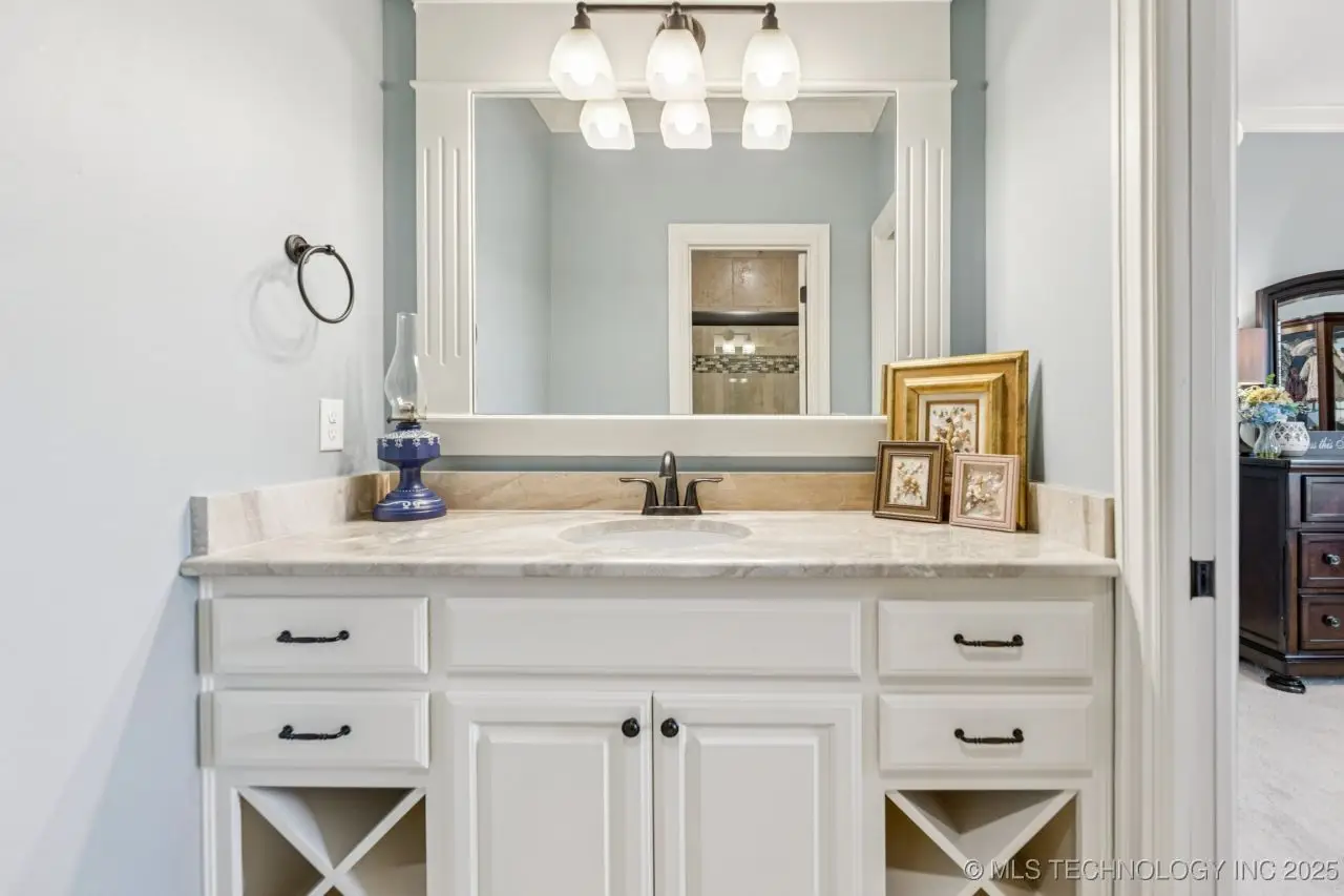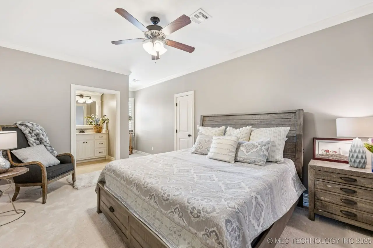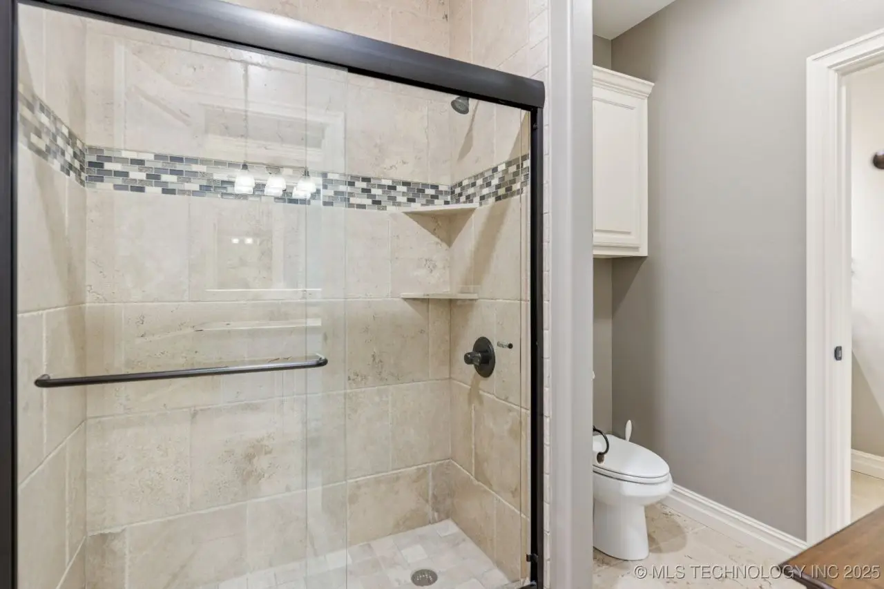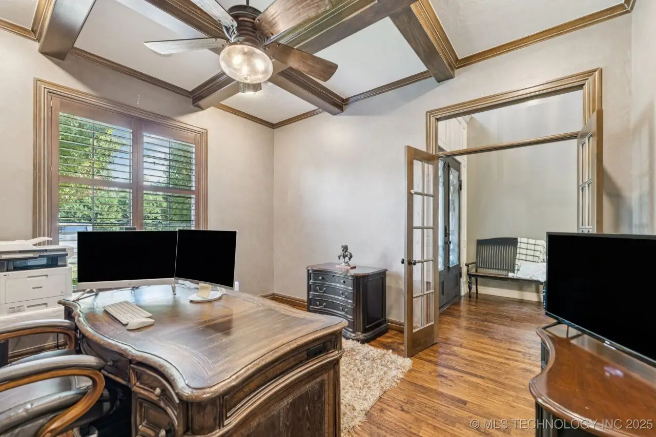 Stunning luxury home in the highly sought-after Jenks School District offering over 5100 (AP) sq ft of beautifully designed living space. This gorgeous home features 4 bedrooms, 3 full and 2 half baths along with two separate 2-car garages for a total of 4-car parking. The expansive primary suite offers wood floors, vaulted & beamed ceiling and a spa-like bathroom with dual vanities, dual closets, an oversized frameless shower with multiple shower heads including a rainfall feature, and a separate jacuzzi tub for a serene retreat feel. The large guest suite is also located downstairs, perfect for in-laws or long-term visitors with privacy & separate "secret" garage entrance. The open-concept family room features a striking stone fireplace flanked by custom built-ins and flows seamlessly into the gourmet kitchen and spacious breakfast nook. Formal dining and a private office add to the home's versatility. Elegant hardwood floors, coffered ceilings, and extensive trim highlight the craftsmanship throughout. A large 2 story entry leads to an extra wide staircase where upstairs you'll find a large gameroom with closets leading to a separate homework/office/hobby hub, plus two oversized bedrooms with a walkthru pullman bath, an additional half bath and an oversized theater room with large wet bar, microwave, and refrigerator. The backyard is designed for entertaining with a covered patio, extended pergola, outdoor fireplace, inground gunite pool plus waterfall spa, all surrounded by mature trees for privacy. Additional features include full foam insulation, a whole-home generator, water filtration system, tornado safe room, 4 HVAC units and a backyard dog run area. Exceptional design, abundant amenities, and an incredible location make this home a rare find.