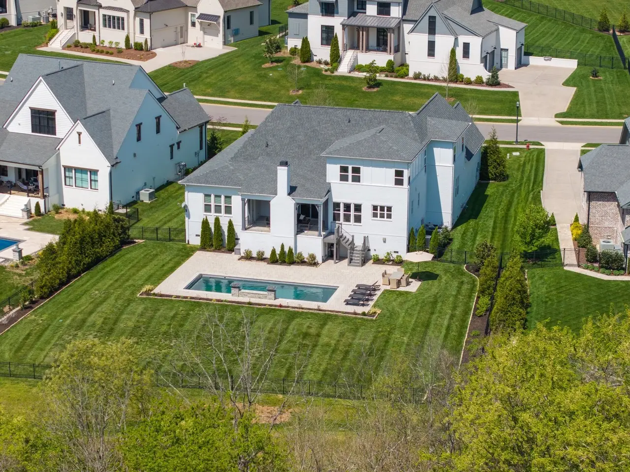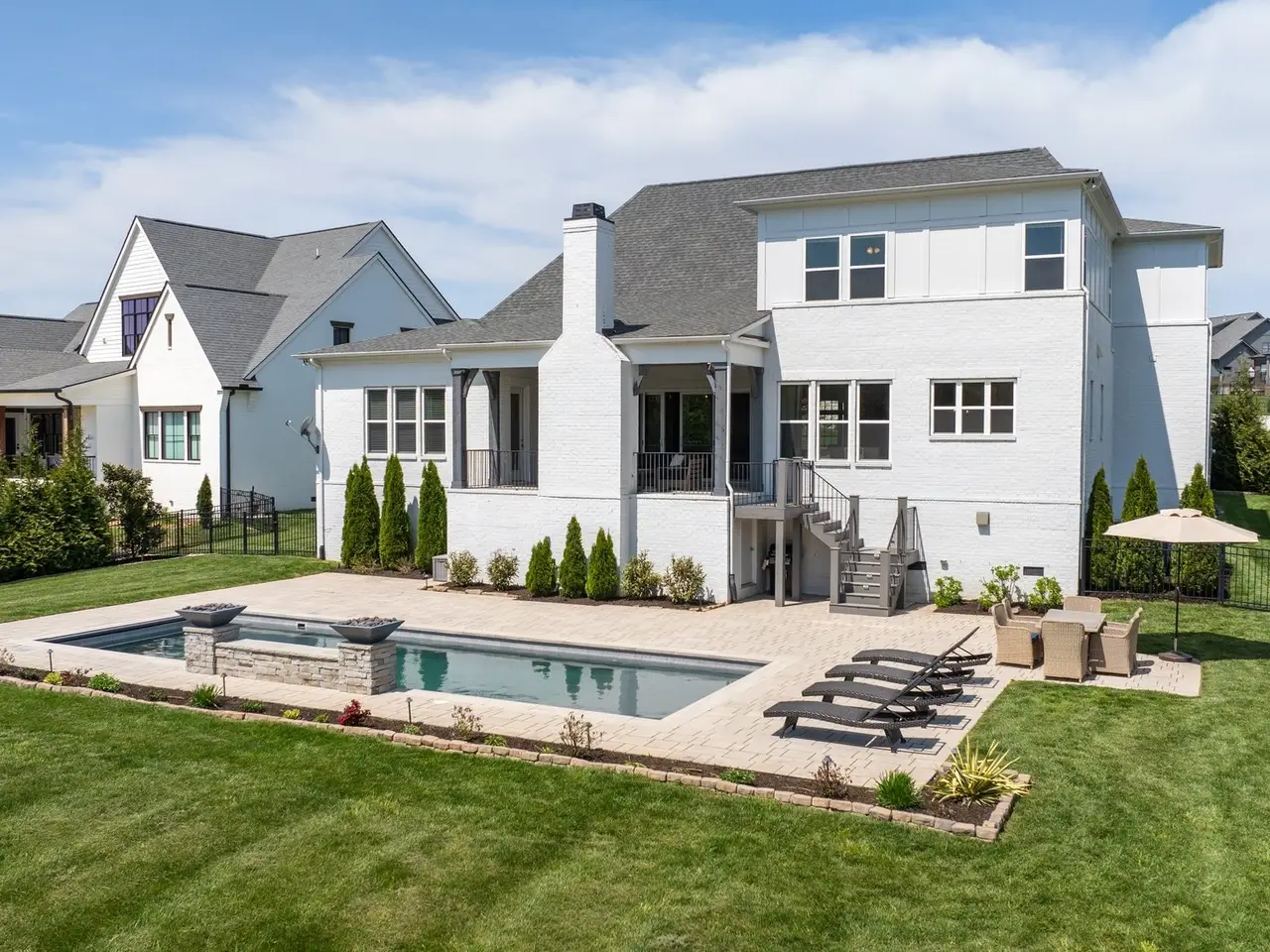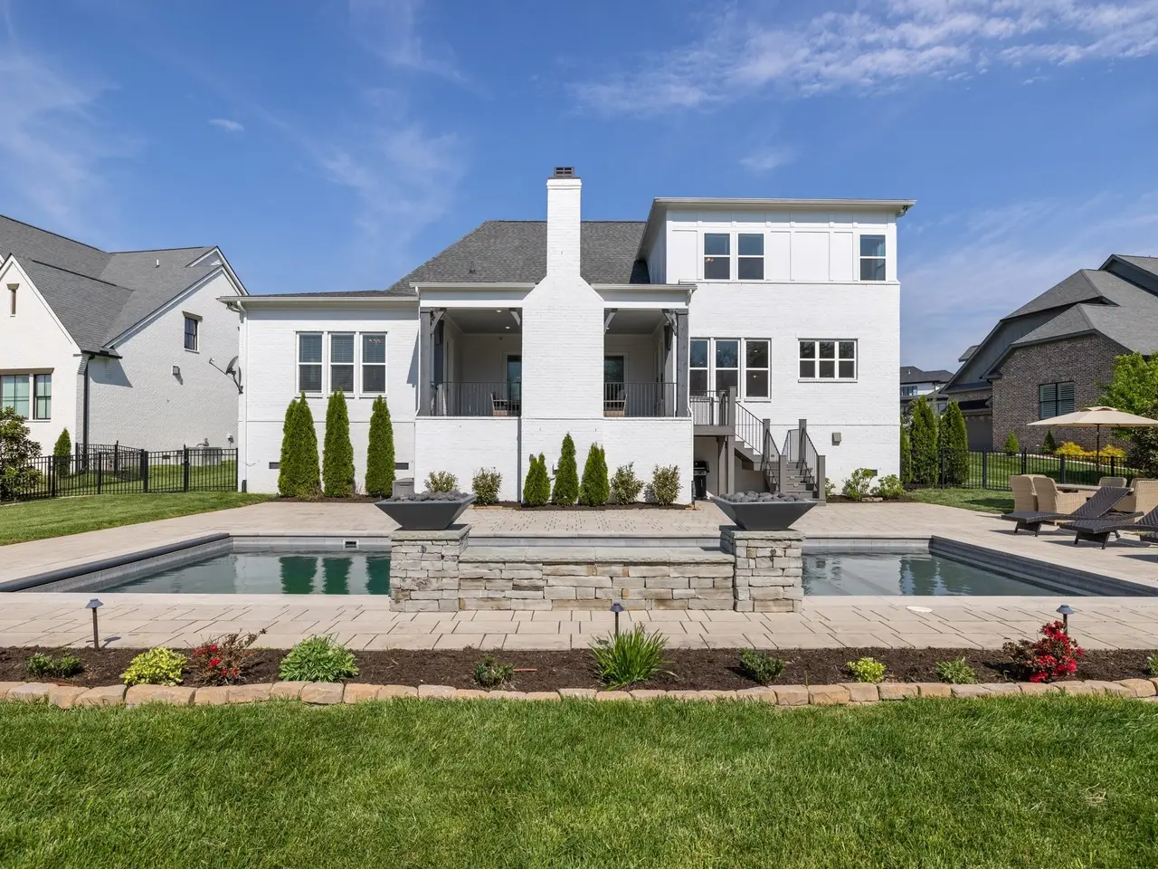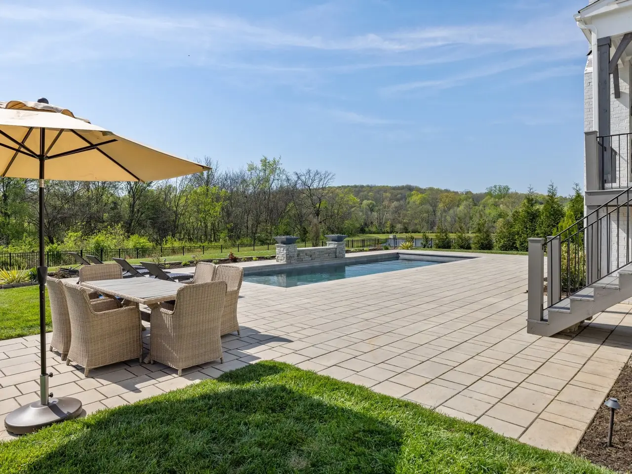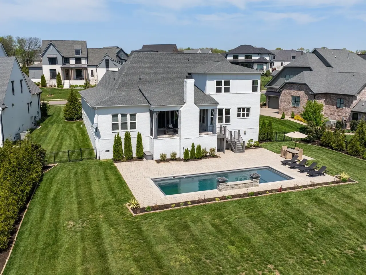 This stunning residence blends luxury, functionality, and thoughtful design across every inch. Located in a desirable community, the home boasts incredible attention to detail--from custom ceiling treatments and exposed wood beams to expansive living spaces and resort-style outdoor amenities.The main level features both a primary suite and guest suite, along with a private study adorned with a coffered ceiling and French doors. Gorgeous hardwood floors run throughout the main living areas, while the formal dining room shines with natural light and elegant wainscoting.The chef's kitchen is a true centerpiece, offering a large center island with seating, ceiling-height cabinetry, top-of-the-line stainless steel appliances, and ample prep space. Just off the kitchen, a wet bar with beverage center provides the perfect setup for entertaining.The living room features a vaulted ceiling with exposed wood beams, custom built-in bookcases, and a gas fireplace, with glass sliding doors opening to a covered rear porch--complete with a fireplace and views of the in-ground pool and lush green space.The primary suite is a luxurious retreat, showcasing a tray ceiling with shiplap accents, private porch access, dual vanities, a freestanding soaking tub, and a floor-to-ceiling walk-in shower with rainhead and bench seating.Upstairs offers incredible flexibility with a spacious bonus room and a media room pre-wired for surround sound, ideal for movie nights or casual entertaining.The outdoor living space is unmatched, featuring a sparkling pool with sun shelf, fire features, and a generous patio area for lounging. The fenced-in backyard adds privacy, and the 3-car garage with stately courtyard entry completes the package.With its mix of elegance, comfort, and entertainment-ready spaces, this home is truly one-of-a-kind.