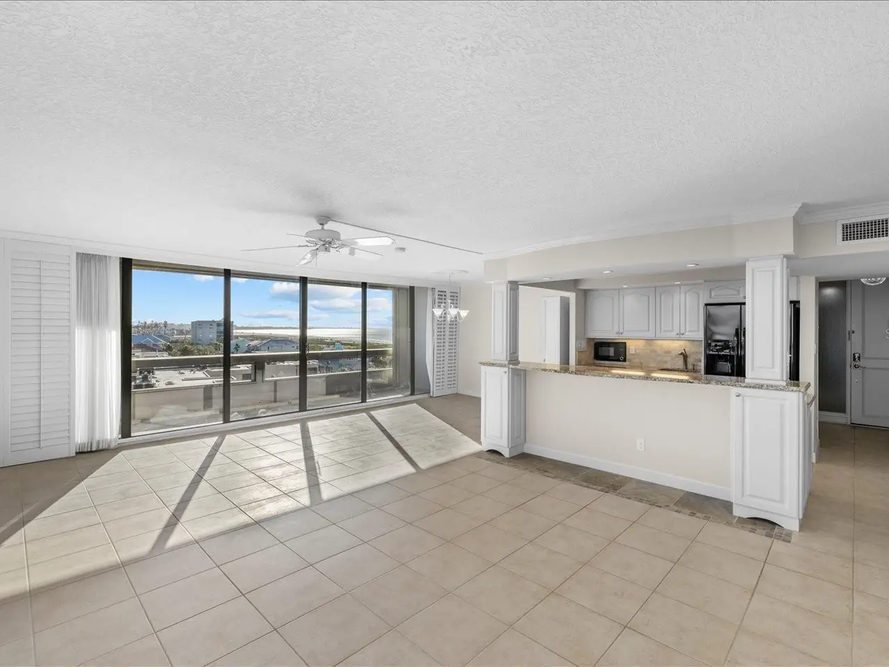 One or more photo(s) has been virtually staged. The Beach Terrace building is one of the most desirable addresses on Siesta Key with a direct Gulf of Mexico location and nestled at the end of the village. This two bedroom / two full bath corner residence offers panoramic views of the Siesta Key beach, village and aqua water of the Gulf of Mexico. The condominium offers 3 spacious balconies to enjoy morning coffee, evening sunsets and the skyline of downtown Sarasota in the distance. Enter the split floor plan residence through the entry with tiled flooring into the kitchen. The kitchen boasts updated cabinetry, appliances, lighting, granite countertops. The large living area offers dual sliders that provide expansive views throughout Siesta Key and the beach. You can enjoy just relaxing on the couch and viewing the sparkling waters of the gulf. The dining area also provides ample space for entertaining. The primary bedroom has a private balcony with views of the gulf and village. There are two full size beds and an ensuite bath and vanity area including updated tile, cabinetry and granite countertops. The second bedroom offers a full bed with an additional full sliding door for and dazzling views of the gulf. This bedroom also provides an additional bathroom with updated cabinetry, tile shower and granite. The onsite amenities include elevated heated saltwater pool, fitness center, community room all steps from private beach.