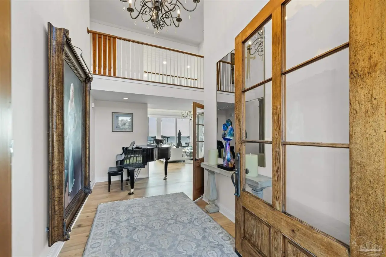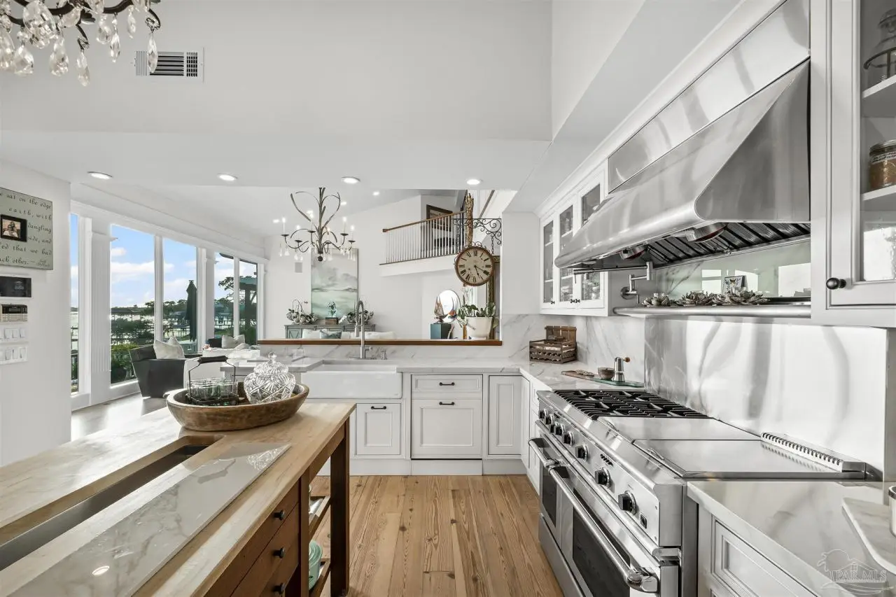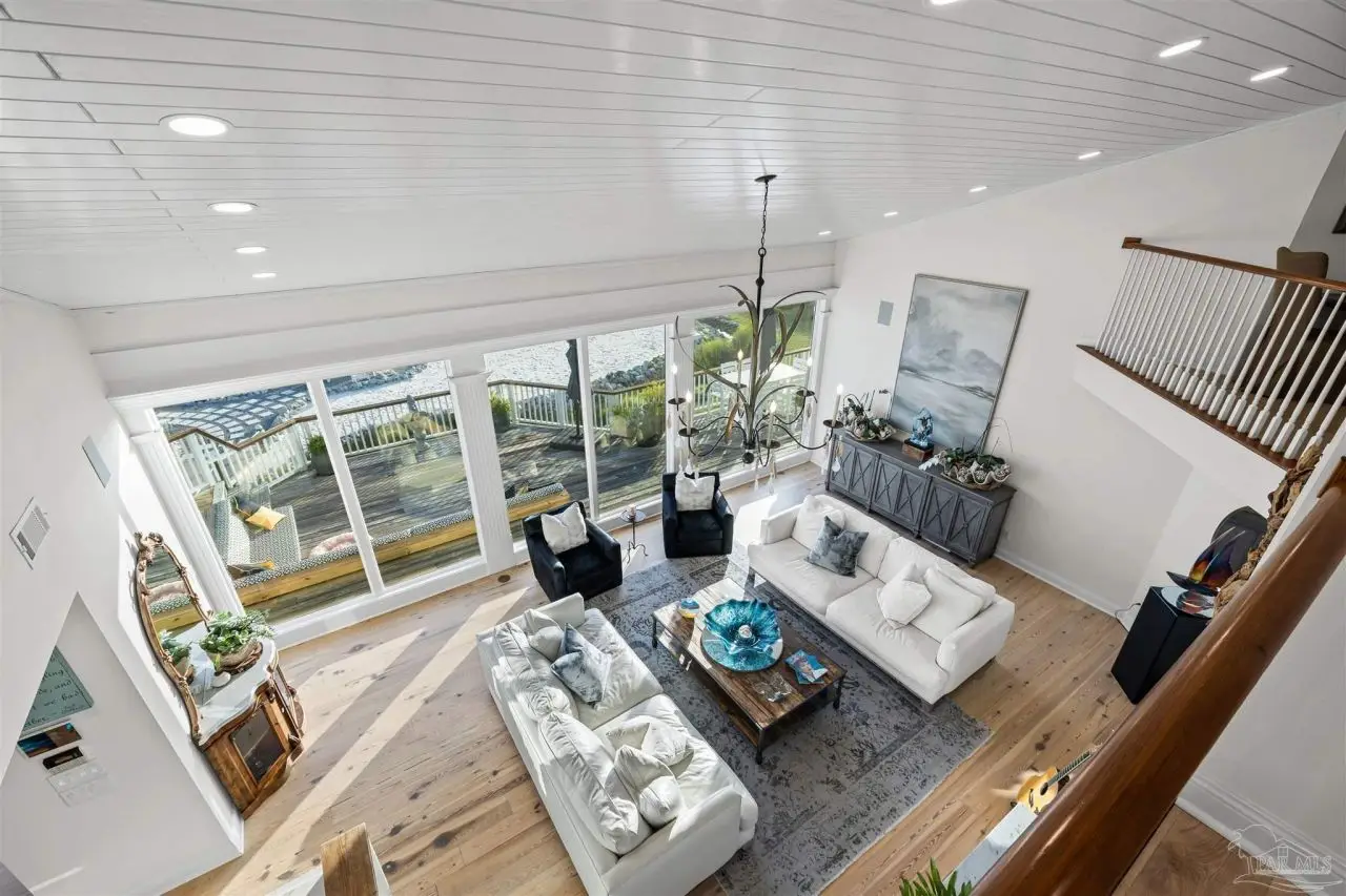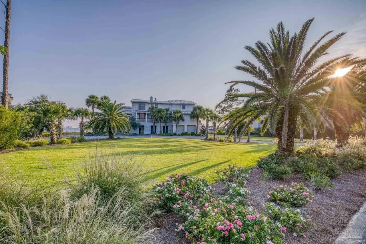 This is a rare opportunity to own a premier deep-water estate in Gulf Breeze Proper. Situated on 1.5 acres with over 200 feet on the Intracoastal Waterway, this stunning property features a rare 20x50 ft deep-water boat slip (9 ft depth) with flow-through dock and sun deck, a private white sand beach, and expansive green space. The home offers luxury throughout, including a great room with expansive windows showcasing breathtaking water views, a vaulted ceiling, and a gas fireplace. The custom kitchen is equipped with high-end appliances, a wet bar, and a dining area overlooking the Sound. The primary suite offers panoramic water views, deck/hot tub access, dual walk-in closets, and a spa-style bath with a soaking tub and separate shower. A main-level guest suite includes a private bath and patio access. Upstairs, you'll find two additional bedrooms, two full baths, and a large multipurpose room with a fireplace and French doors for added privacy. Additional features include a 3-car garage with a climate-controlled, large bonus room and half bath, plus a 200x200 ft vacant lot across the street included in the sale. Exceptional views, luxury finishes, and rare boating access make this a one-of-a-kind waterfront offering the ultimate Florida lifestyle.
