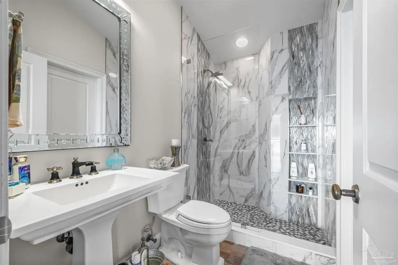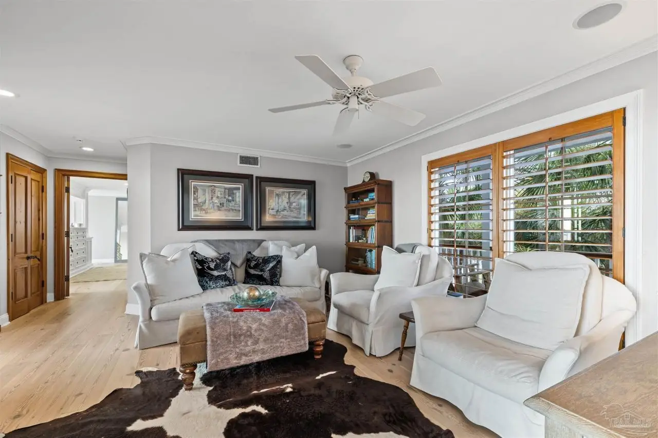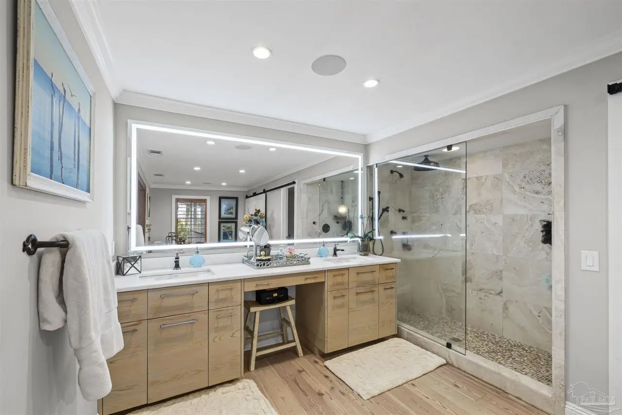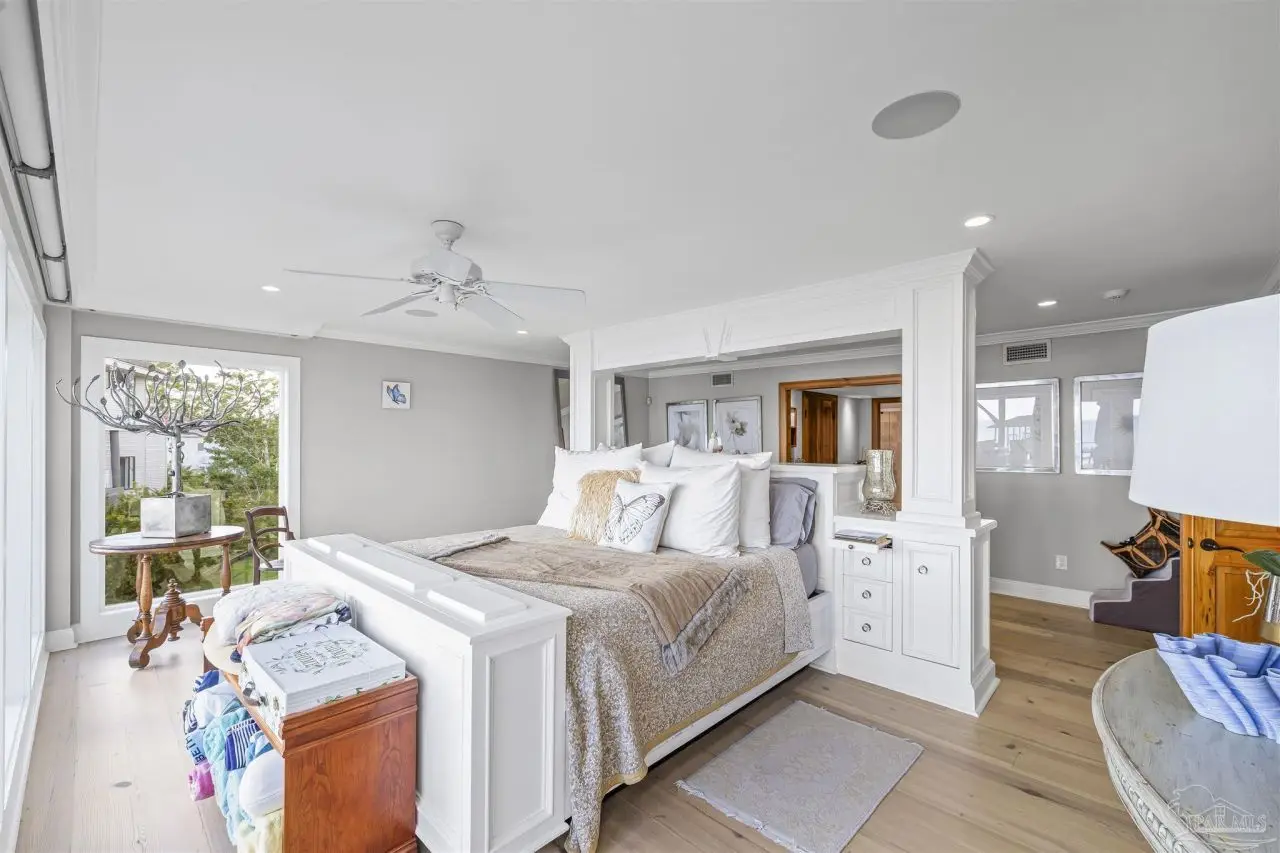 This is a rare opportunity to own a premier deep-water estate in Gulf Breeze Proper. Situated on 1.5 acres with over 200 feet on the Intracoastal Waterway, this stunning property features a rare 20x50 ft deep-water boat slip (9 ft depth) with flow-through dock and sun deck, a private white sand beach, and expansive green space. The home offers luxury throughout, including a great room with expansive windows showcasing breathtaking water views, a vaulted ceiling, and a gas fireplace. The custom kitchen is equipped with high-end appliances, a wet bar, and a dining area overlooking the Sound. The primary suite offers panoramic water views, deck/hot tub access, dual walk-in closets, and a spa-style bath with a soaking tub and separate shower. A main-level guest suite includes a private bath and patio access. Upstairs, you'll find two additional bedrooms, two full baths, and a large multipurpose room with a fireplace and French doors for added privacy. Additional features include a 3-car garage with a climate-controlled, large bonus room and half bath, plus a 200x200 ft vacant lot across the street included in the sale. Exceptional views, luxury finishes, and rare boating access make this a one-of-a-kind waterfront offering the ultimate Florida lifestyle.