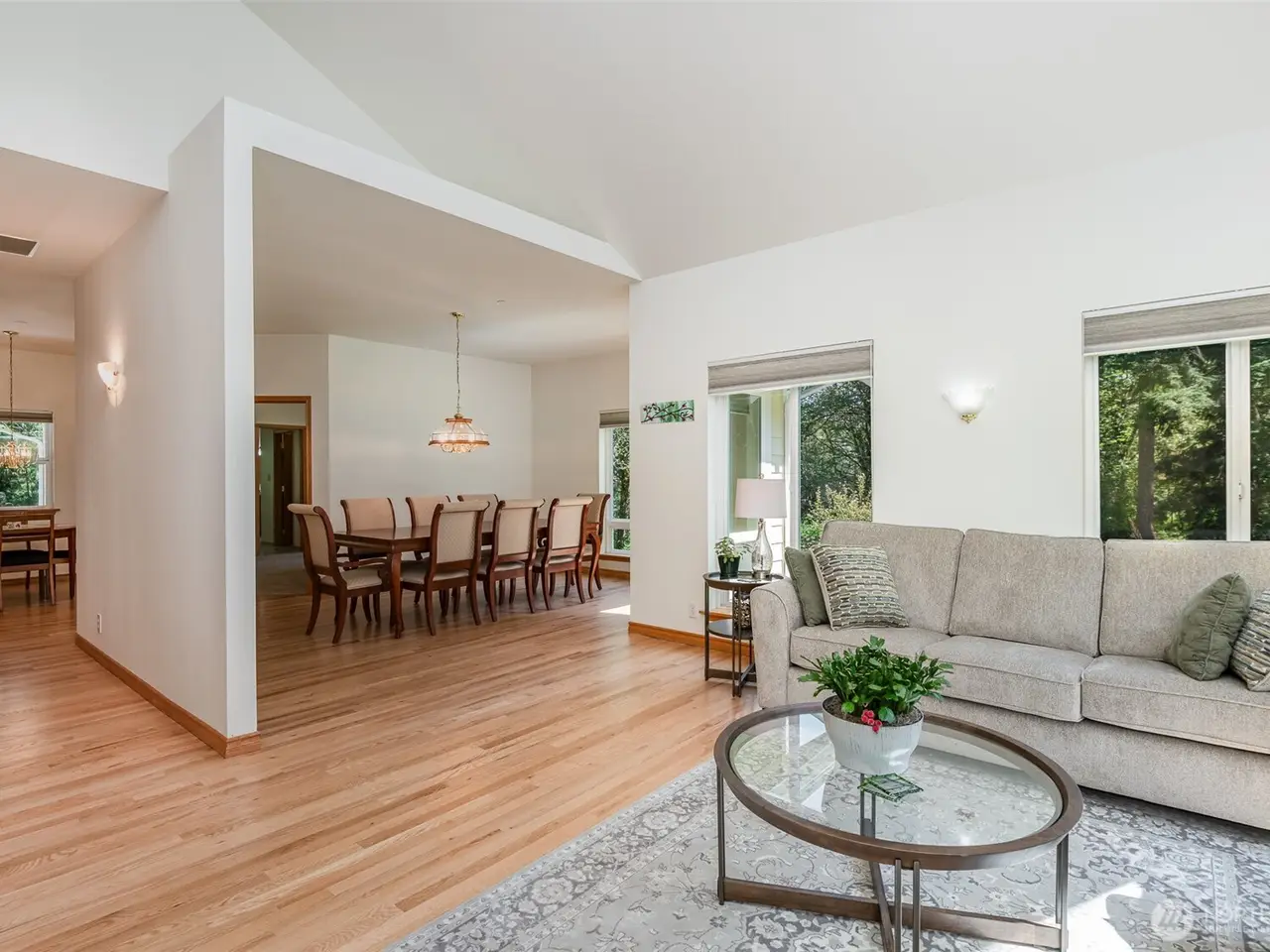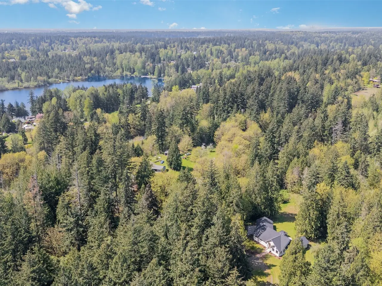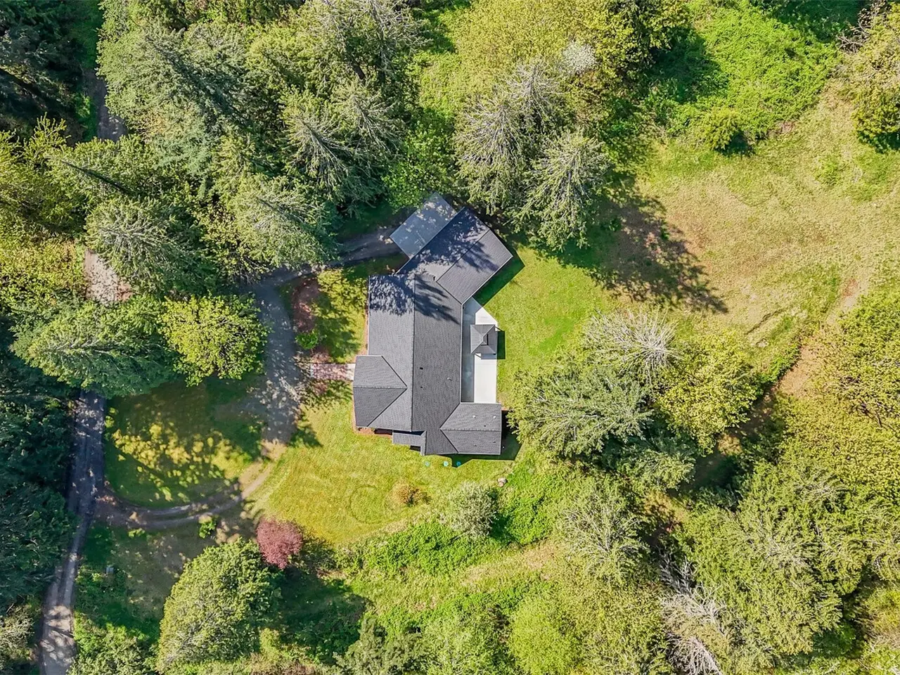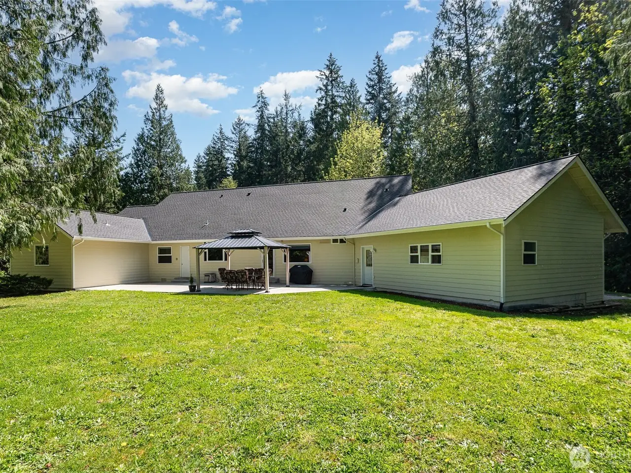 Tucked away in a secluded & serene setting, this 2,600 sq ft picture-perfect custom rambler sits on 5 stunning acres surrounded by nature. With soaring 16 ft ceilings & abundant natural light through picturesque windows, this spacious home offers peace, privacy & beauty at every turn. Enter to find hardwood floors & an open-concept layout featuring a chef's kitchen with quartz countertops, SS appliances, & walk-in pantry. The expansive primary suite boasts vaulted ceilings, dual walk-in closets & recently renovated en-suite bath with dual vanity & walk-in shower. Stay cool with A/C & enjoy 3-car garage plus ample space for RVs, boats or ATVs & new roof! Pristine land is perfect for a garden or recreation. Located in the desirable Tahoma SD.