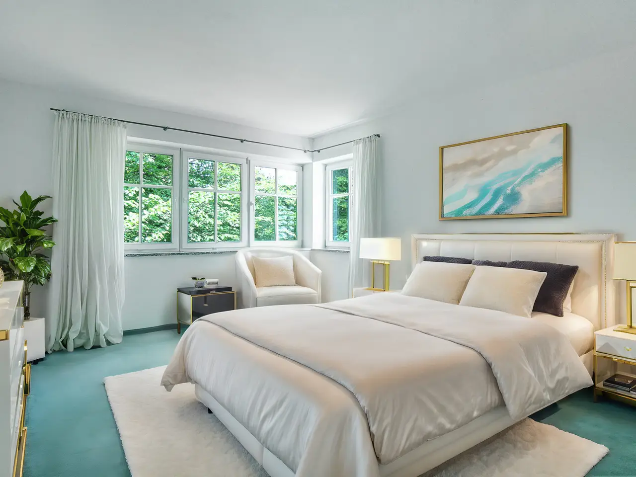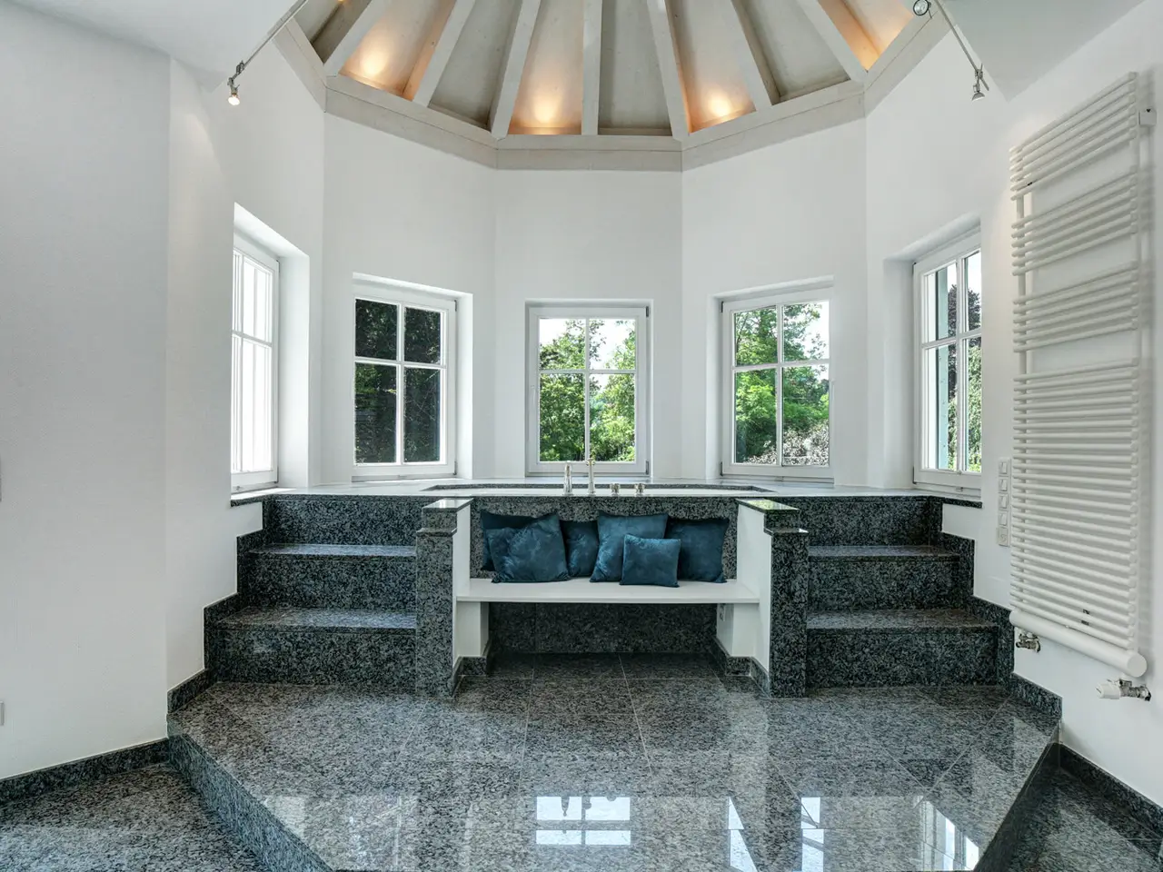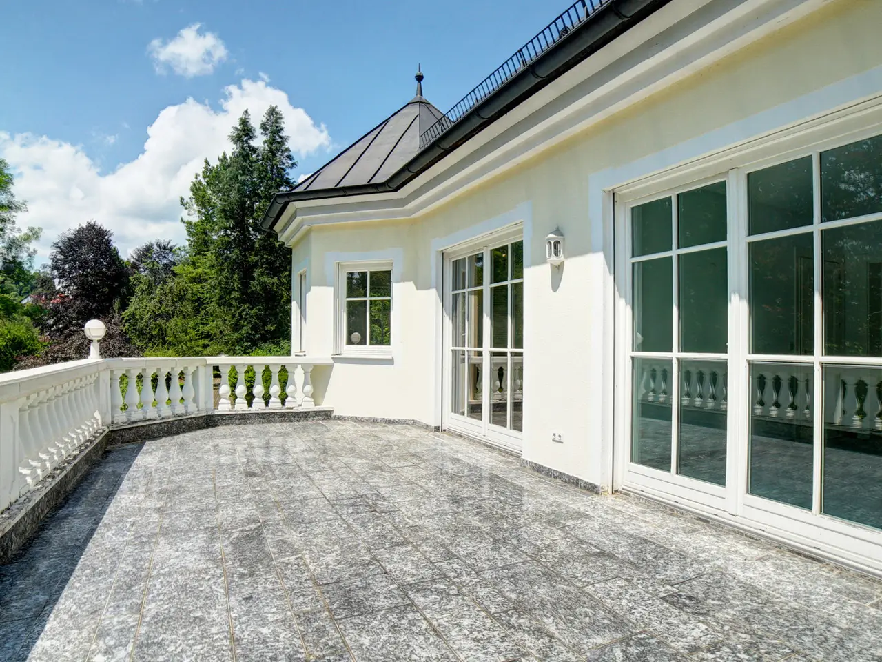 It's well known that farmers often build their homes in special locations. A well-known property developer recognized this spot as a gem and replaced it with an exclusive villa in 2000. Outsiders rarely find the property, as its beauty is hidden from view. Its grandeur and uniqueness are revealed only to visitors, and only when the entrance gates open. You drive down a long driveway through the park-like property, whose trees resemble a small castle. Only then does the size of 8,275 m² become tangible and visible. Upon arriving at the house, the unique architectural style is striking. The two towers alone, positioned to the right and left, give the villa something extraordinary and special. The property developer couple built for themselves and spared no expense, so they focused on the exceptional right from the drawing up of the plans, coupled with their experience. The architect commissioned, Tom Ferster, shaped our region and was known for his individual ideas and exclusive buildings. Always something special. Initially, much was planned and much was discarded, so that in the end, in 2000, the result was this park villa. Directly on the hill with a mountain view. A DREAM!!! A place to linger and fall in love. The entrance area was lovingly designed, welcoming your guests into a majestic entrance hall. The enormous chandelier underscores this sublime grandeur and creates a wow factor. You walk through the hall and have several routes into the living area, allowing you to decide which area you show your guests. A hallway leads to the kitchen. The kitchen has a modern and open design. The counter invites you to watch the cooking or make yourself comfortable in the dining area. Despite the modern design, the builder did not forego the pantry, something you have once had and cannot give up again. The bright living room with countless window fronts and a glass extension invites you to relax in front of the fireplace in winter. In spring, summer, and autumn, you can enjoy your park from there and delight in the animal visitors. In the morning, one or two deer often linger in your garden, enjoying the peace and space. If we stay on the ground floor, you can use the wellness area. After a visit to the sauna and/or the Kneipp pool, and after cooling off with a shower, head outside. Or you can stay indoors and relax, as you have a view of everything through the many windows in the garden. It would also be conceivable to use this area as a bedroom if a barrier-free solution is required. You'll find something special in every room and in every corner. This villa impresses with its furnishings and tasteful design, without being intrusive. It goes without saying that it has underfloor heating, a bus system, and an integrated vacuum cleaner. Even a laundry chute leading to the utility room in the basement has been thought of. The spacious garage for four cars can be accessed directly from the house. If we take the stairs to the upper floor, further luxury awaits us. The dressing room leaves nothing to be desired. The master bedroom, with its huge balcony integrated into the bay window, sets the mood for lovely evenings on the balcony terrace. You can step out onto the gallery at any time and from there gaze into the living room. In the master bathroom, a staircase leads to the bathtub. From there, you have a clear view of your park, completely hidden from prying eyes. Although the attic has been converted, this space has been little used so far and, due to its generous dimensions, was affectionately referred to by the previous owner as the "tennis court." If you would like to add a shower and bath to this room, the connections are available, and an additional children's or guest area can be created. The basement is just as bright as the rest of the house. The office, measuring approximately 60 m², is ideal for home office work. But your beloved Carrera track also has just as much space as a study, a wine cellar, or a bedroom.
