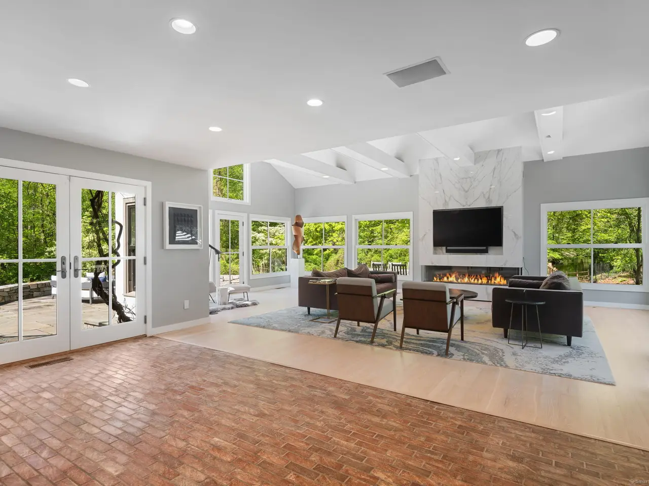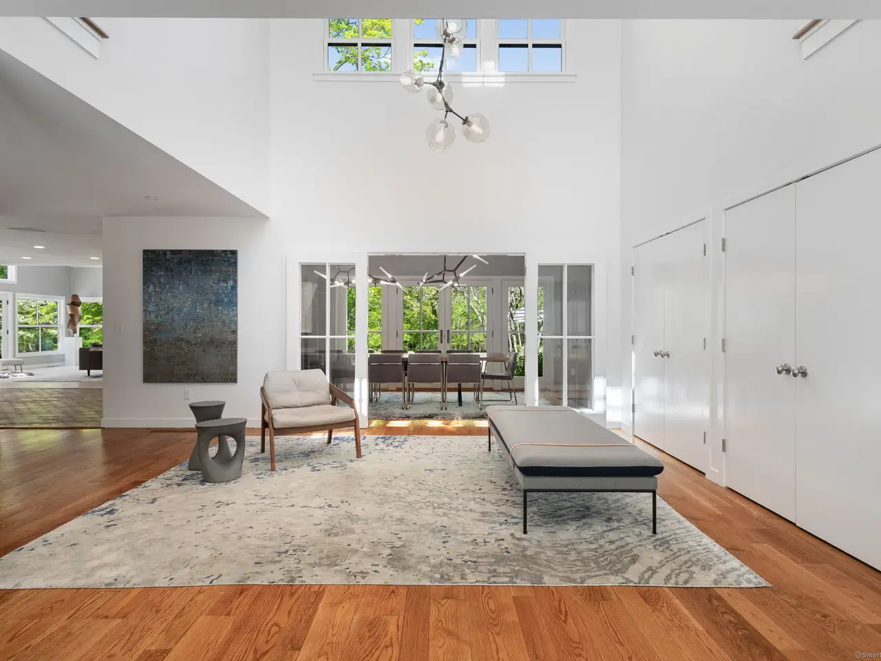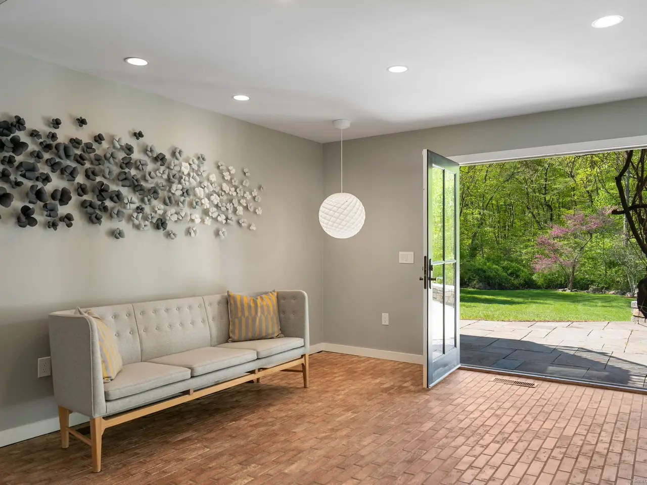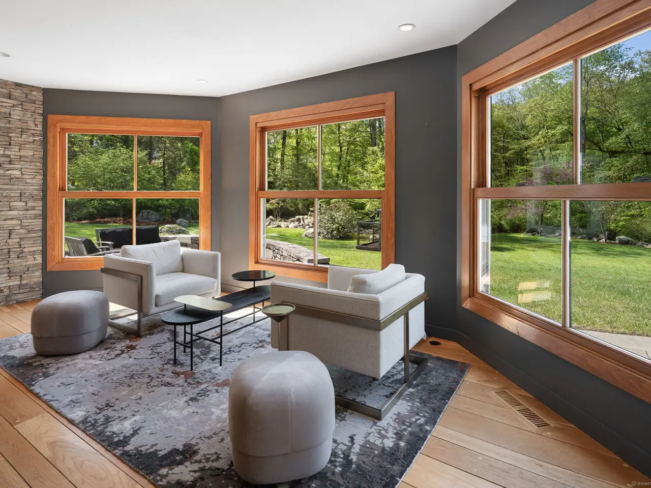 California meets New Canaan in this William Wurster inspired transitional-style masterpiece set on 2.54 private acres on New Canaan's desirable west side that's so convenient to town. This extensively renovated home has over 100 custom windows and 16 doors bringing the outside in from every room. Amazing sun-drenched living space with wonderful views from EVERYWHERE. French doors lead to expansive bluestone terraces, a beautiful gas fire pit for entertaining, meticulously manicured flower gardens, pool, spa and river. Five bedrooms, four-car garages, au pair suite and an exceptionally designed layout make this home a sensational haven with the warmth of a colonial but so fresh!