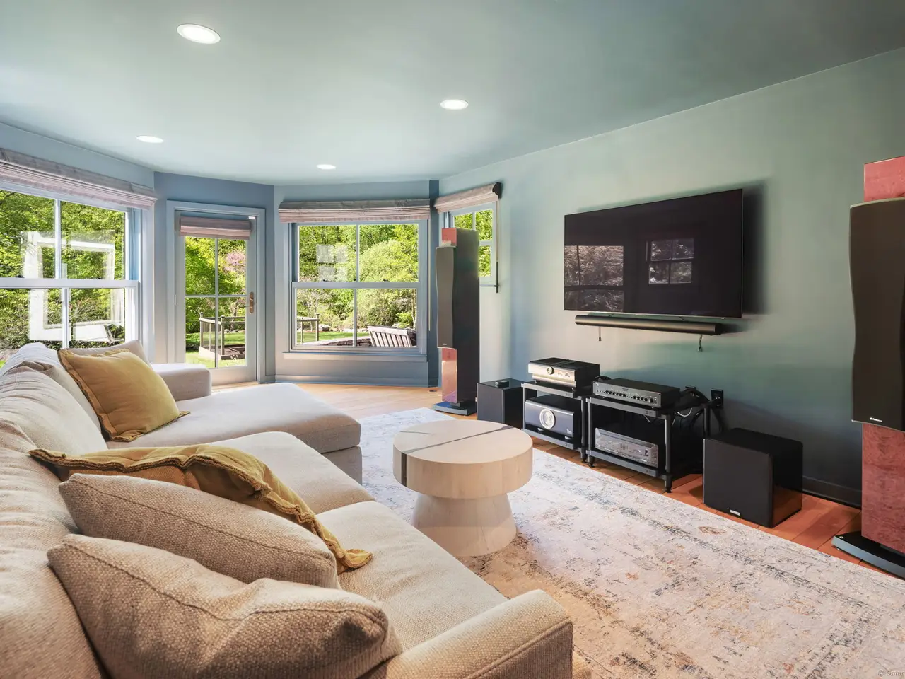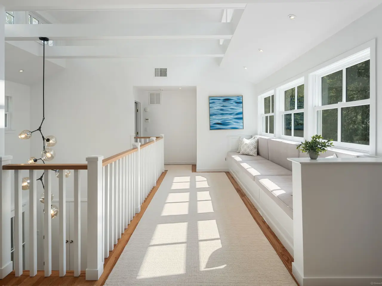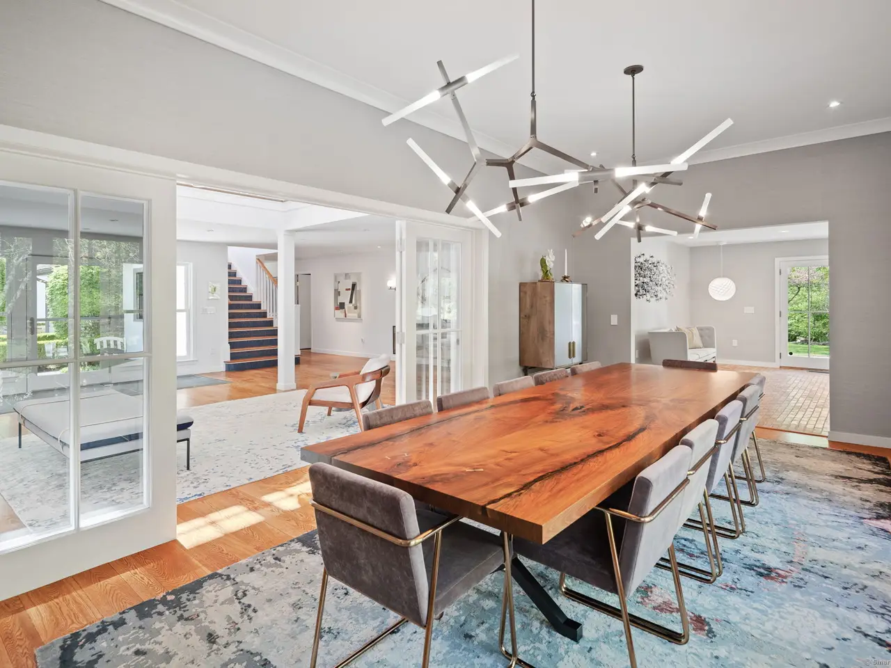 California meets New Canaan in this William Wurster inspired transitional-style masterpiece set on 2.54 private acres on New Canaan's desirable west side that's so convenient to town. This extensively renovated home has over 100 custom windows and 16 doors bringing the outside in from every room. Amazing sun-drenched living space with wonderful views from EVERYWHERE. French doors lead to expansive bluestone terraces, a beautiful gas fire pit for entertaining, meticulously manicured flower gardens, pool, spa and river. Five bedrooms, four-car garages, au pair suite and an exceptionally designed layout make this home a sensational haven with the warmth of a colonial but so fresh!