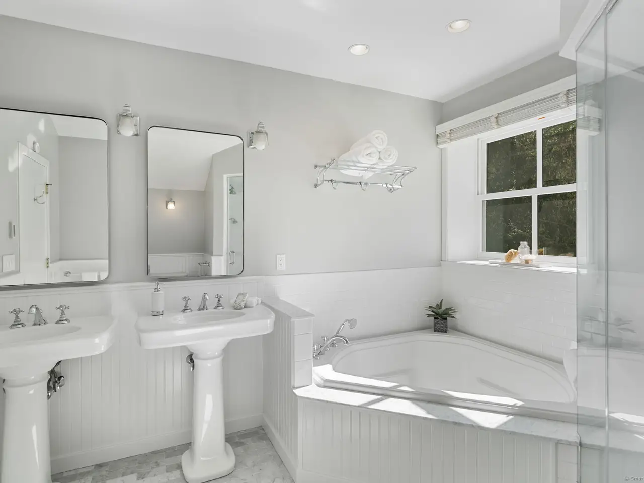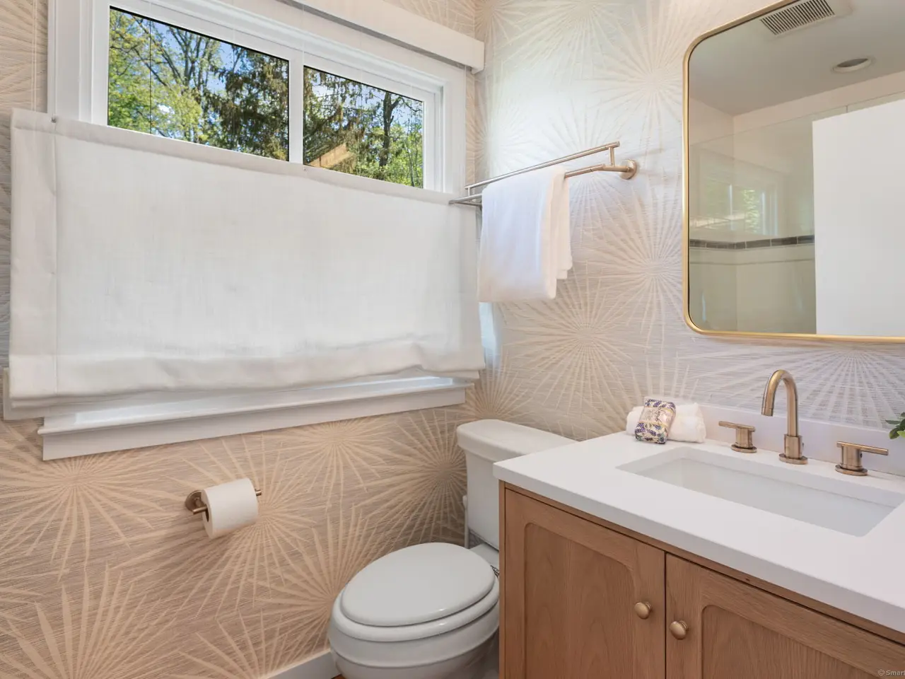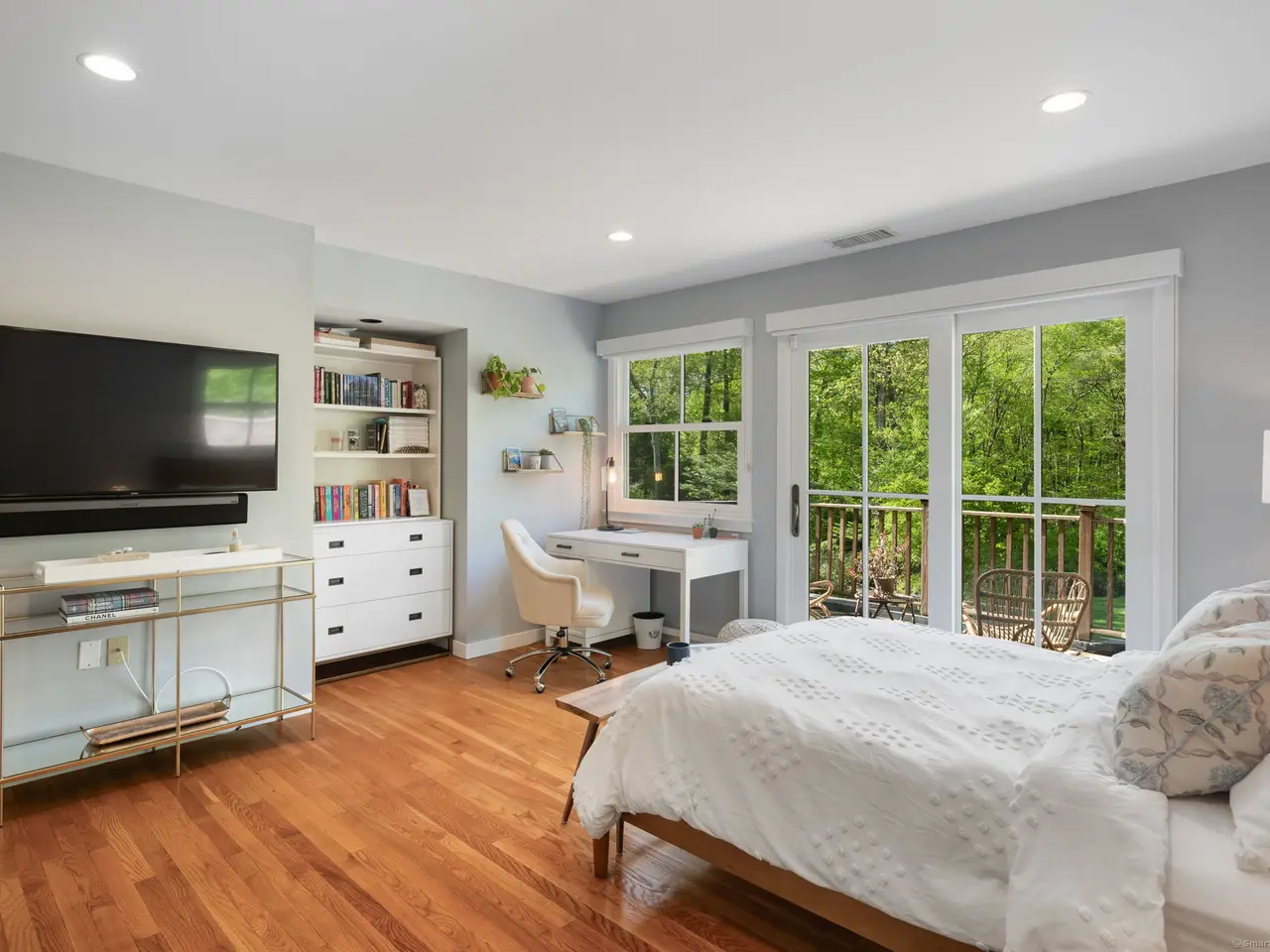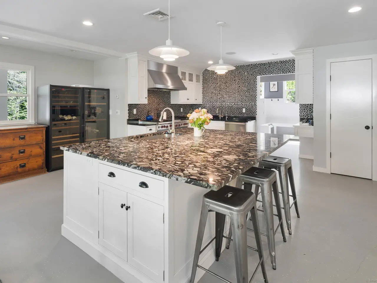 California meets New Canaan in this William Wurster inspired transitional-style masterpiece set on 2.54 private acres on New Canaan's desirable west side that's so convenient to town. This extensively renovated home has over 100 custom windows and 16 doors bringing the outside in from every room. Amazing sun-drenched living space with wonderful views from EVERYWHERE. French doors lead to expansive bluestone terraces, a beautiful gas fire pit for entertaining, meticulously manicured flower gardens, pool, spa and river. Five bedrooms, four-car garages, au pair suite and an exceptionally designed layout make this home a sensational haven with the warmth of a colonial but so fresh!