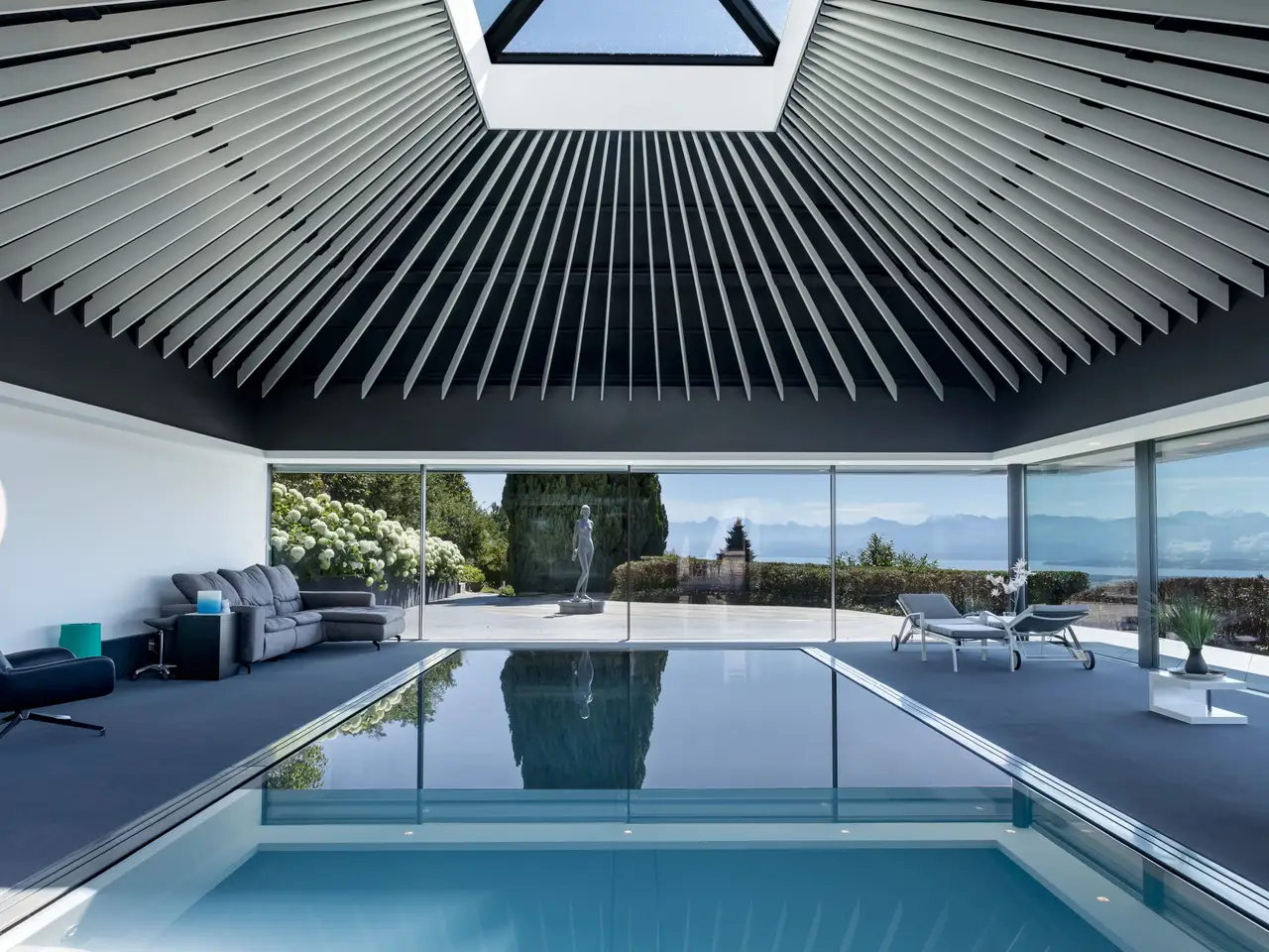 Located in the heart of a peaceful, leafy residential area in the sought-after commune of Givrins, this exceptional property offers a rare, serene living environment. Built in 1980 on a generous plot of over 2,670 m², the house underwent a complete renovation in 2019, incorporating noble materials and top-of-the-range features. With around 530 m² of living space on two levels, it boasts contemporary, atypical interior architecture, designed for an art of living that combines comfort, well-being and aesthetics. The first floor opens onto a vast reception room featuring a lounge with smoking area, as well as a remarkable wellness area equipped with indoor pool, hammam, sauna, changing rooms and sanitary facilities. The kitchen is the centerpiece of the house, seducing visitors with its elegance, functionality and central position, offering a breathtaking view of the surrounding fields, Lake Geneva and the majestic Mont-Blanc. An independent studio with kitchen, living room and shower room completes this level. Upstairs, the master suite features a bathroom, dressing room and access to a private terrace. Two further bedrooms with en suite bathrooms, an office and a laundry room complete this level. The partially excavated basement houses a home cinema, wine cellar, storage space, two utility rooms and a PC shelter. Outside, the landscaping has been carefully designed to guarantee privacy and tranquillity, with a large terrace, an unoverlooked garden planted with trees, a garden shed and a covered area for four vehicles. Offering an excellent level of maintenance and optimal energy performance, this property is a turnkey residence, immediately habitable by its future owner.
