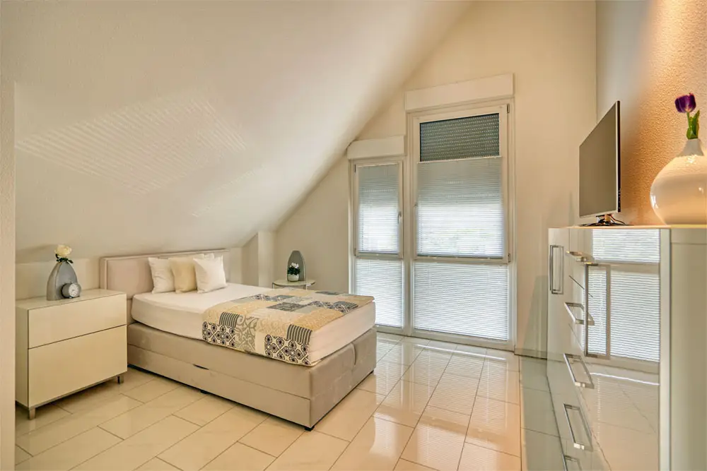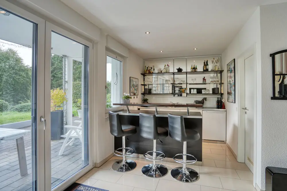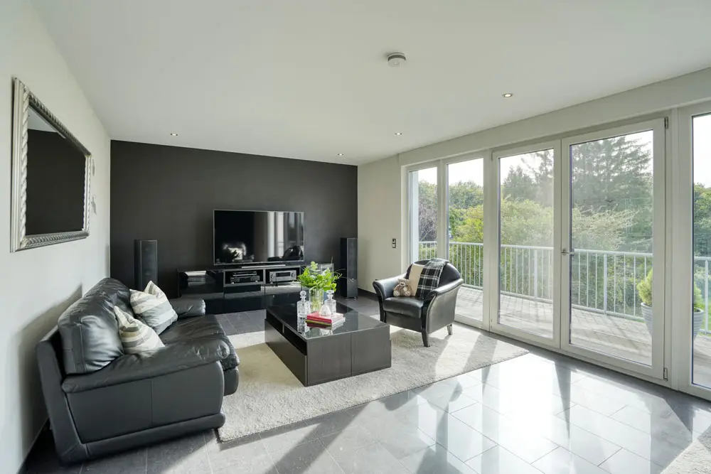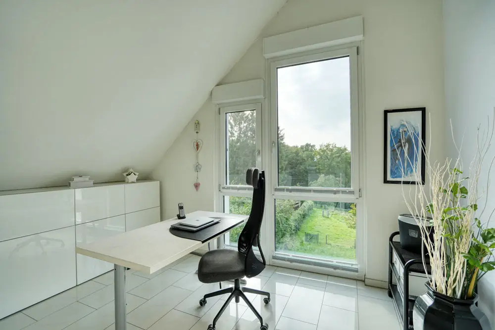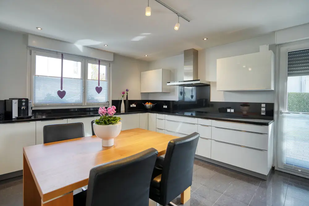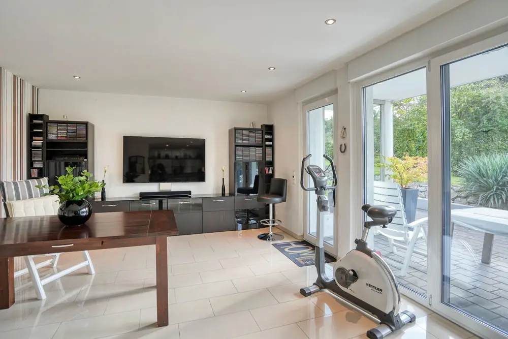 This family-friendly detached house was built in 2009 in solid construction. It is equipped to an above-average standard and is in an exceptionally well-kept condition. On the first floor, starting from the hallway with checkroom and guest WC, there is the generously proportioned living/dining area with access to a large, sunny balcony and the well-equipped kitchen with dining area and access to the terrace and garden. There are four similarly sized rooms on the top floor, which are suitable as bedrooms, children's rooms or studies. The well-lit bathroom is equipped with a floor-level shower. On the garden level, there is a large, versatile room with access to a partially covered terrace and the garden, a shower room with sauna, a room suitable for use as a study, a storage room and a utility room. The storage room under the garage is accessible from the terrace. The terraced and beautifully landscaped garden faces south. The terraces and the balcony are equipped with a shading system. An extra-long car garage and a parking space in front of the garage complete the offer.
