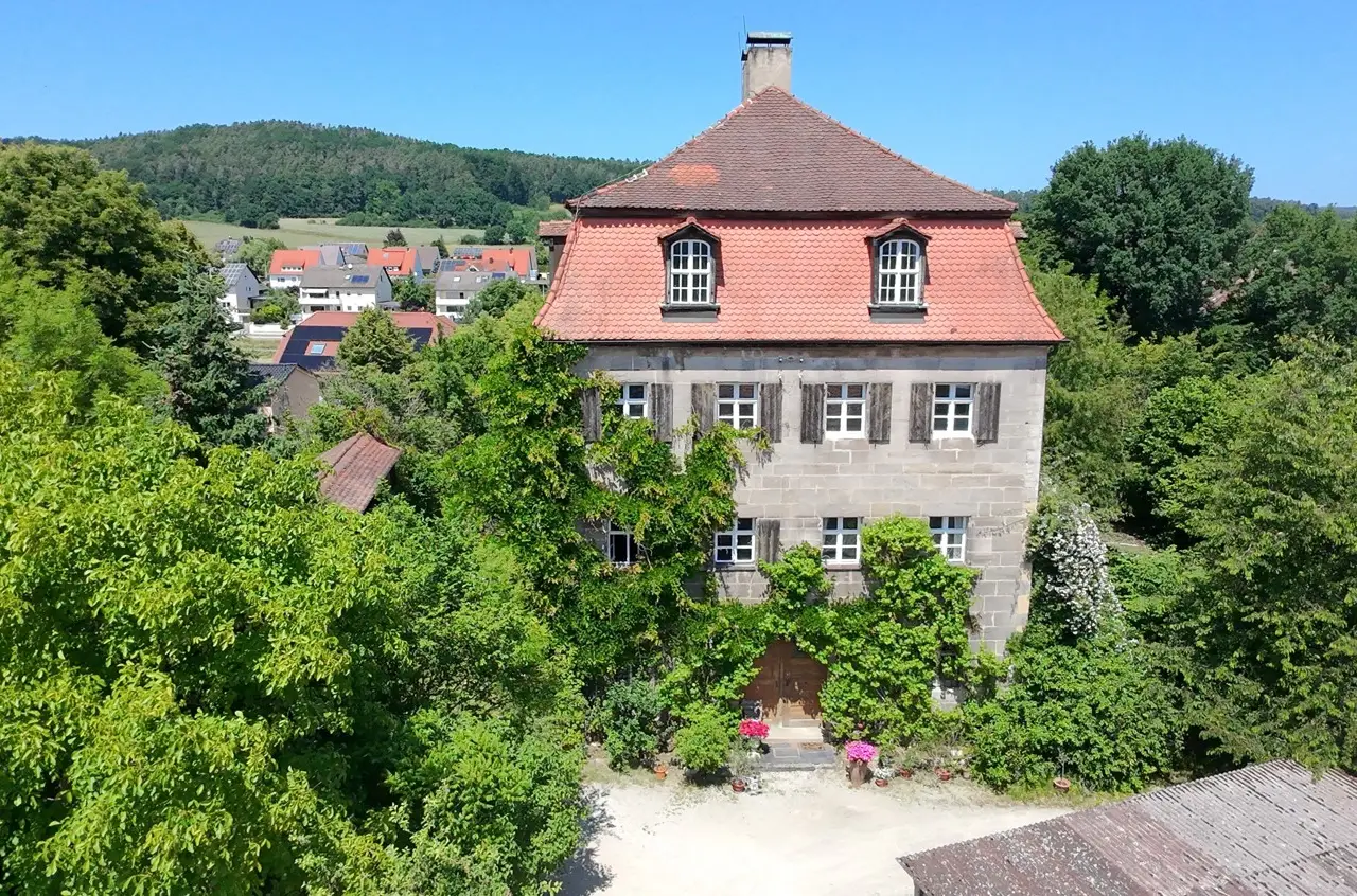 Historic forester's lodge/hunting lodge from the 16th century with walled park garden and outbuildings This extraordinary property looks back on a long history and combines the charm of past centuries with practical uses. The hunting lodge/forester's lodge, built in the 16th century, is nestled in a 1,754 m² well-tended green area, enclosed by a historic sandstone wall. Old, mature trees and harmoniously landscaped garden areas create a protected and private atmosphere. The historic sandstone wall, which surrounds the entire property, forms an authentic and representative boundary and underlines the listed character of the property. The sandstone façade underlines the authenticity of the building. Inside, there are numerous original furnishing details that have been preserved to this day: For example, the Tuscan column in the representative entrance hall, 18th century stucco work in the Beletage on the 1st floor, alcoves and painted paneling in their first version on the mansard floor and two impressive vaulted cellars. The ensemble is completed by a very spacious barn, its own sandstone well and a sauna in the side shed. The barn at the rear of the property and the coach house are not listed buildings. The main building is functionally intact and immediately usable and also offers potential for modernization, which can preserve the historic character and enhance the living comfort. The solid building fabric, generous room layouts and high-quality historical materials form an excellent basis for an individual upgrade. The property also offers the opportunity to benefit from tax depreciation and subsidies within the framework of monument protection. These financial advantages make the property particularly attractive for buyers who want to make an economically sensible investment. The location boasts excellent transport links: Situated directly on the B4 between Erlangen and Bamberg, the property can be reached quickly from both towns. The town itself offers a very good infrastructure with shopping facilities, restaurants, medical care and local public transport. This property is a rare offer for lovers of historical architecture who value authenticity, privacy and flexible usage perspectives. Also worth mentioning is the brightness of the individual rooms, which conveys a special feeling of well-being. See for yourself and arrange a viewing appointment - we are only too happy to help and look forward to hearing from you!