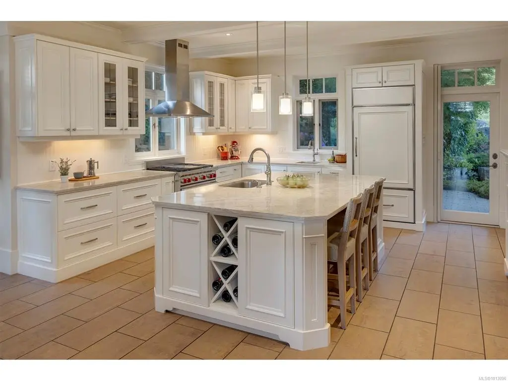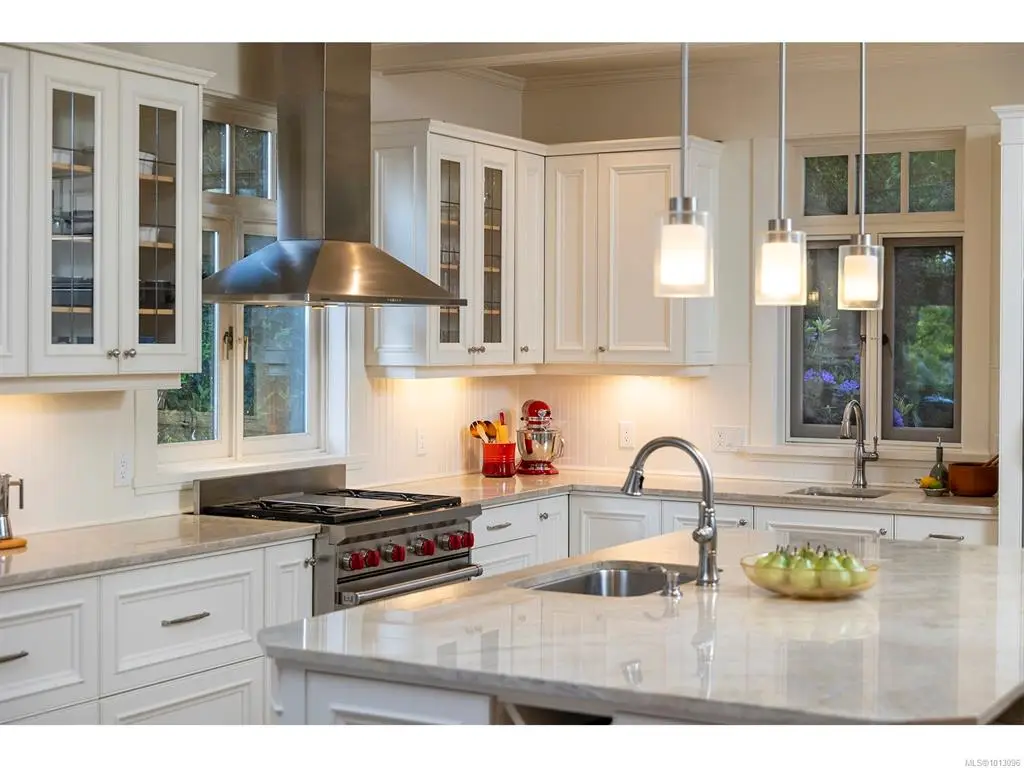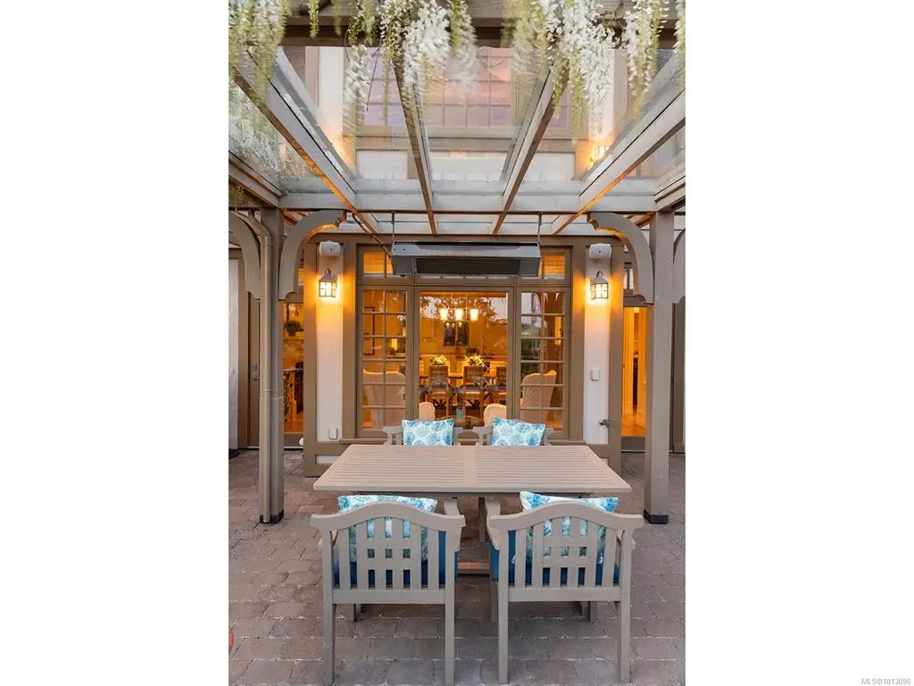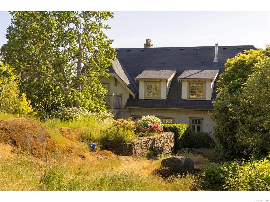 Situated in the heart of Ten Mile Point, this captivating custom residence blends timeless elegance with architectural mastery and the finest materials. Positioned high with views of Cadboro Bay, this .50-acre south-facing estate is the perfect setting for the 5,000+ sq. ft. home, complete with manicured gardens, stone walls, water features and a custom in-ground pool. Designed for seamless indoor–outdoor living, the main floor offers a refined yet relaxed lifestyle, enhanced by the area’s unique microclimate of warmer days & sun-filled evenings. Principal rooms grace the main level, with 4 bedrooms and 3 baths above, and an additional bed & bath below. The sumptuous primary retreat spans its own wing with a spa-inspired bath, fireplace, private sitting area and breathtaking ocean views from your bedside. A grand gourmet kitchen anchors the home with dining-area fireplace, expansive island and direct access to a wisteria-covered heated deck, expansive terraces and tranquil fountains.