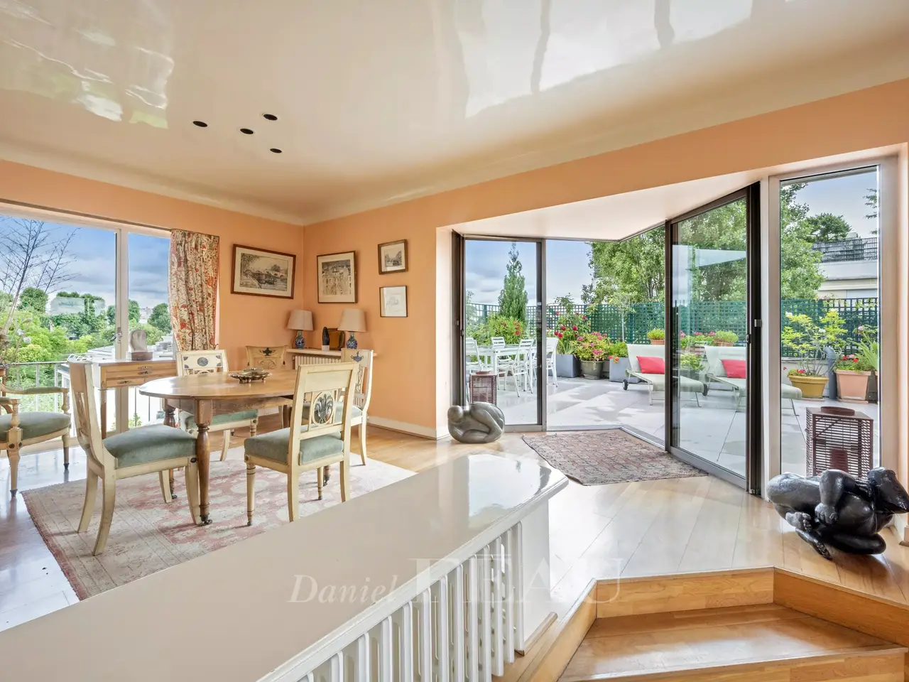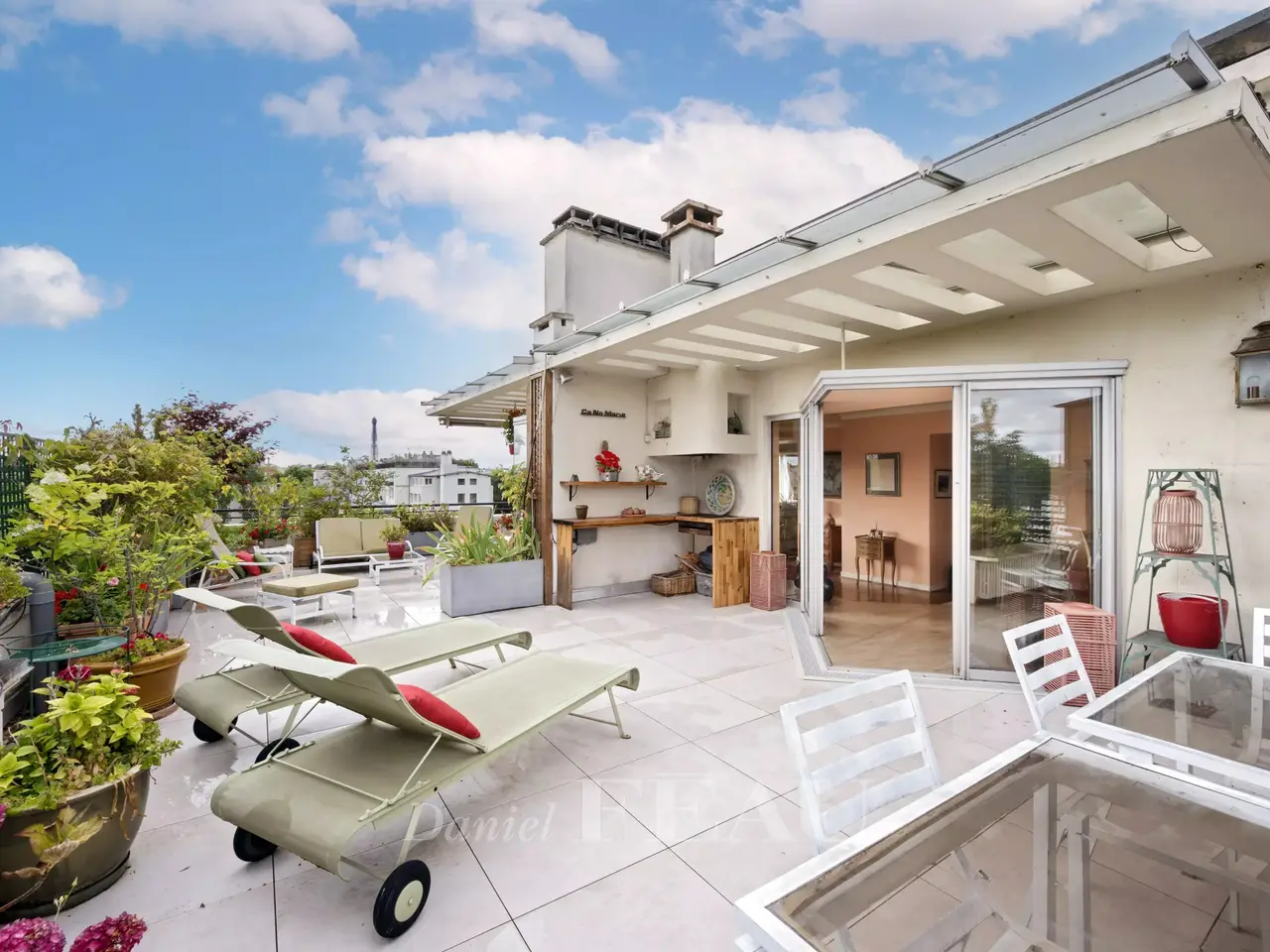 Boulevard la Saussaye. This apartment on the top floor of a mid 20th century building includes a triple living/reception room opening onto a 64 sqm terrace, a separate kitchen, a master suite with a bathroom and a study, a bedroom with a shower room, and a guest wc. A third bedroom would be possible. With two cellars. Two lock-up garages may be acquired for a further 40000€ each. Pasteur catchment area. Renovation is required to exploit the full potential.