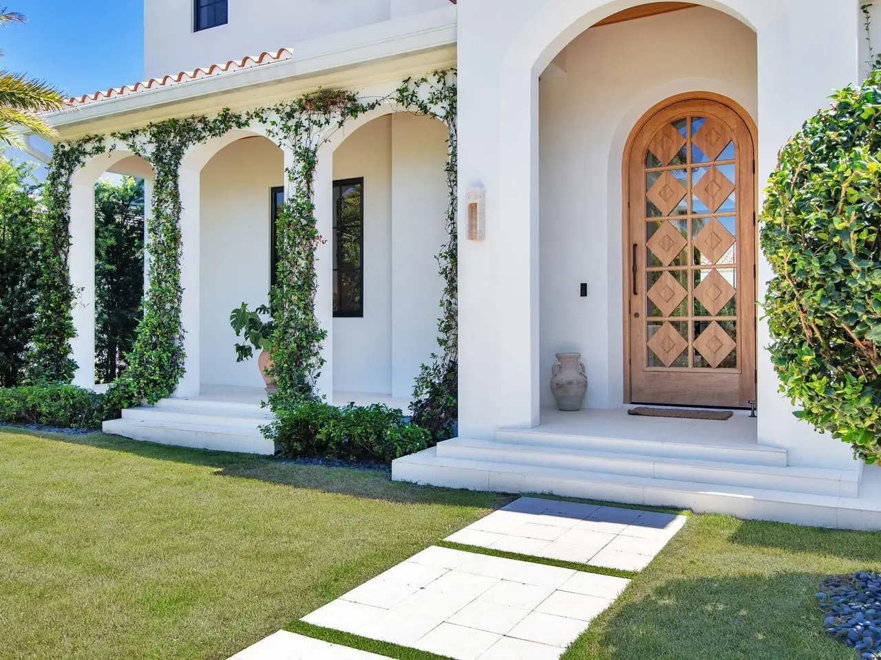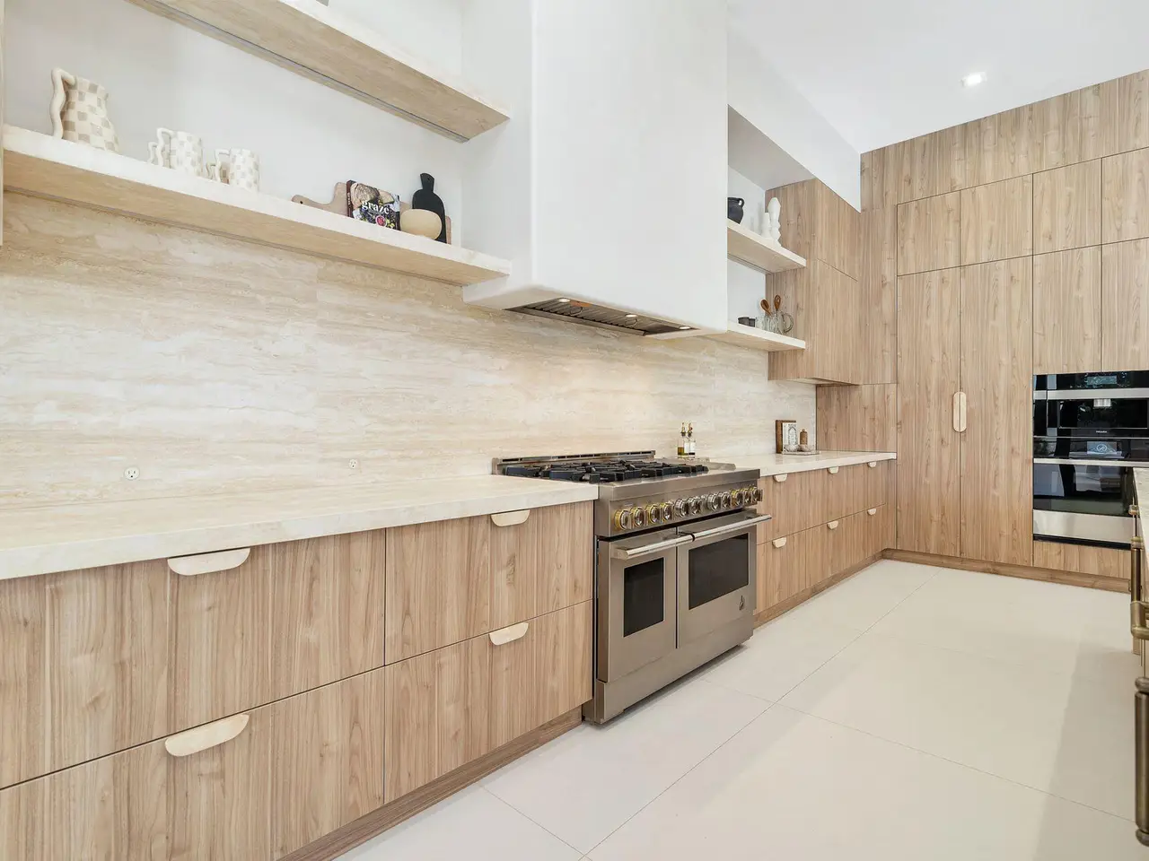 Uber-chic and effortlessly cool, this modern Mediterranean residence combines refined design with a warm, livable feel. Built in 2024 and offered fully furnished, the home features 4 bedrooms, 3 full baths, and 2 powder rooms -- completely turnkey and ready to enjoy. With 12' ceilings on the main level and a dramatic wall of 10' sliding glass doors, the interiors are open, airy, and designed for both everyday living and entertaining. The view from the custom front door carries straight through to the south-facing pool, where a Badu swim jet, covered loggia, summer kitchen, and gym/guest cabana create a true private retreat. Every element of the chef's kitchen has been thoughtfully considered, from the travertine countertops and backsplash to the custom pulls - this kitchen is dreamy!