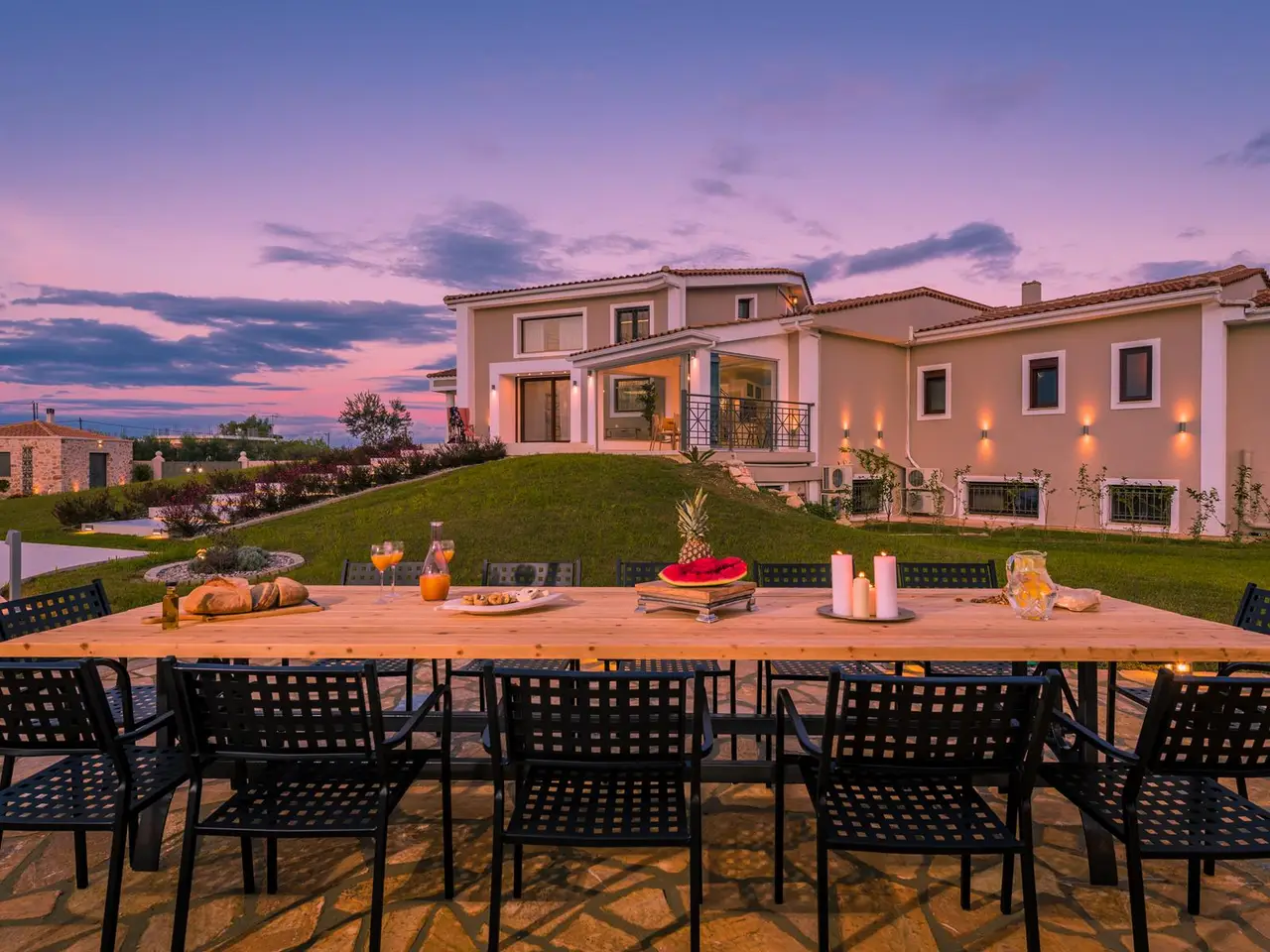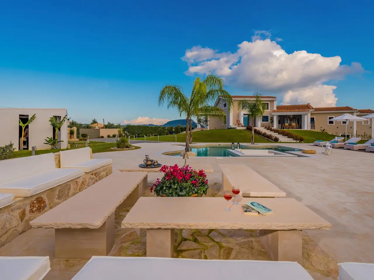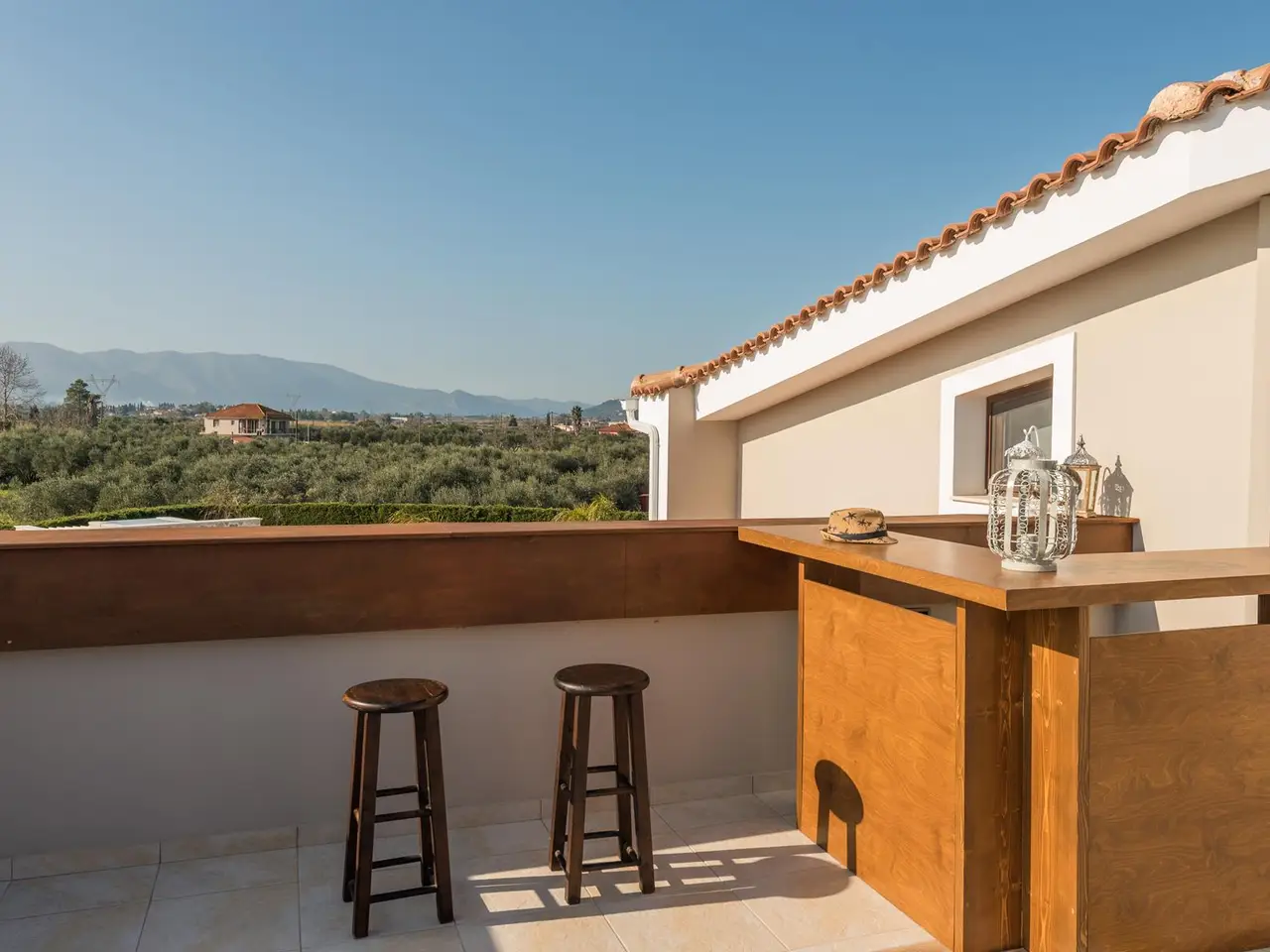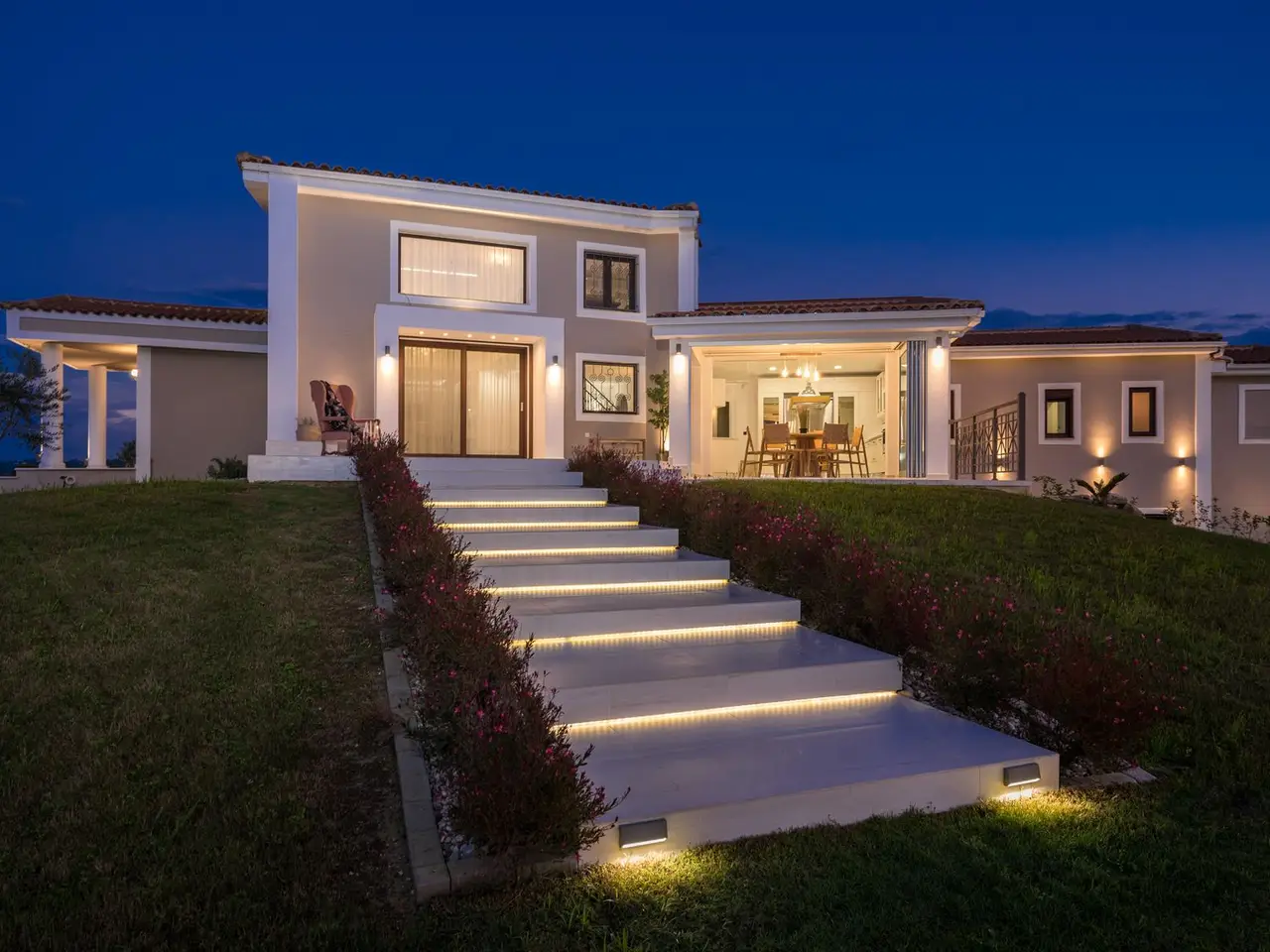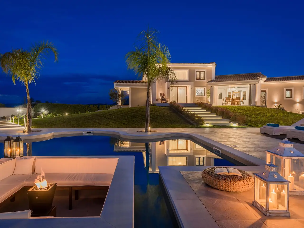 This villa of 320m2 total area is one of the most luxurious Zakynthos villas! It is carved out to be your own personal hideaway, a reminiscent of a Mediterranean oasis nestled amongst fruitful vineyards, surrounded by lush greenery and encapsulating Grecian architectural details which ignite the senses. Indulge yourself in a unique blend of thrilling indoor and outdoor living, perfect for any type of stay, whether you would like to host an intimate gathering or simply unwind in a deep anesthetizing tranquility. Ground Floor: The ground floor of the villa features a grand dining area, which can accommodate the curious palates of 10-12 guests. Also, on the ground floor there is a spacious kitchen, fully-equipped with 2 ovens, microwave, induction hot plates and kitchenware. The kitchen’s illuminant glass partition overlooks the stunning BBQ area. Adjacent there is a commodious, modern sitting area with a comfortable couch and a 75-inch Samsung smart, satellite TV, ideal for relaxing moments. The absolutely luxurious master bedroom features a king-size bed, with His & Hers walk-in closets. The extra refined master bathroom promises exquisite moments of solitude. On the same floor, there are two standard -though impressive – suite bedrooms, also featuring king-size beds or four single ones depending on our guests’ needs, spacious individual bathrooms, an elegant WC, a classy, brand new individual bathroom and a laundry area. Most bedrooms host a balcony, perfect for a much-needed tranquil break. On the first floor: On the first floor there is a roomy mezzanine office equipped with a sophisticated computer and a printer for any business arrangements our guests wish to take care of. There is also an extra king-size bedroom, a sofa-bed and a TV on the sitting area, as well as a reading area and a library ideal for relaxing moments accompanied by a good read that can make everyone feel at ease. A cozy roof garden is our brand new addition to the facilities of the first floor. Guests can enjoy cocktails and drinks under the starry sky.