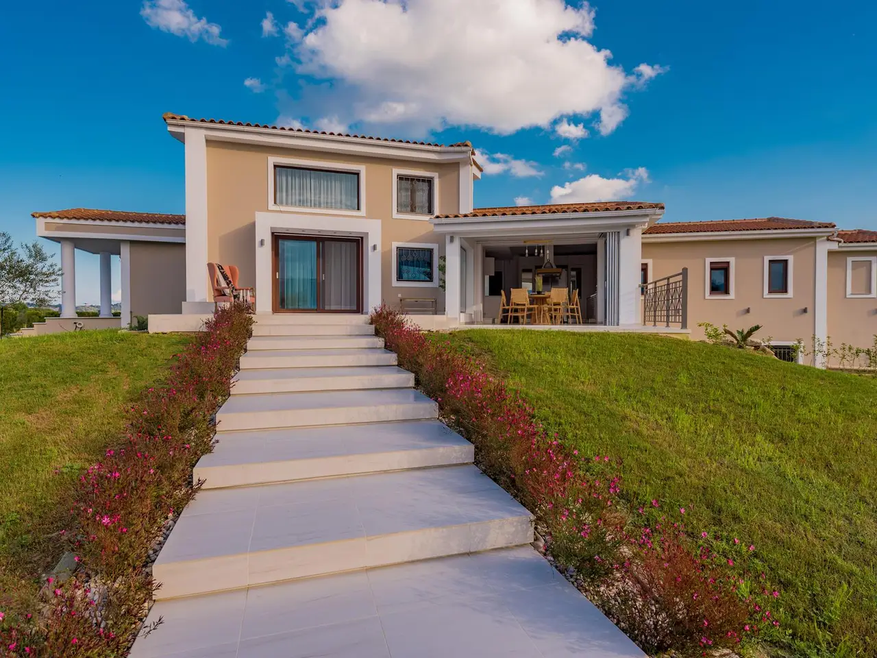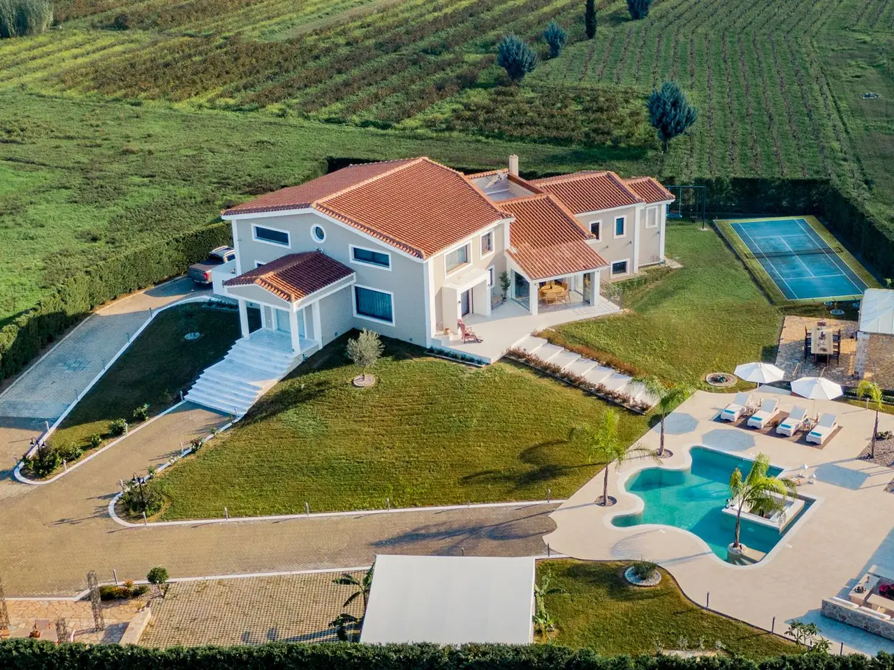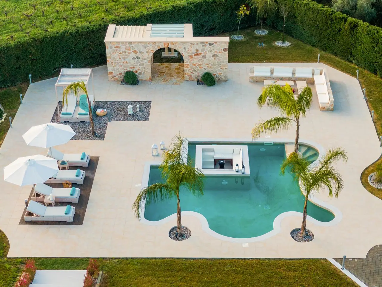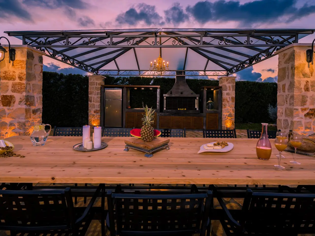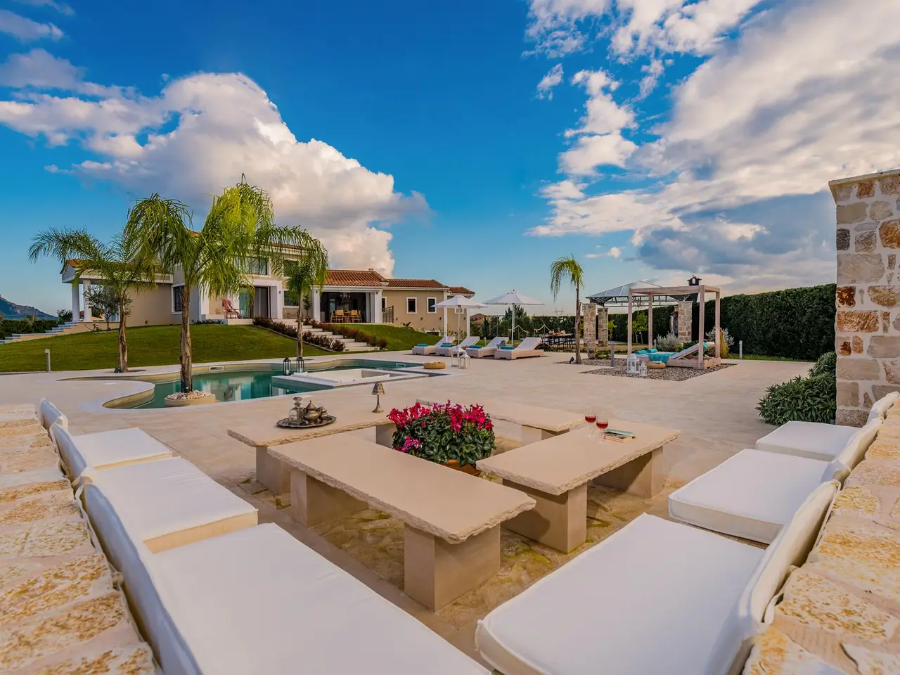 This villa of 320m2 total area is one of the most luxurious Zakynthos villas! It is carved out to be your own personal hideaway, a reminiscent of a Mediterranean oasis nestled amongst fruitful vineyards, surrounded by lush greenery and encapsulating Grecian architectural details which ignite the senses. Indulge yourself in a unique blend of thrilling indoor and outdoor living, perfect for any type of stay, whether you would like to host an intimate gathering or simply unwind in a deep anesthetizing tranquility. Ground Floor: The ground floor of the villa features a grand dining area, which can accommodate the curious palates of 10-12 guests. Also, on the ground floor there is a spacious kitchen, fully-equipped with 2 ovens, microwave, induction hot plates and kitchenware. The kitchen’s illuminant glass partition overlooks the stunning BBQ area. Adjacent there is a commodious, modern sitting area with a comfortable couch and a 75-inch Samsung smart, satellite TV, ideal for relaxing moments. The absolutely luxurious master bedroom features a king-size bed, with His & Hers walk-in closets. The extra refined master bathroom promises exquisite moments of solitude. On the same floor, there are two standard -though impressive – suite bedrooms, also featuring king-size beds or four single ones depending on our guests’ needs, spacious individual bathrooms, an elegant WC, a classy, brand new individual bathroom and a laundry area. Most bedrooms host a balcony, perfect for a much-needed tranquil break. On the first floor: On the first floor there is a roomy mezzanine office equipped with a sophisticated computer and a printer for any business arrangements our guests wish to take care of. There is also an extra king-size bedroom, a sofa-bed and a TV on the sitting area, as well as a reading area and a library ideal for relaxing moments accompanied by a good read that can make everyone feel at ease. A cozy roof garden is our brand new addition to the facilities of the first floor. Guests can enjoy cocktails and drinks under the starry sky.