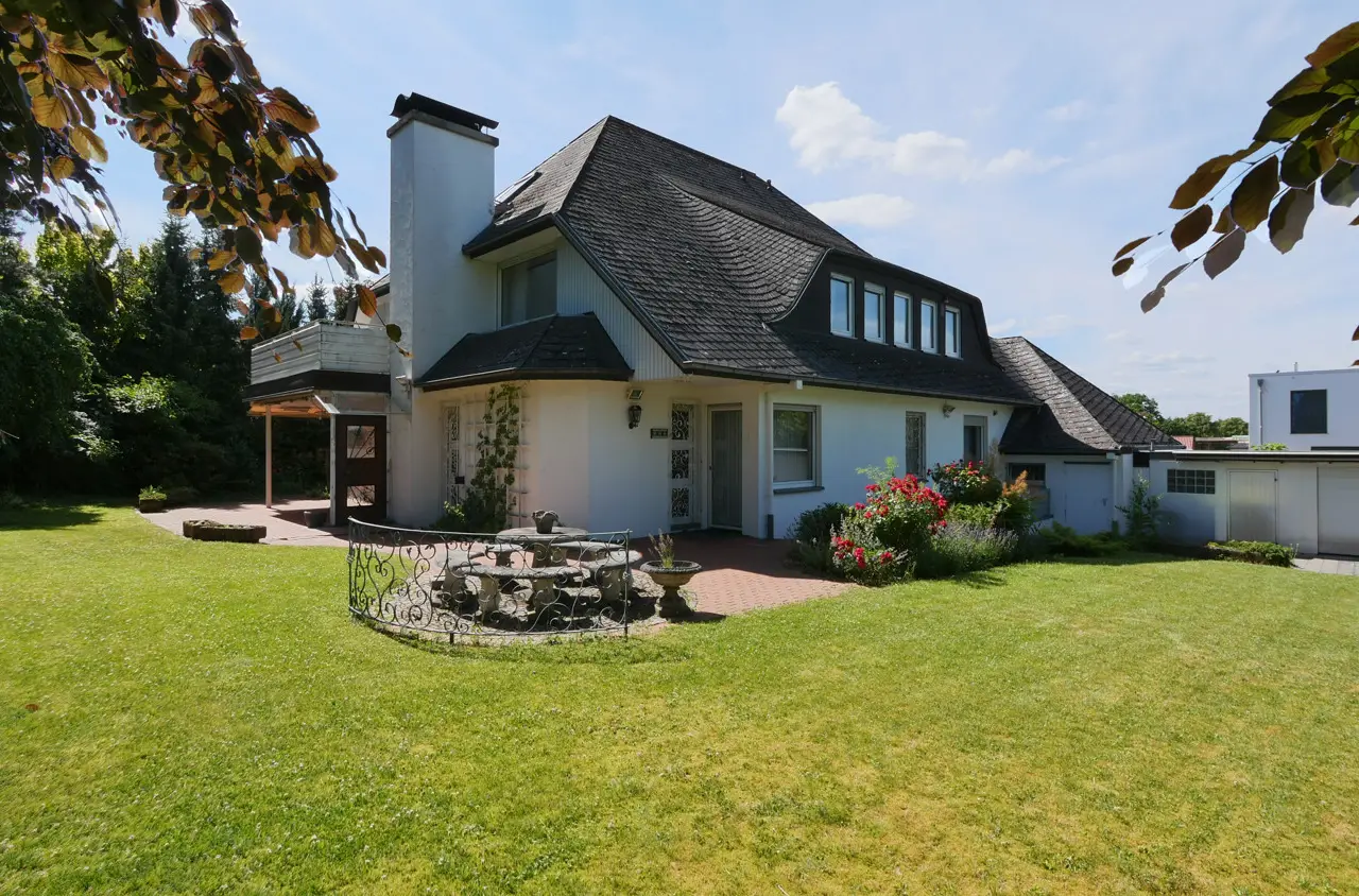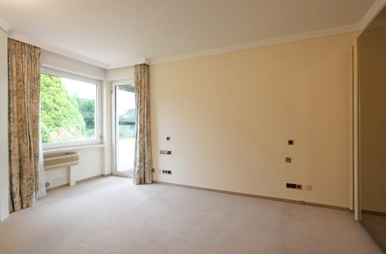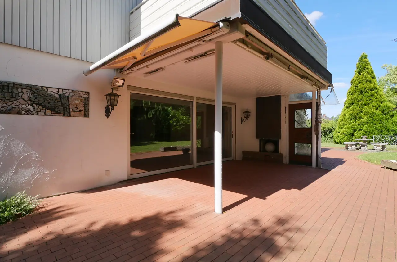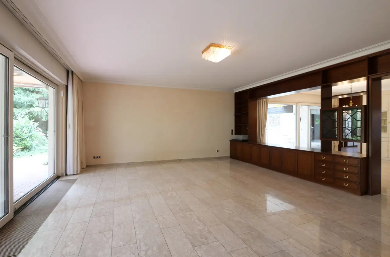 For sale is a spacious and prestigious town villa with a living space of approx. 409 m² and a plot of approx. 1,230 m². Built in 1978, this special property offers a wide range of design options. The house offers you an extraordinary amount of space over two floors - ideal for families, multi-generational living or combining living and working under one roof. In addition to a well-thought-out room layout, the property boasts a fantastic garden, its own wellness area in the basement and two garages. On the first floor, you are greeted by a bright hallway from which all rooms are centrally accessible. The centerpiece is the large dining and living room with direct access to the spacious garden with its three terraces. Directly adjacent is the cozy fireplace room, which provides warmth, especially in the colder months of the year. The separate kitchen has an ideal layout and is complemented by a practical and large pantry. This floor also offers a quiet bedroom, a modern bathroom, a guest WC and a versatile study. The upper floor impresses with its spacious and flexible room layout, which could also be used as a separate residential unit with a separate front door. A hallway leads to a total of two bedrooms. A separate living room with access to the sunny balcony invites you to linger. The kitchen and a utility room offer maximum functionality in everyday life. A bathroom and an additional guest WC round off this floor. From the upper floor, there is direct access to the loft above the garage as well as to the house entrance and the two garages. The top floor has a walk-through room and a spacious attic, which offers plenty of storage space. A very special highlight awaits you in the house, which has a full basement: an in-house wellness area with pool and sauna ensures relaxation and recreation. Further basement rooms offer plenty of storage space and a wide range of design options. Outside, you will find your own spacious garden paradise with several terraces. You also have direct access to the basement and garages via the garden. This special property combines living comfort, peace, space and recreational quality at the highest level. If you are interested, please contact us. We will arrange a viewing appointment with you.