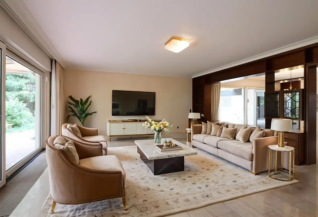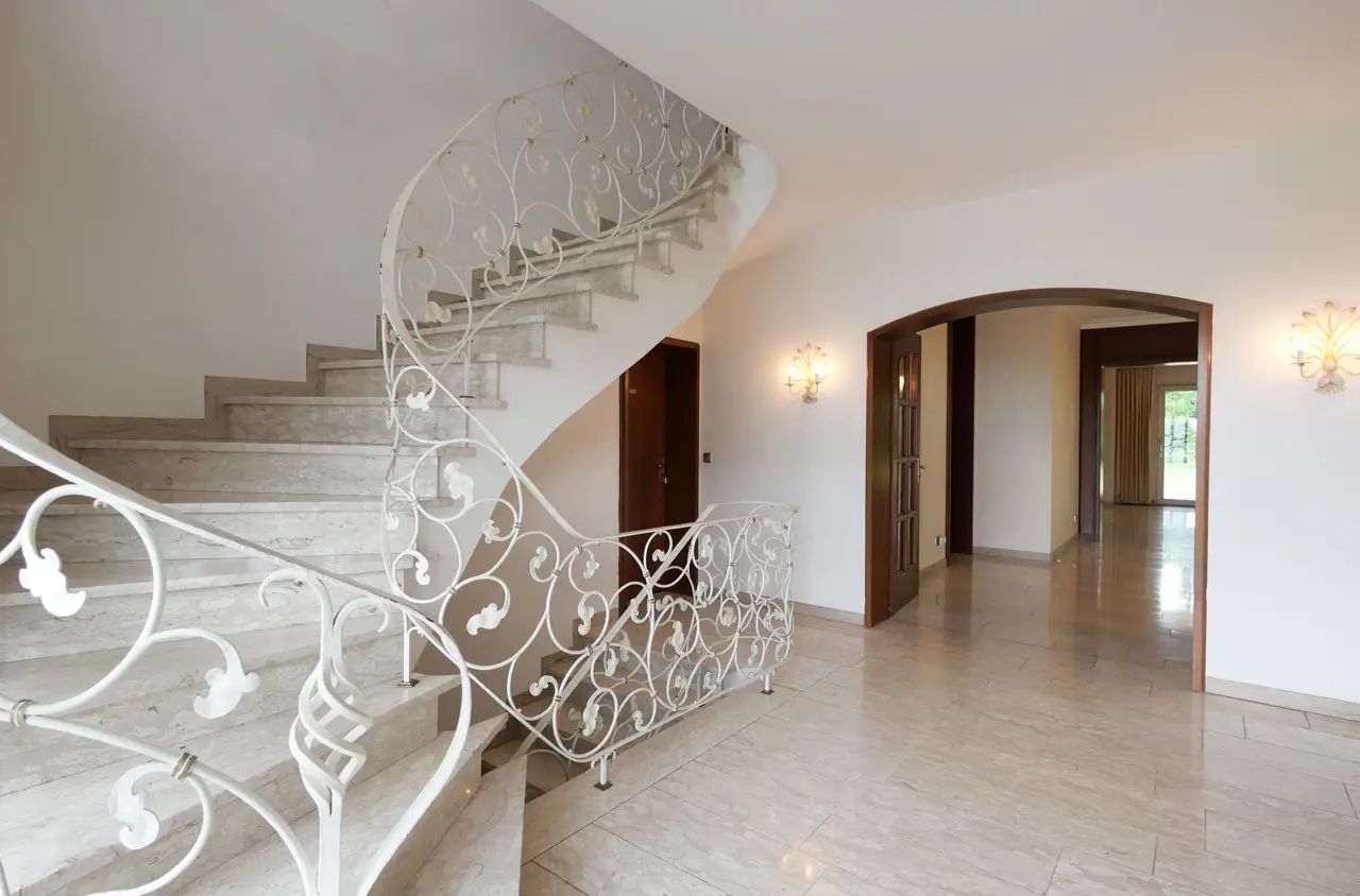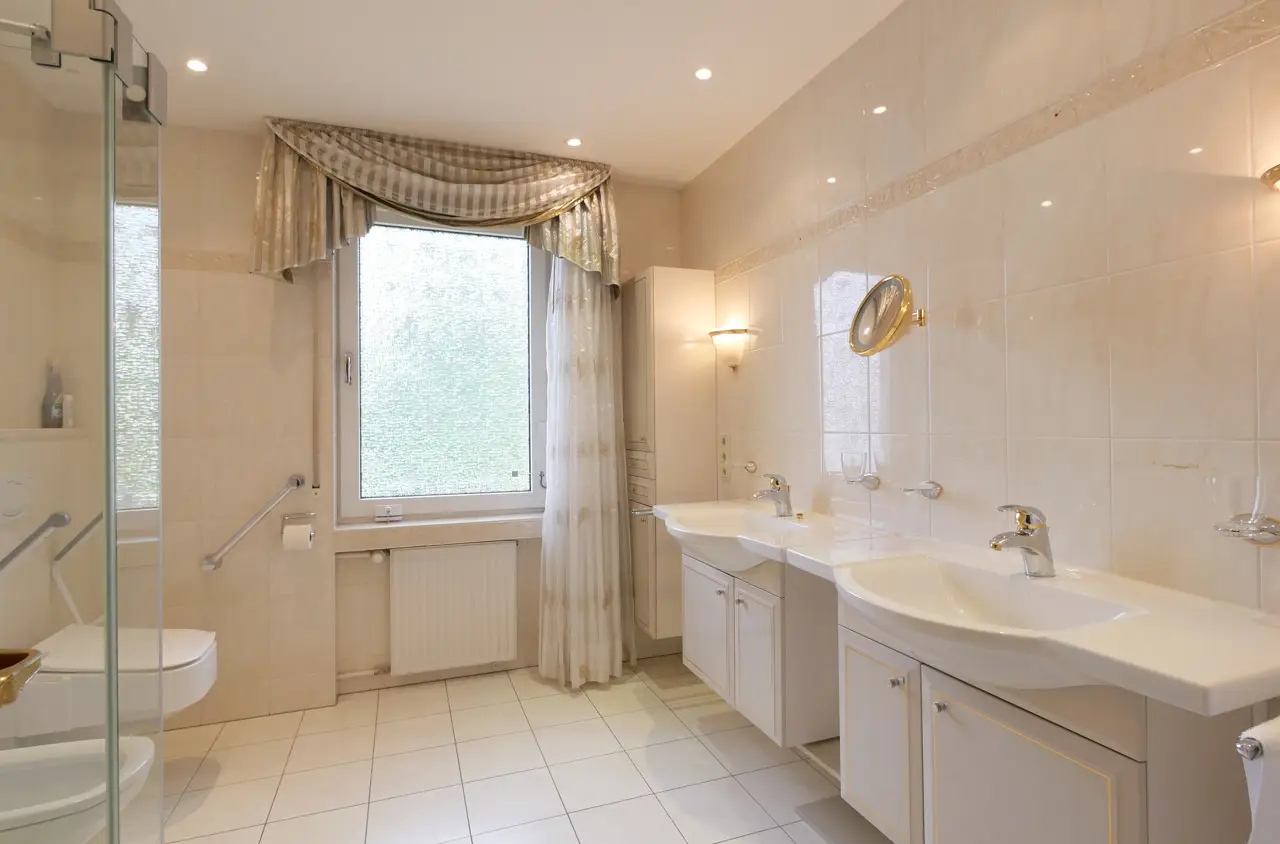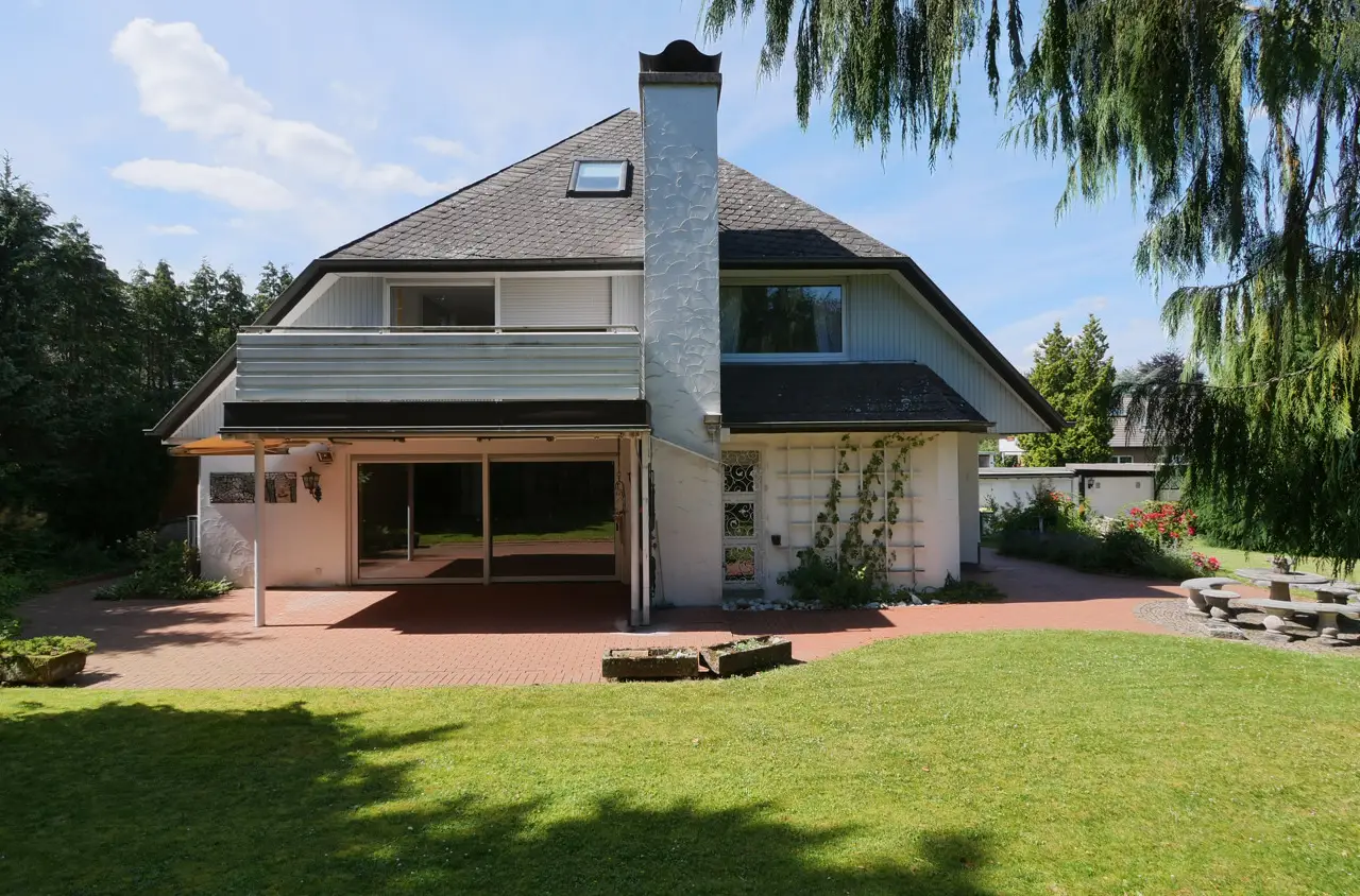 For sale is a spacious and prestigious town villa with a living space of approx. 409 m² and a plot of approx. 1,230 m². Built in 1978, this special property offers a wide range of design options. The house offers you an extraordinary amount of space over two floors - ideal for families, multi-generational living or combining living and working under one roof. In addition to a well-thought-out room layout, the property boasts a fantastic garden, its own wellness area in the basement and two garages. On the first floor, you are greeted by a bright hallway from which all rooms are centrally accessible. The centerpiece is the large dining and living room with direct access to the spacious garden with its three terraces. Directly adjacent is the cozy fireplace room, which provides warmth, especially in the colder months of the year. The separate kitchen has an ideal layout and is complemented by a practical and large pantry. This floor also offers a quiet bedroom, a modern bathroom, a guest WC and a versatile study. The upper floor impresses with its spacious and flexible room layout, which could also be used as a separate residential unit with a separate front door. A hallway leads to a total of two bedrooms. A separate living room with access to the sunny balcony invites you to linger. The kitchen and a utility room offer maximum functionality in everyday life. A bathroom and an additional guest WC round off this floor. From the upper floor, there is direct access to the loft above the garage as well as to the house entrance and the two garages. The top floor has a walk-through room and a spacious attic, which offers plenty of storage space. A very special highlight awaits you in the house, which has a full basement: an in-house wellness area with pool and sauna ensures relaxation and recreation. Further basement rooms offer plenty of storage space and a wide range of design options. Outside, you will find your own spacious garden paradise with several terraces. You also have direct access to the basement and garages via the garden. This special property combines living comfort, peace, space and recreational quality at the highest level. If you are interested, please contact us. We will arrange a viewing appointment with you.