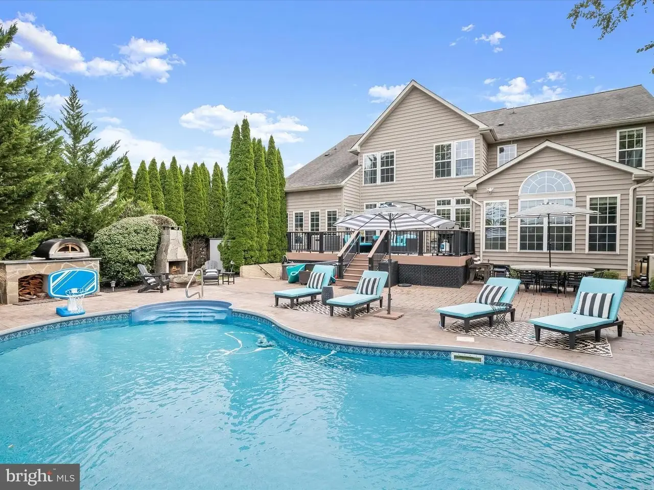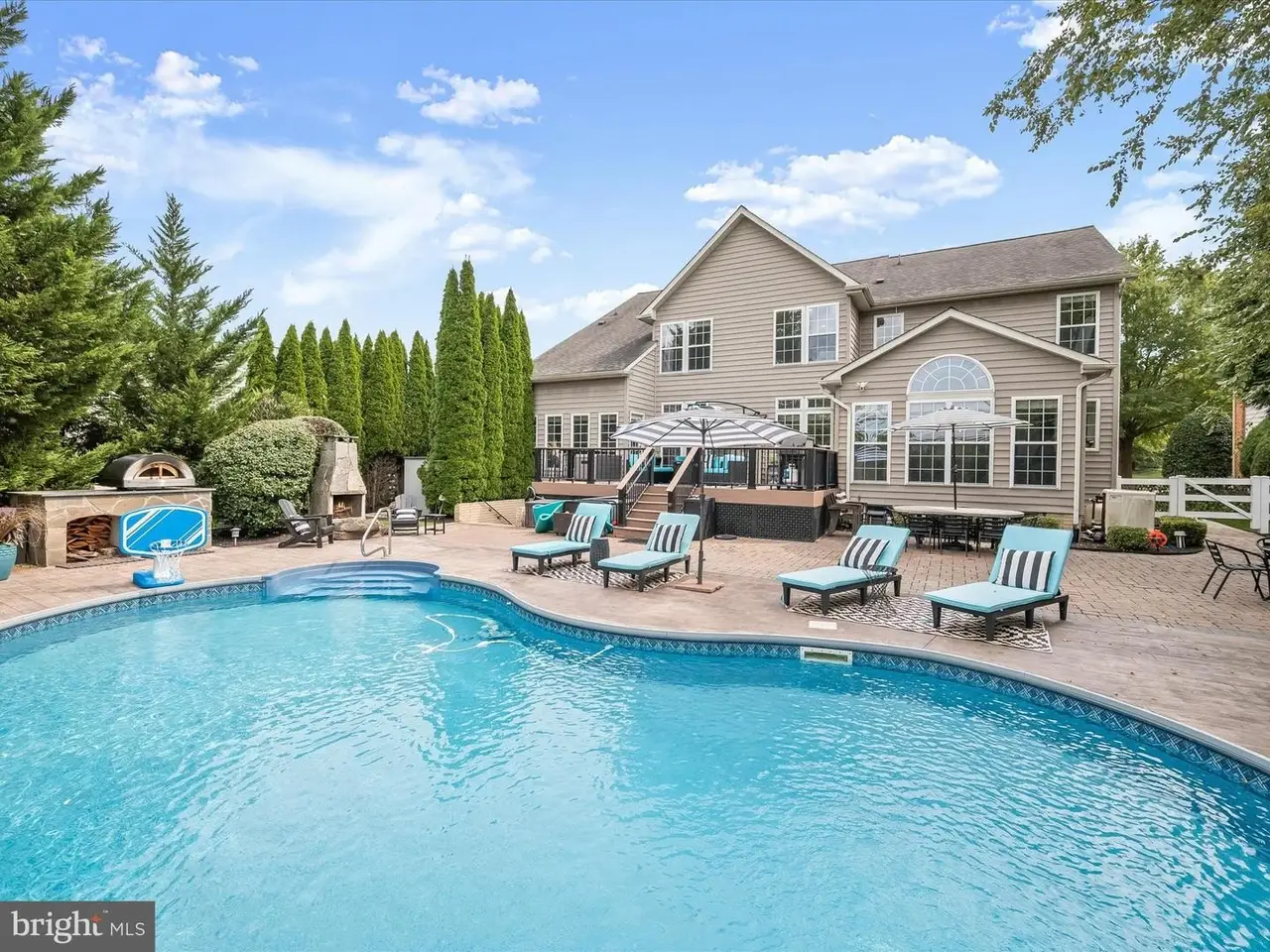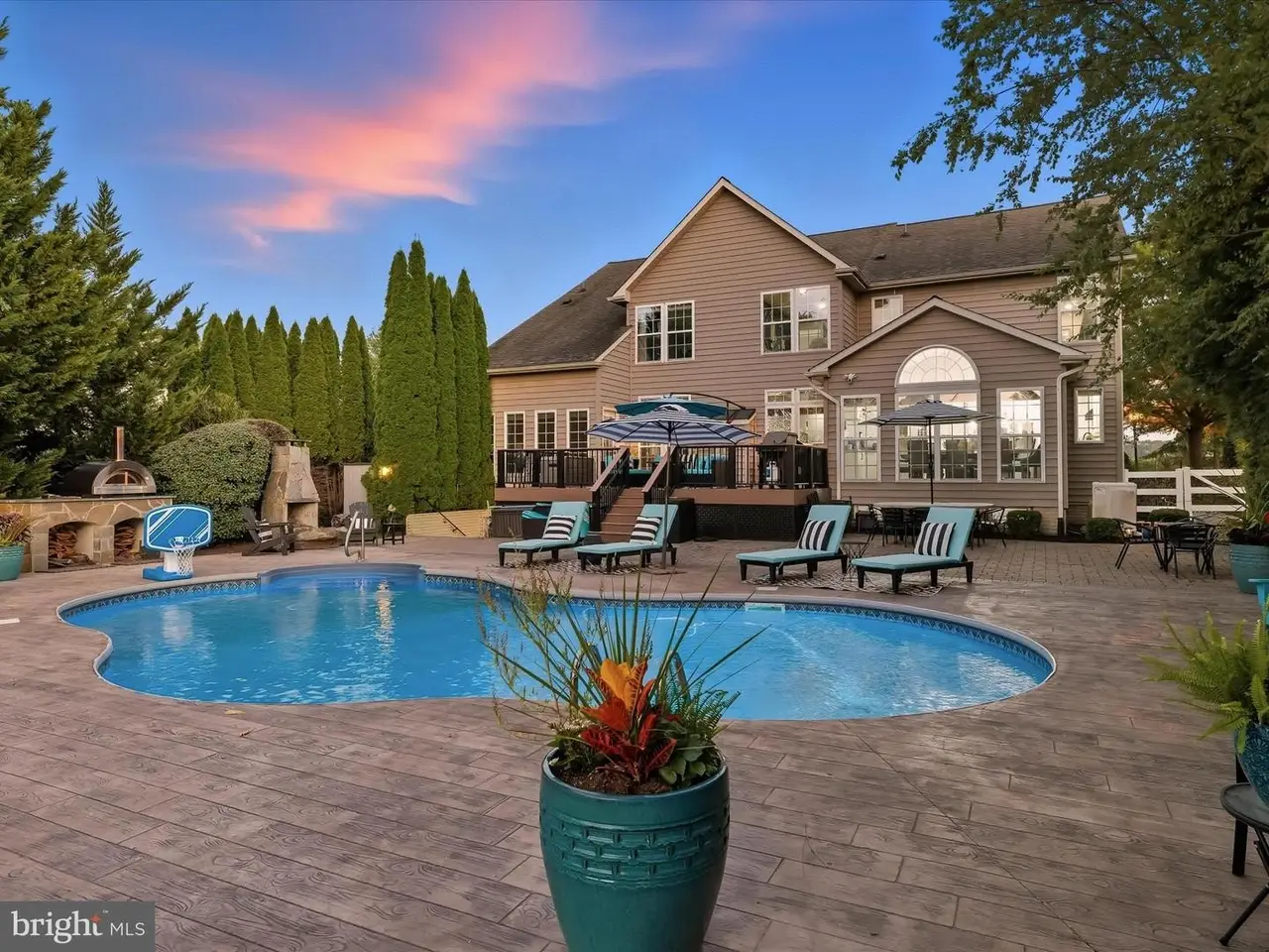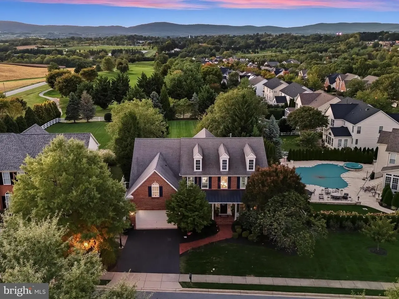 This gracious home was designed to promote relaxation and effortless entertaining and was custom re-designed by All Together Design, LLC Interiors. Located in beautiful Middletown, Maryland with mountain views from the front and back of the home, this home was landscaped by Gardens of Eden and features beautiful mature trees all around the property providing a private backyard oasis! Situated on one half acre of fully fenced in yard with two gates on a popular golf course, this home offers resort style living with a heated in ground pool, large stamped concrete patio, generous Wolfe Deck, stone fireplace, and a custom industrial pizza oven on a stone and leathered granite stand. The home sits on the largest lot in the Glenbrook community and is a short walk to award winning schools, restaurants and shopping on the fully lighted sidewalks that are all throughout the neighborhood! Glenbrook features three play grounds, a soccer field, walking trails, and more! The home features gleaming new wide plank solid Bella hardwood floors throughout the main level, second floor hallway and office. A custom designed wrought iron staircase greets you in the large foyer. The lower level features a fully finished basement complete with a home gym with custom rubber flooring, a newly renovated full bathroom, a large open area with brand new LVP wide plank flooring, a bedroom, a beautiful gas fireplace, a built in beverage station with dual wine fridges, and a walk up basement. The main floor features a newly renovated gourmet kitchen complete with stainless steel Bosch appliances including a custom designed island with built-in drawer microwave. A generous walk-in pantry with solid wood shelving can store everything you need to entertain, while the custom beverage station with dual zone temperature control LED lighted fridge, matching custom cut Dolomite counter tops, a Ruvati sink and work station complete with cutting board, dish rack, and fruit basket and a convenient and stunning pot filler on Italian marble herringbone backsplash located over the 6 burner gas cooktop, round out this beautiful kitchen. This home won't last long!