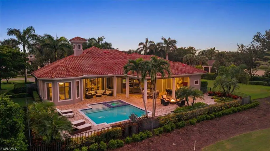 Exquisitely designed with soaring, coffered ceilings as you enter the double, glass paned front doors to the beautiful foyer offering stunning views of the craftsmanship details to the fabulous exterior views overlooking your lanai, pool/spa and to the golf course and lake beyond. Inside, you will be immersed in luxury as you enjoy a gas fireplace flanking the formal living room to the fabulous kitchen detailed with an abundance of workspace, island, and Wolf appliances and overlooking the breakfast nook and family room with zero corner sliders leading to the fantastic lanai. There, you will appreciate the built in outdoor kitchen, seating area and the lovely, coffered ceiling. The pool/spa and gas fire pit are open for wonderful starry nights and fabulous entertaining. With 4 bedrooms, all ensuite, den and media room, you and your family and guests will appreciate the privacy of personal spaces and the 3-car garage with a portico allows plenty of spaces for your treasured vehicles.