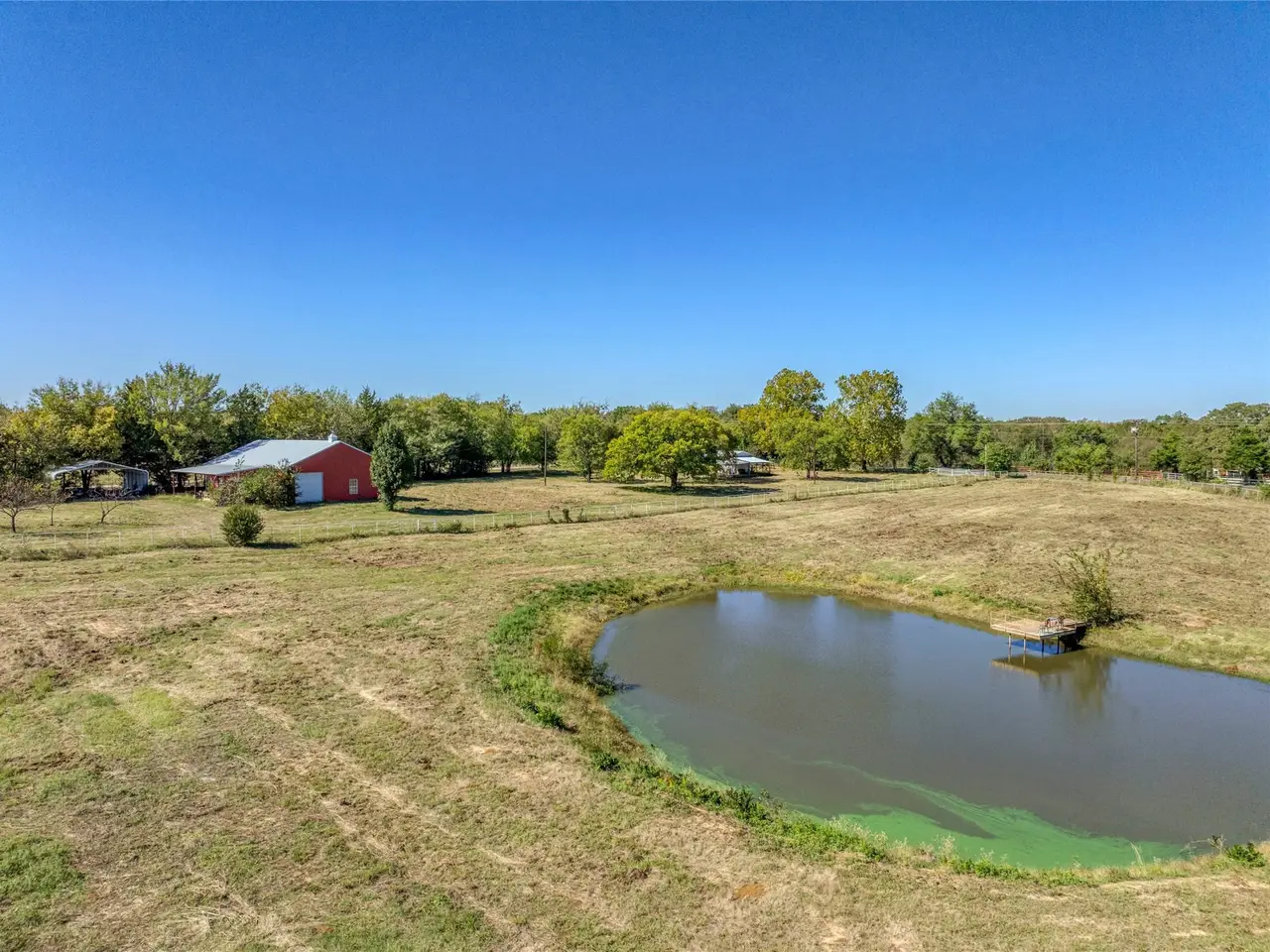 Endless opportunities await on this ideal North Texas acreage! This property offers the perfect blend of functionality, comfort, and wide-open space. A sturdy metal fence line encloses the land, providing privacy and security while showcasing the beautiful stock pond with dock, perfect for fishing, relaxing, or simply taking in the peaceful countryside views. At the heart of the property sits a versatile barndominium, featuring 2 bedrooms and 2 bathrooms, an inviting eat-in kitchen, and an open floor plan that seamlessly connects to the spacious living area. Attached is a massive shop space, ideal for hobbies, equipment storage, or future expansion.