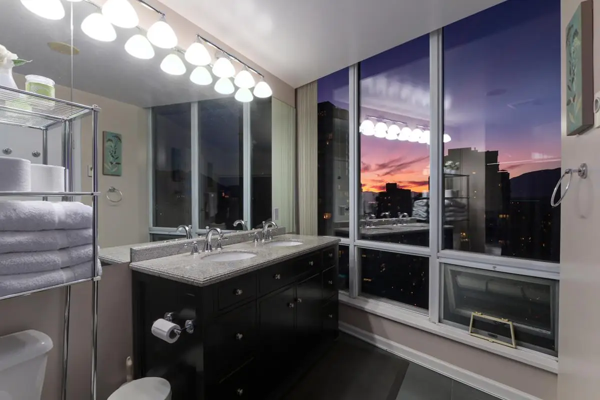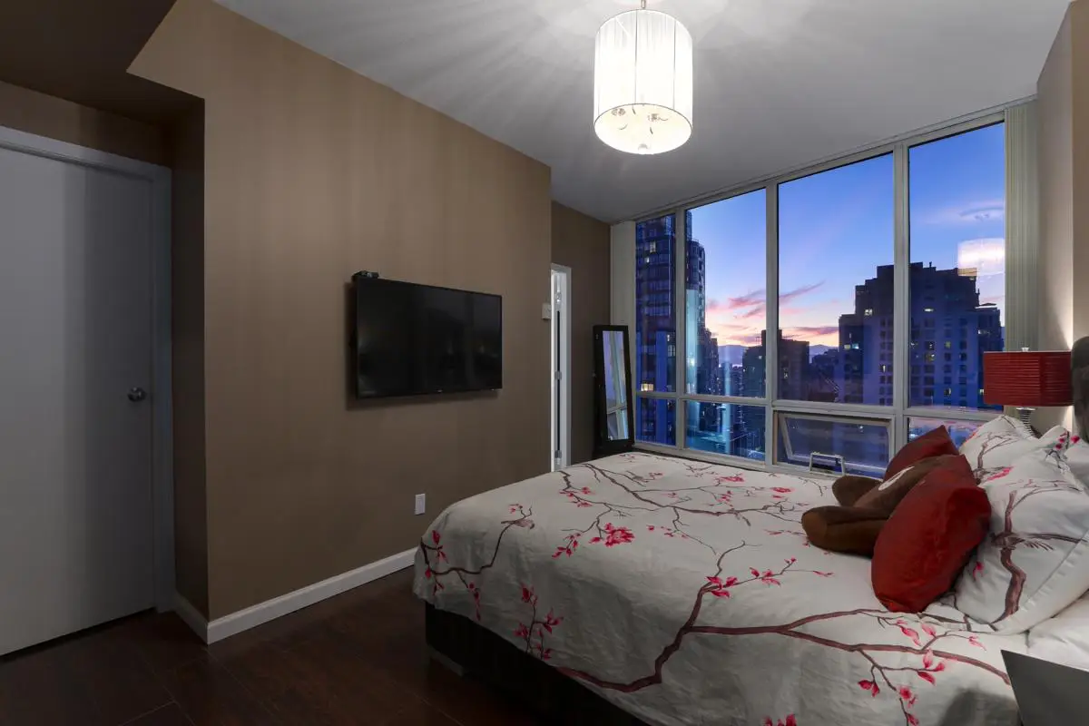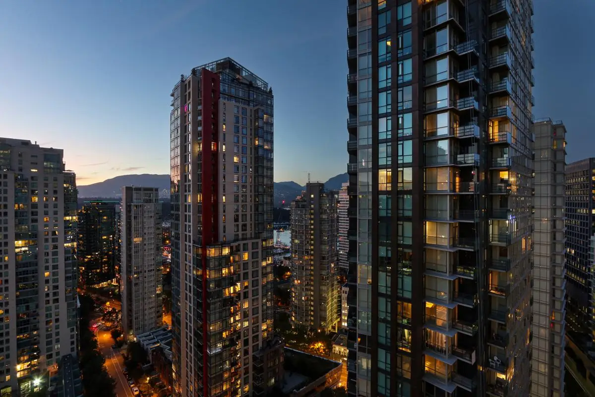 A rare Coal Harbour four-bedroom sub-penthouse with a north, northeast, and east views of Vancouver, partial mountain and water.