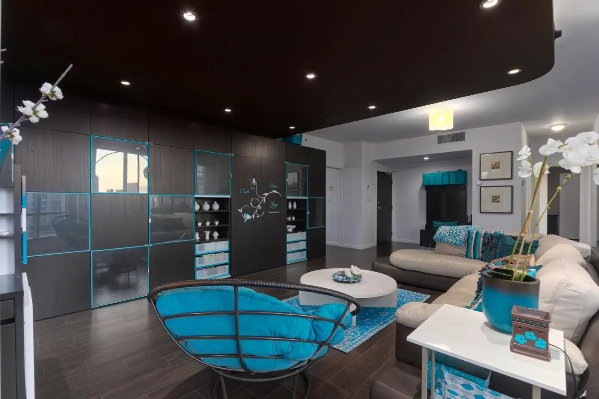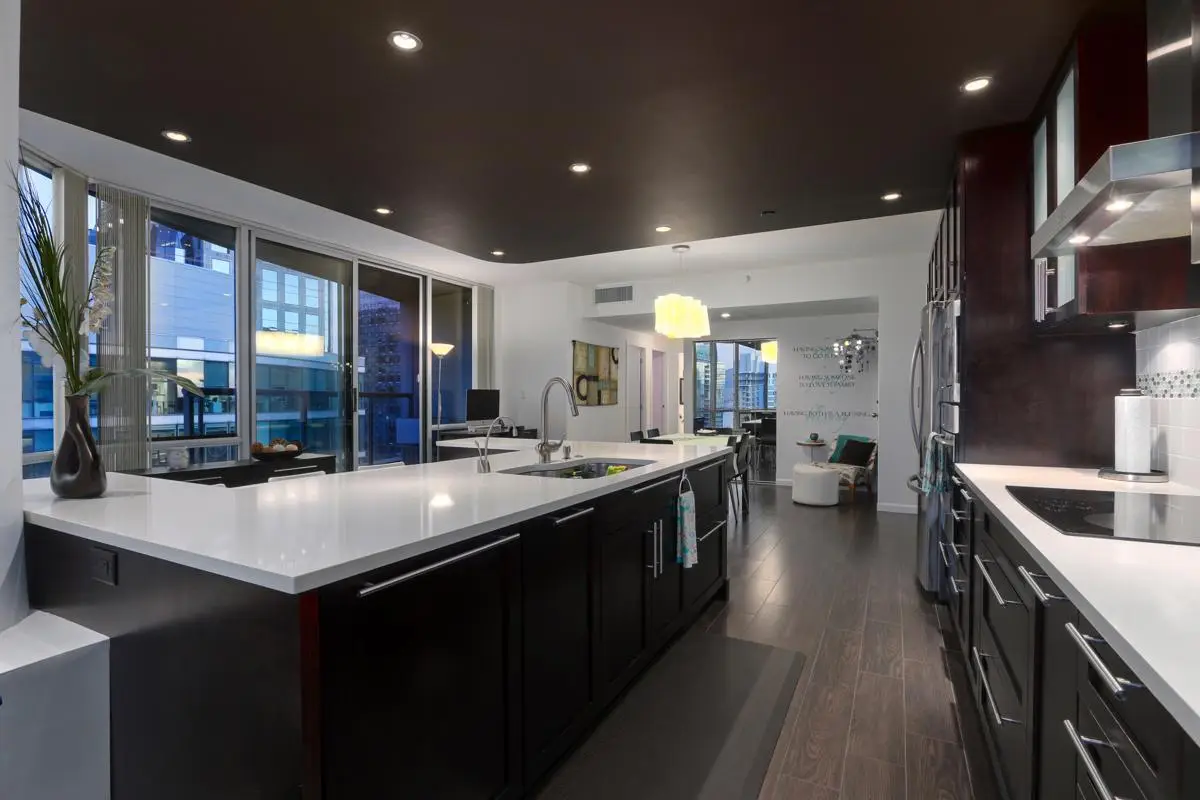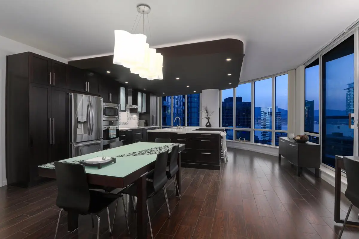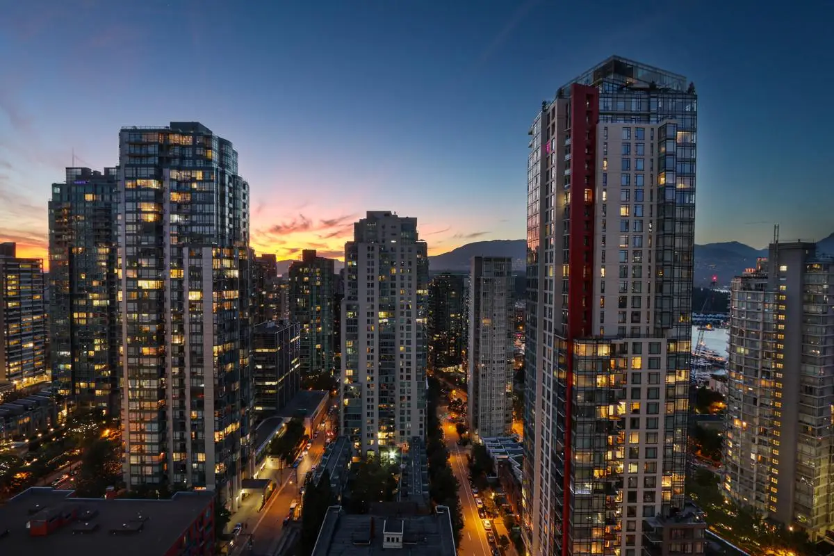 A rare Coal Harbour four-bedroom sub-penthouse with a north, northeast, and east views of Vancouver, partial mountain and water.