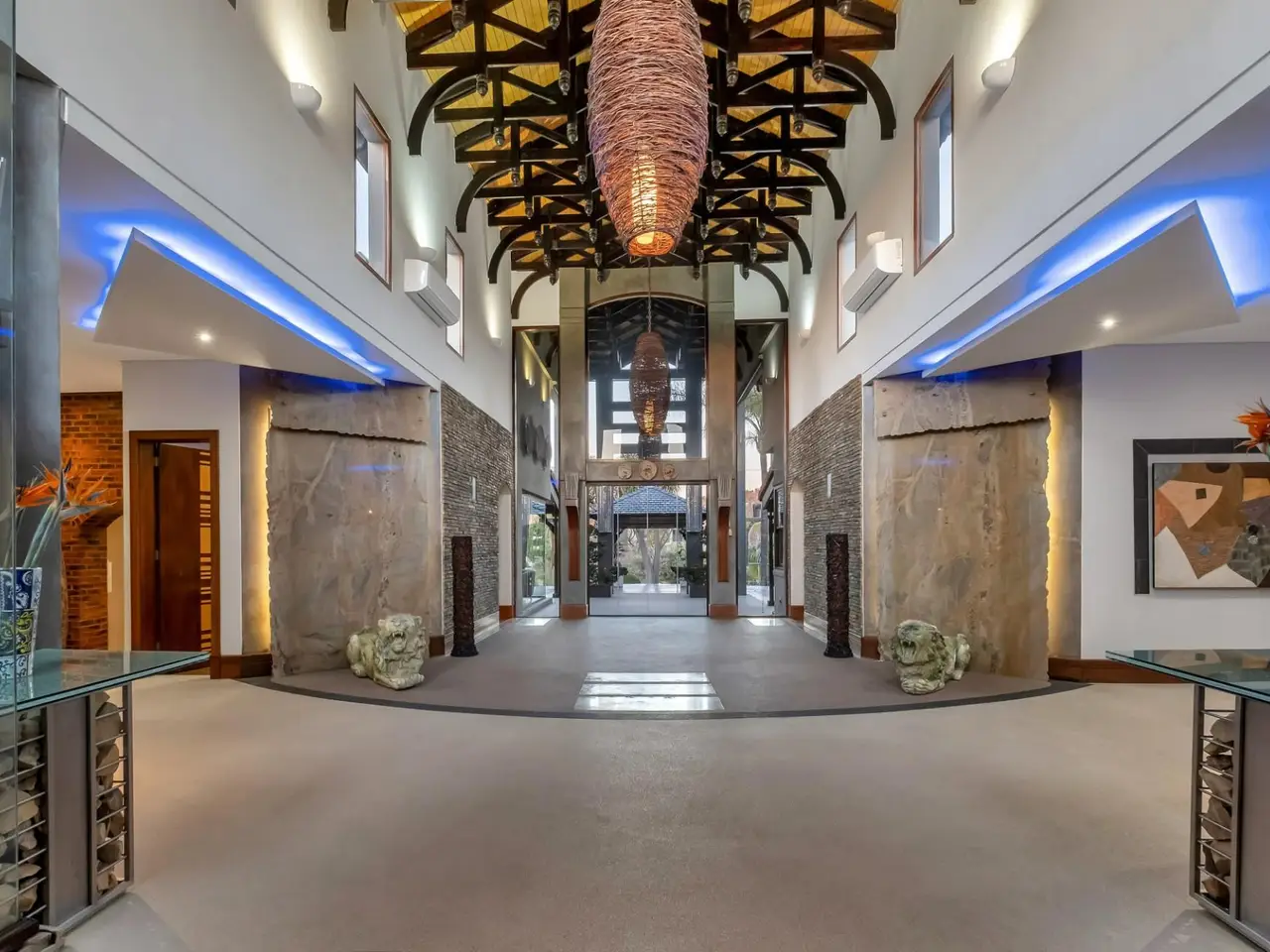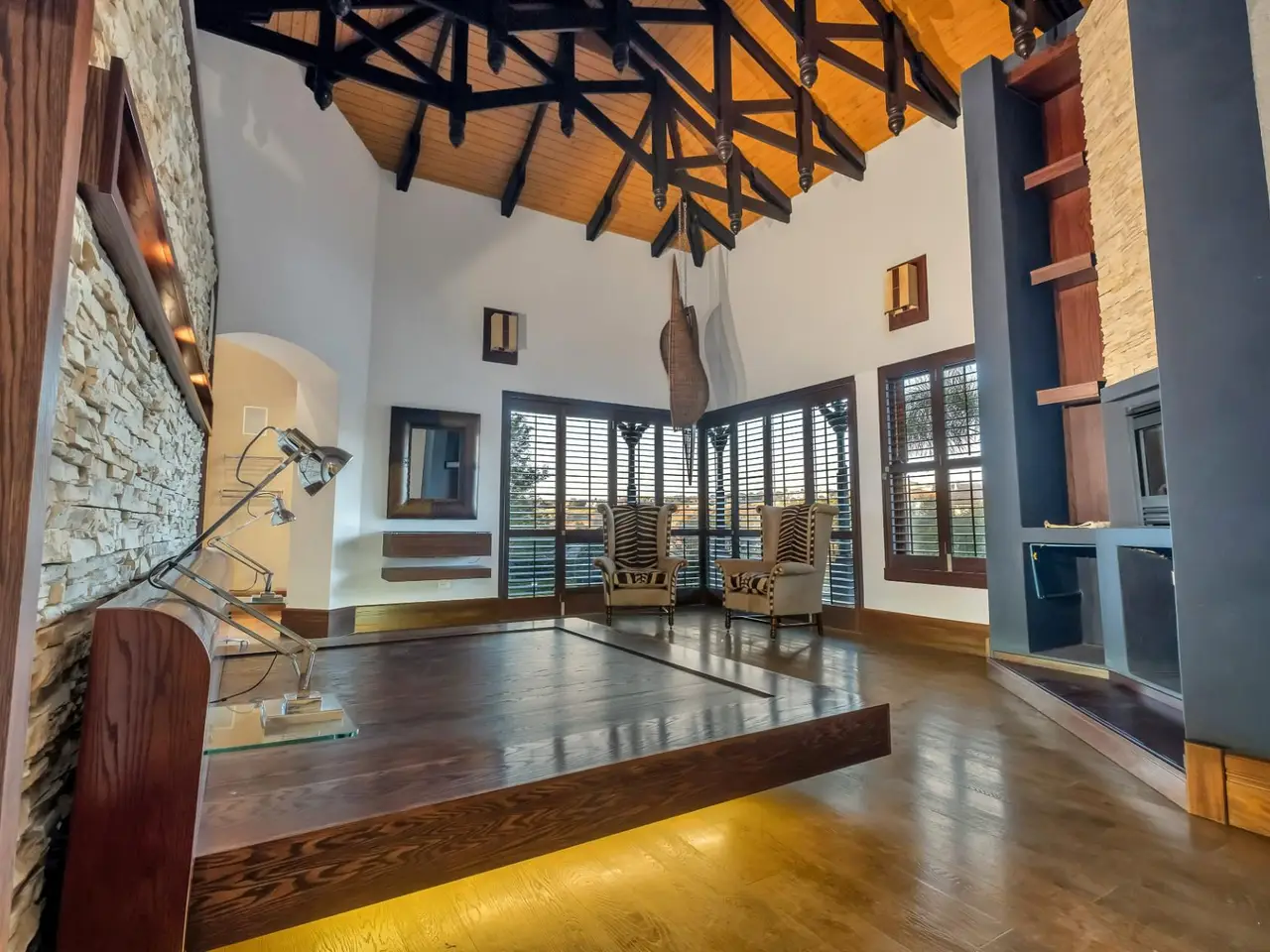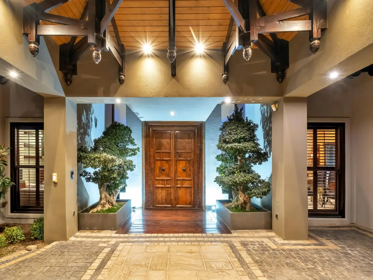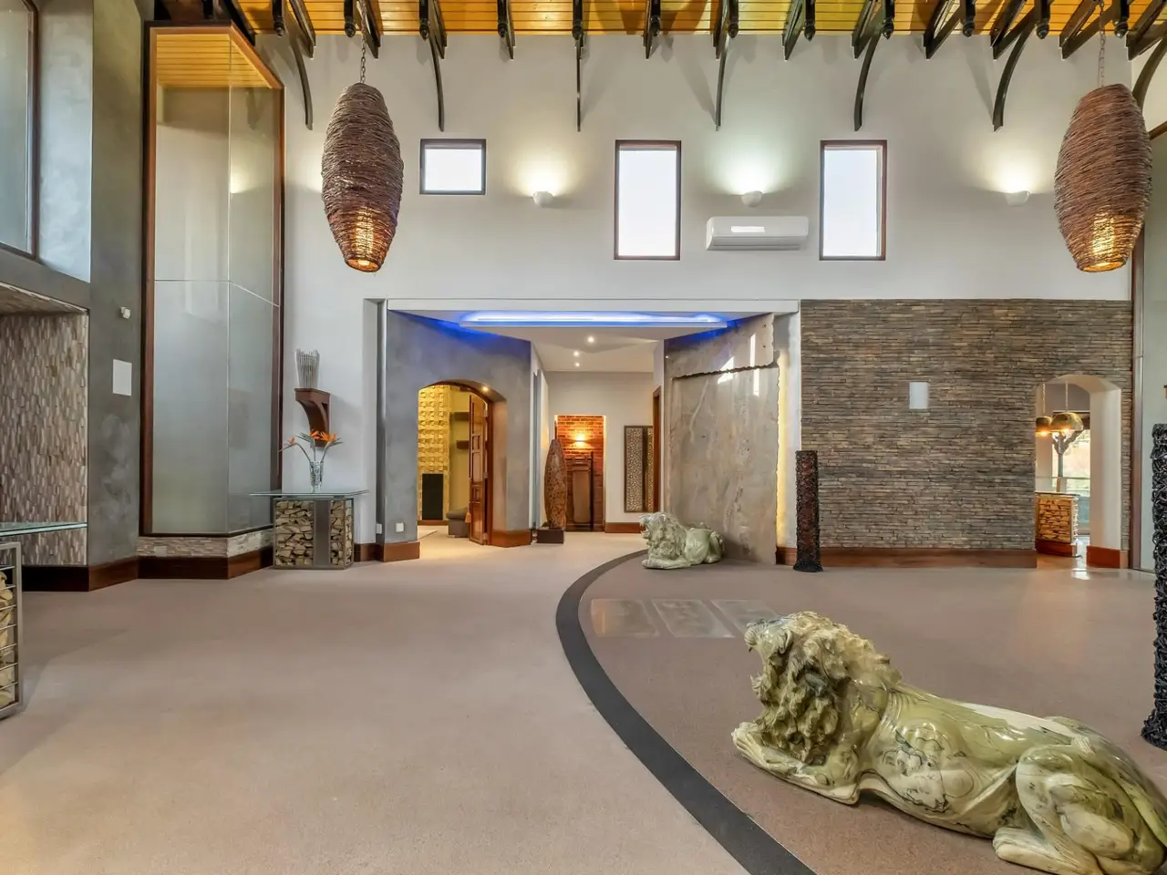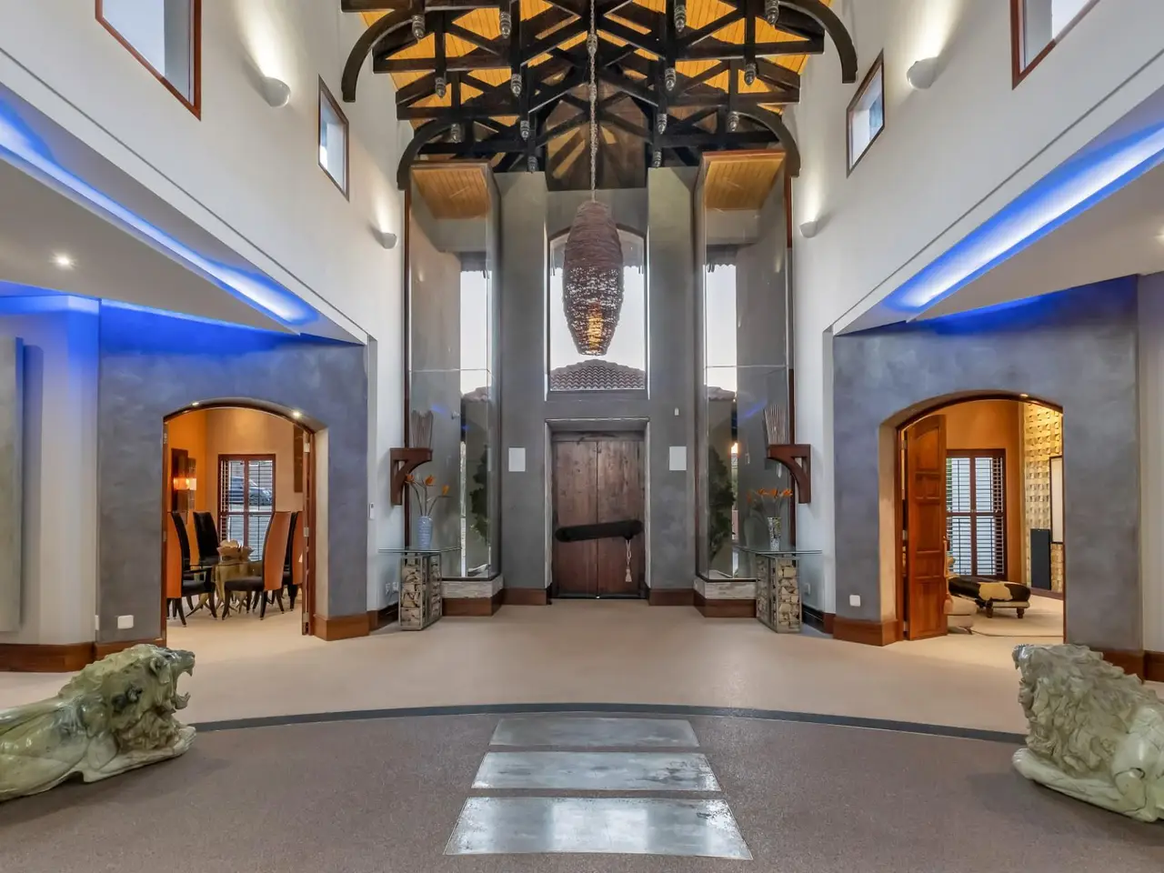 Double-volume entrance with dark wood beams